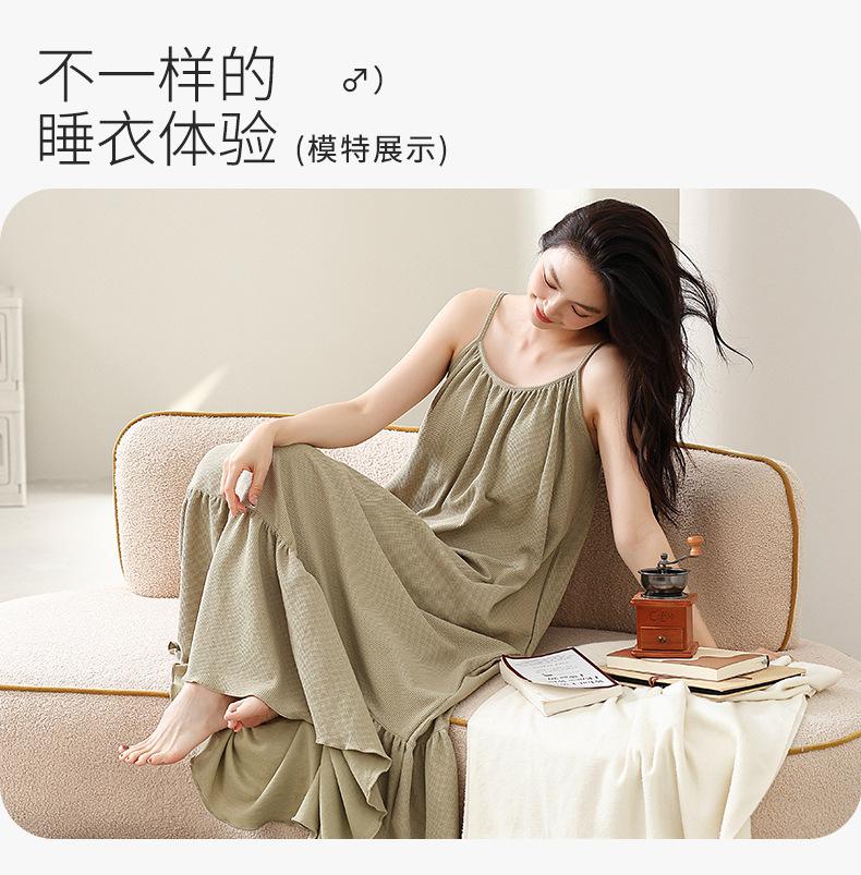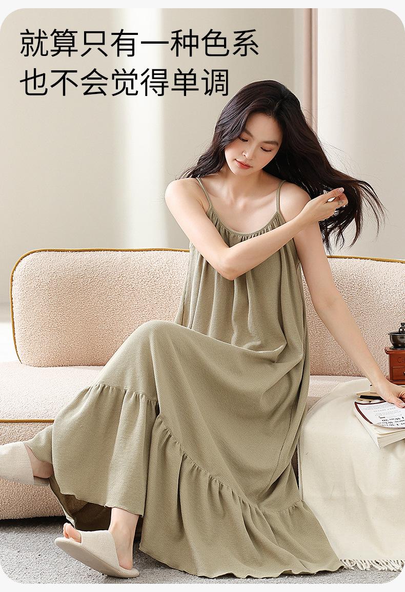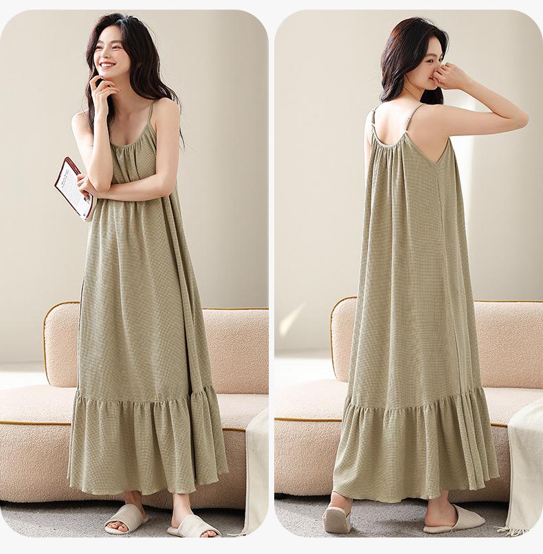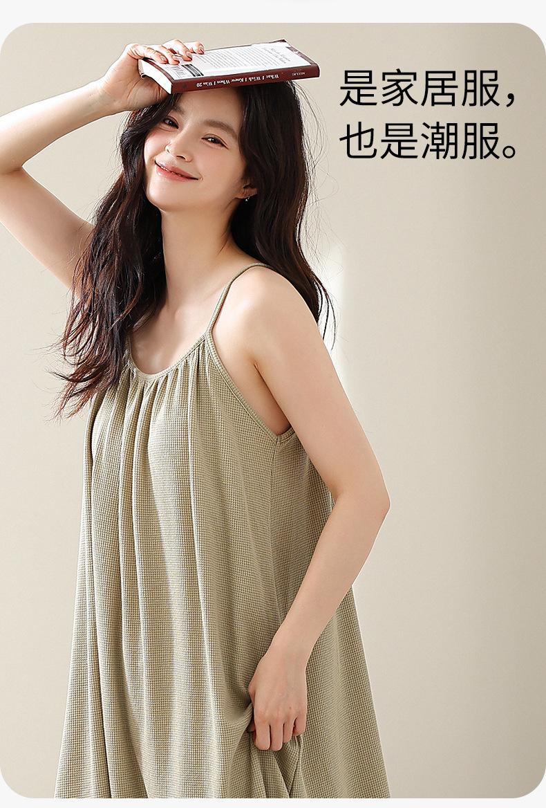Pijama de Verano Waffle Algodón Puro Manga Corta Camisón con Tirantes para Mujer Falda Midi de Alta Gama Estilo Dulce de Verano Ropa para el Hogar