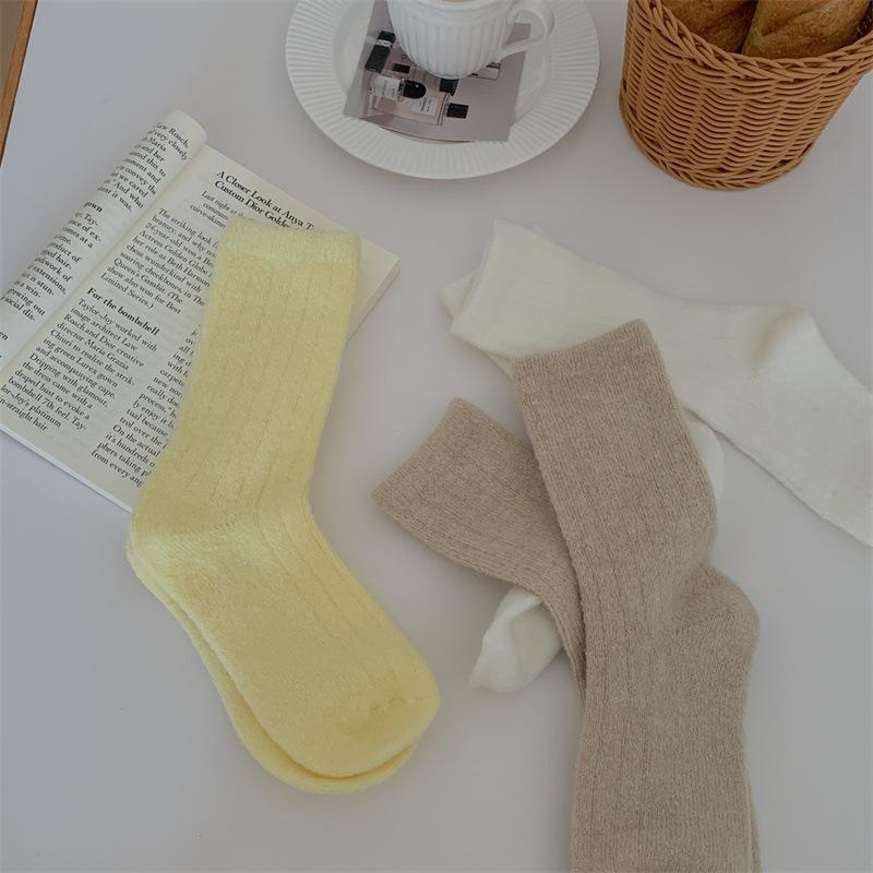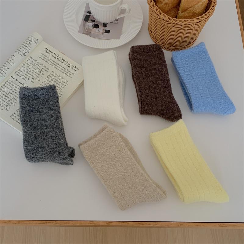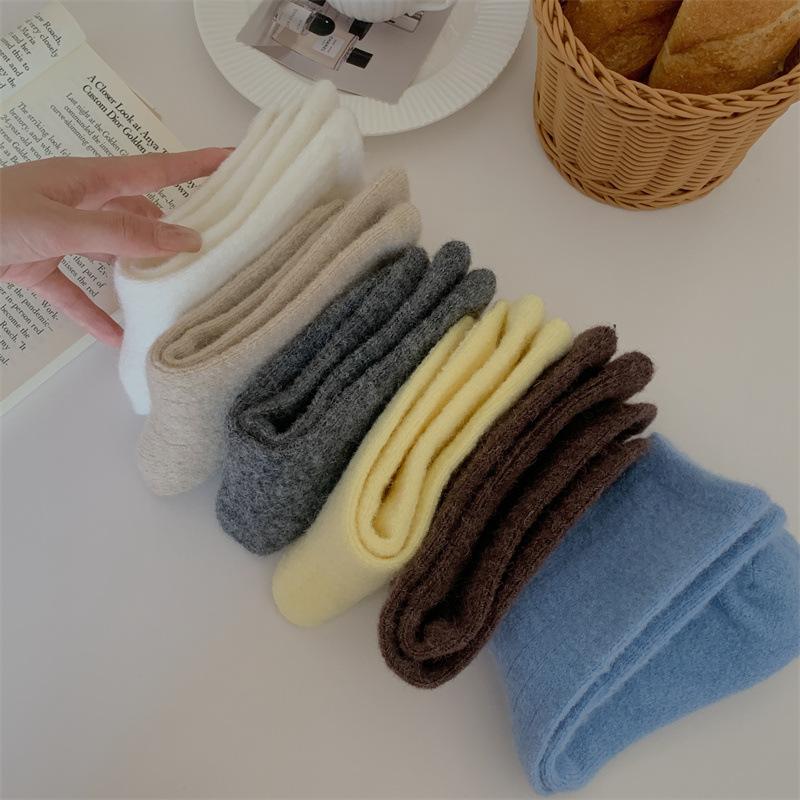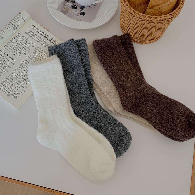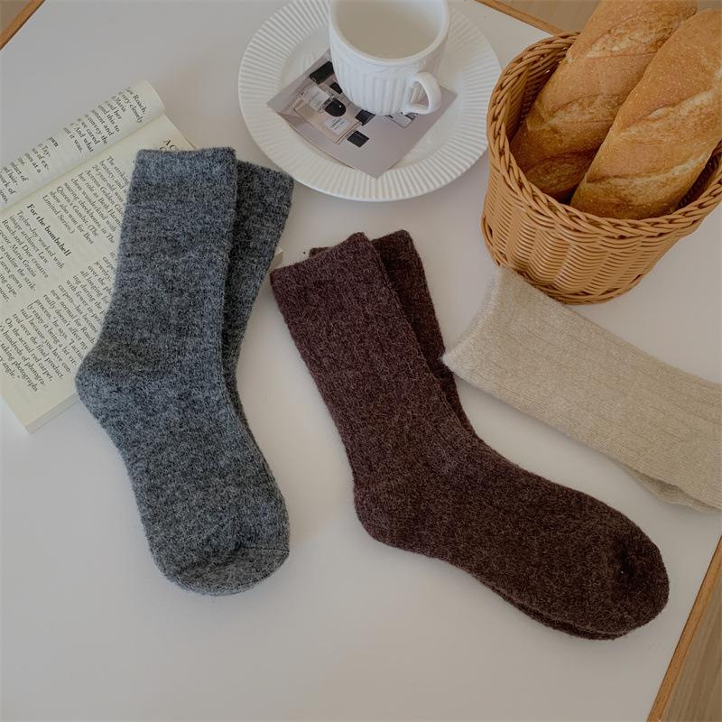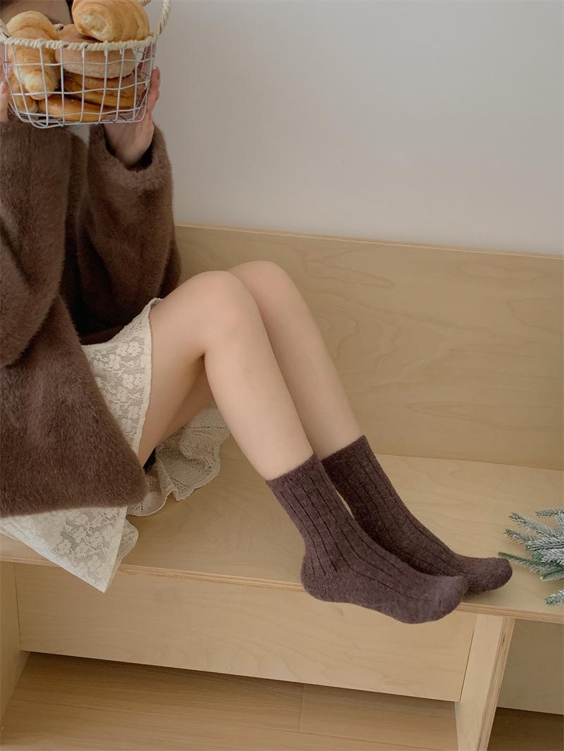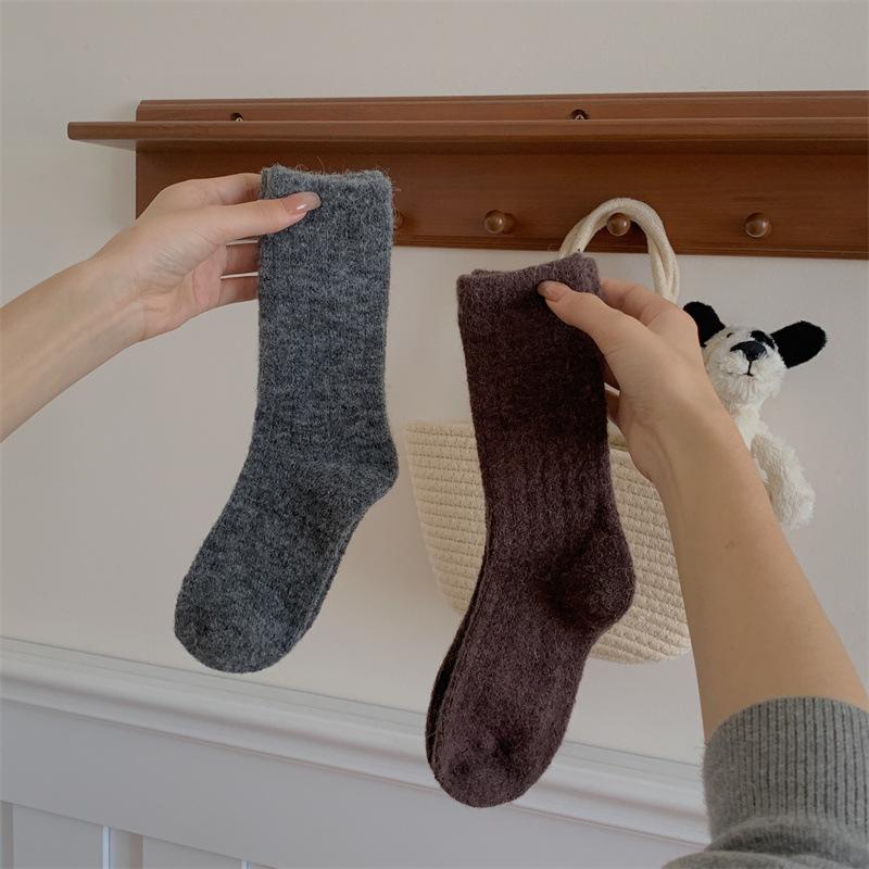 Otoño e Invierno tejido cálido grueso color sólido canalé media pantorrilla mohair calcetines de lana para mujer marrón estilo japonés calcetines de felpa