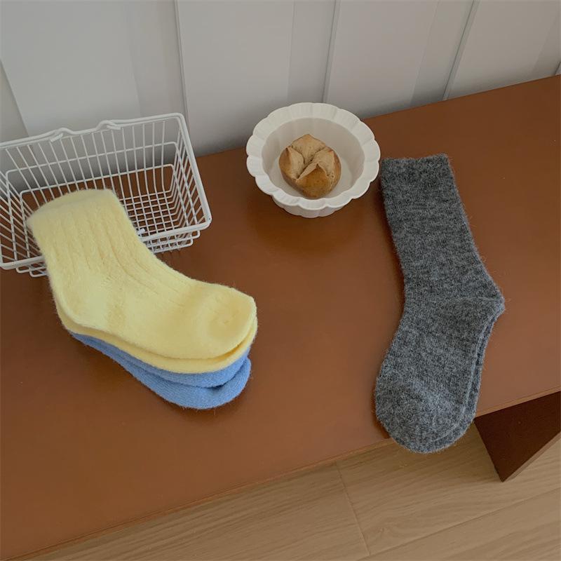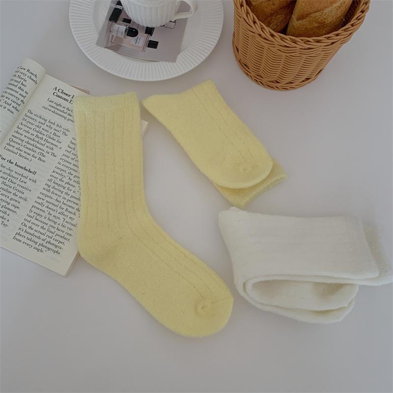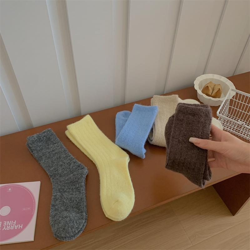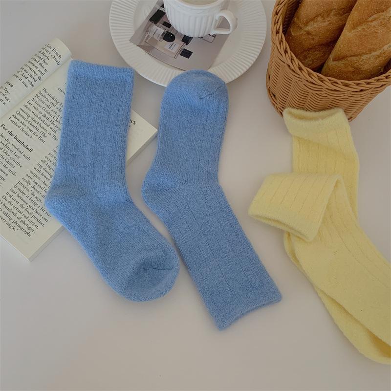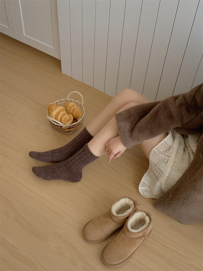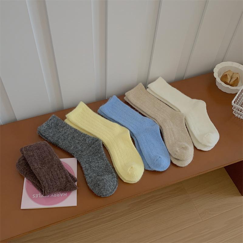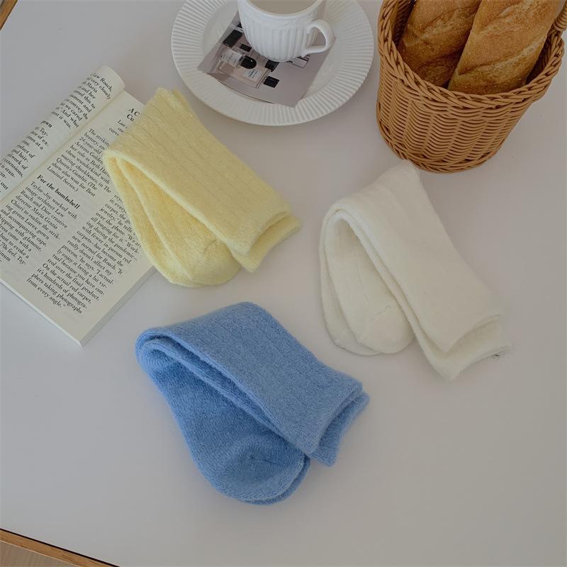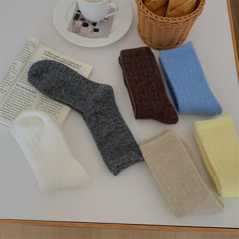 Otoño e Invierno tejido cálido grueso color sólido canalé media pantorrilla mohair calcetines de lana para mujer marrón estilo japonés calcetines de felpa