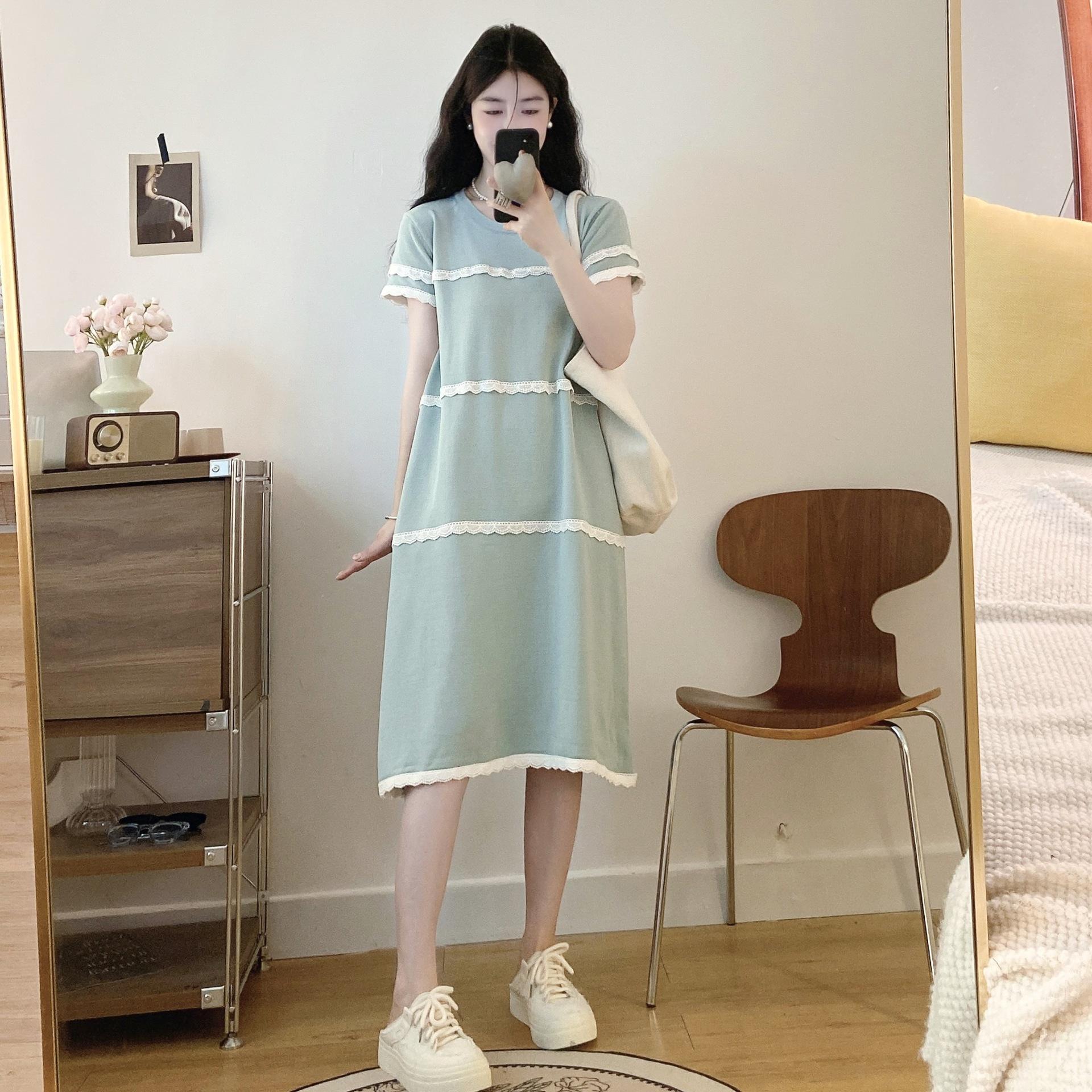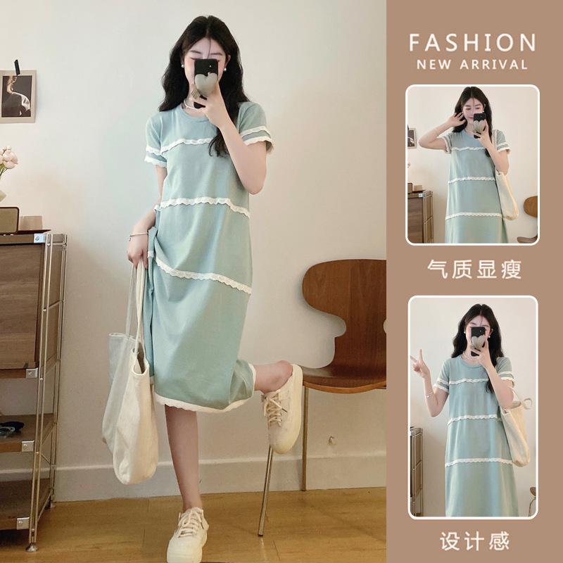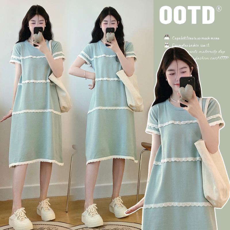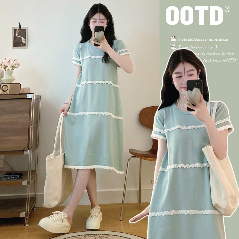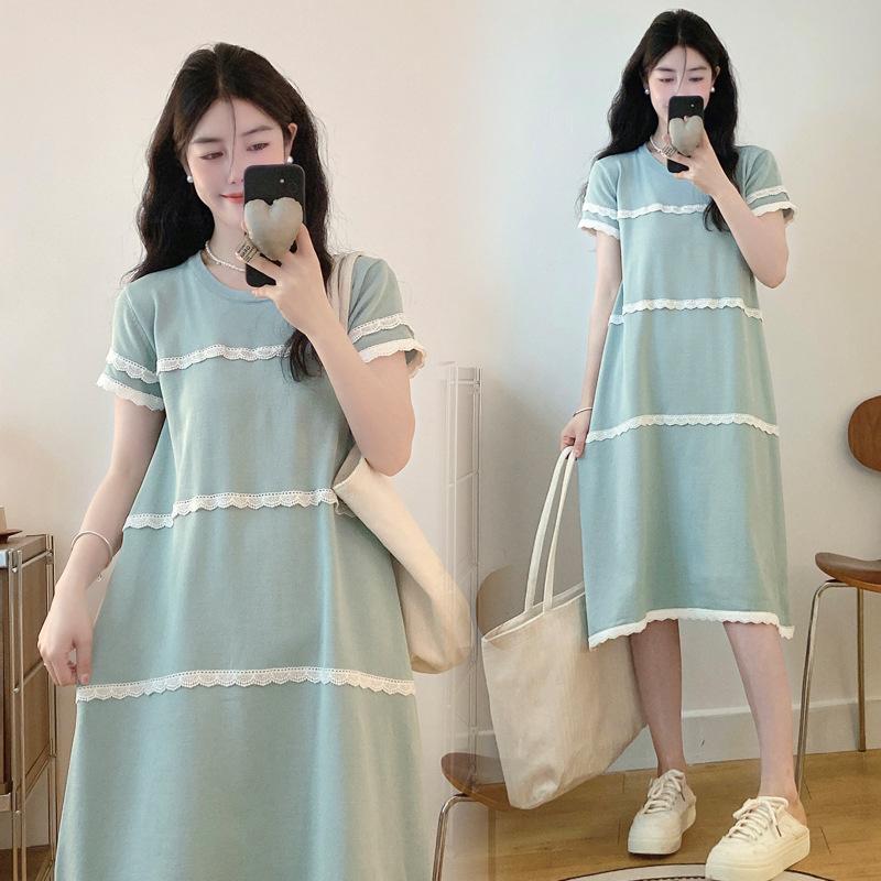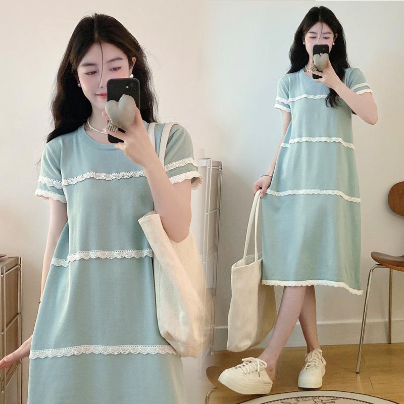 Maternidad 2025 Verano Nuevo Moda Coreana Encaje Costura Talla Grande Tejido Suelto Vestido de Mujeres Embarazadas