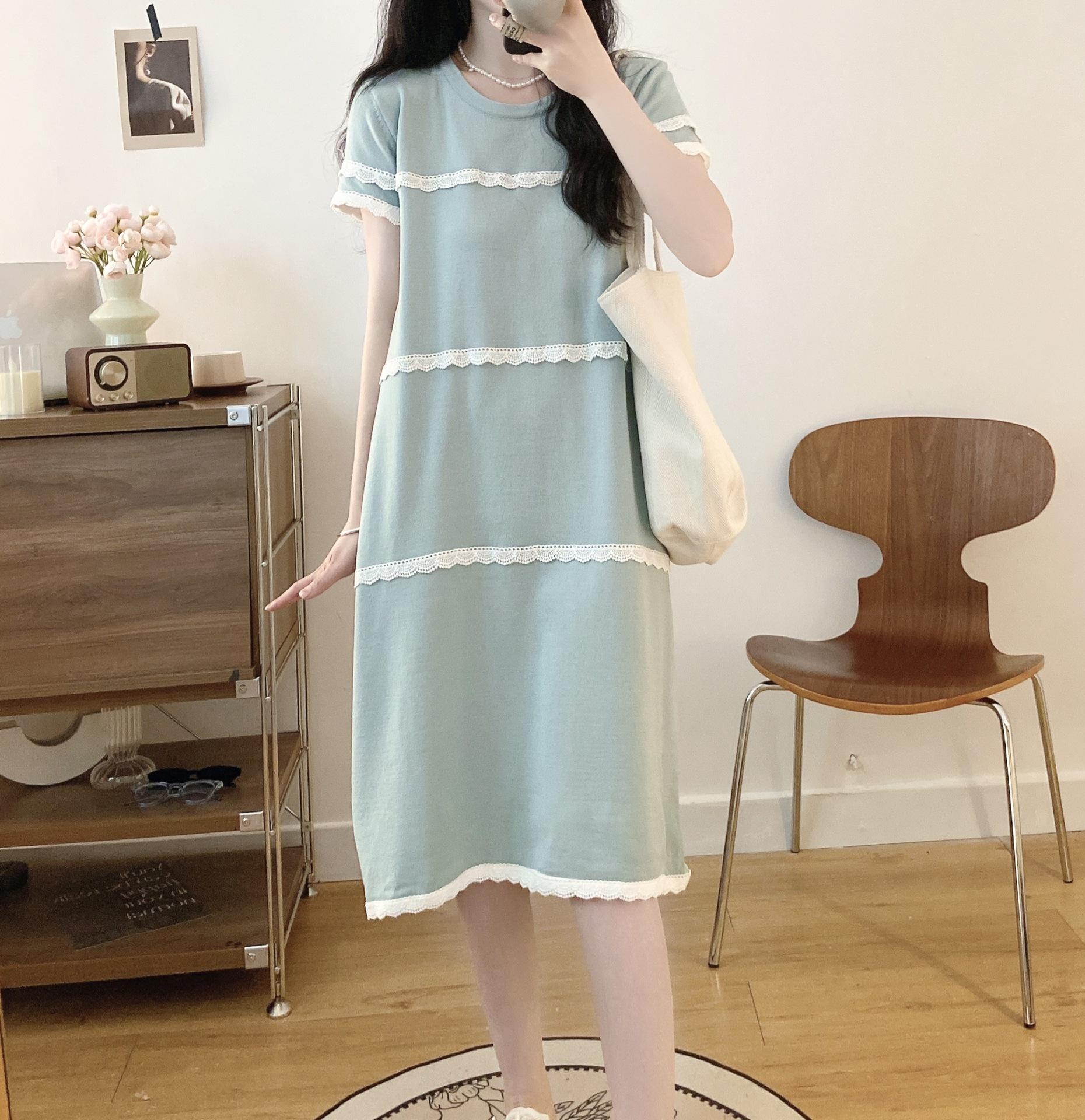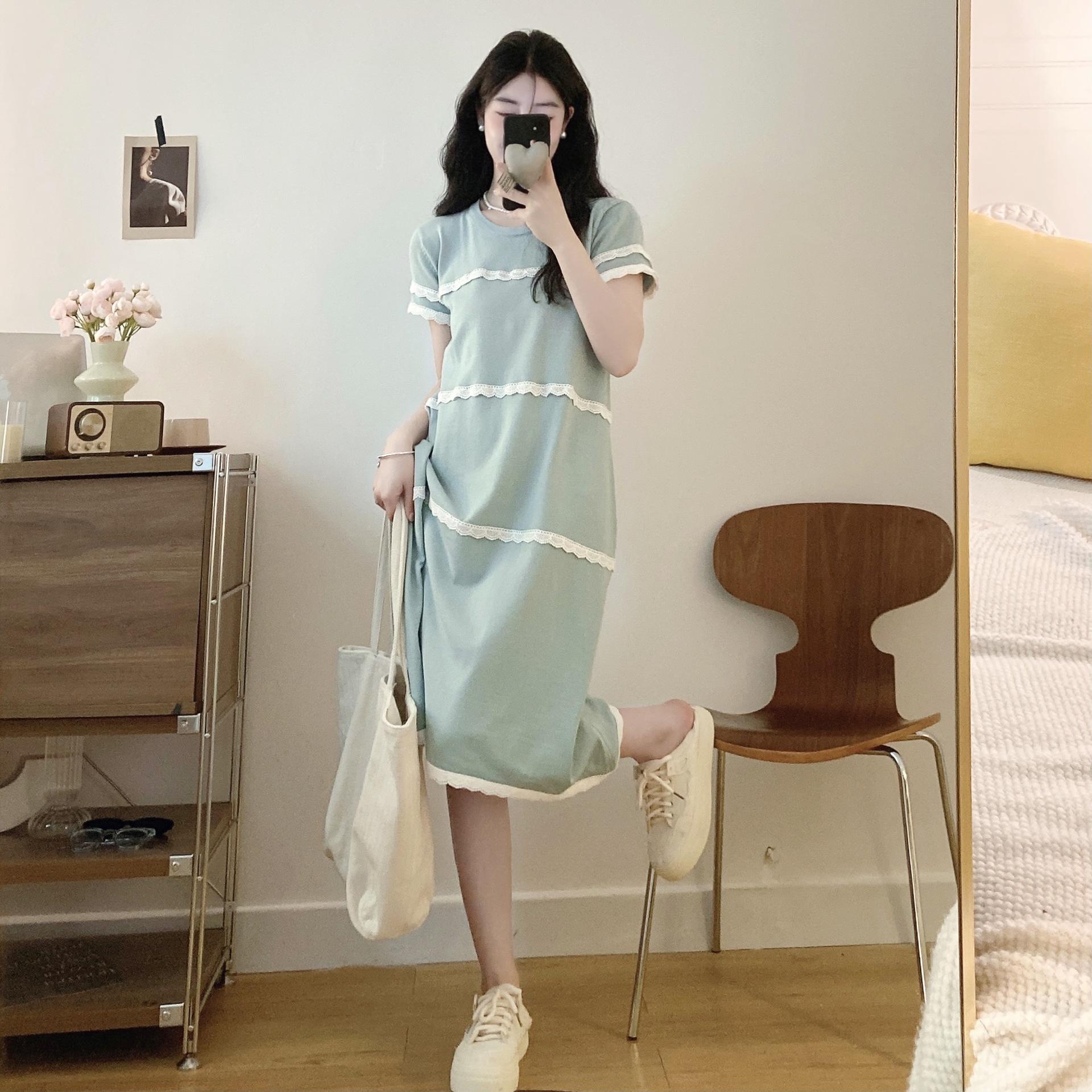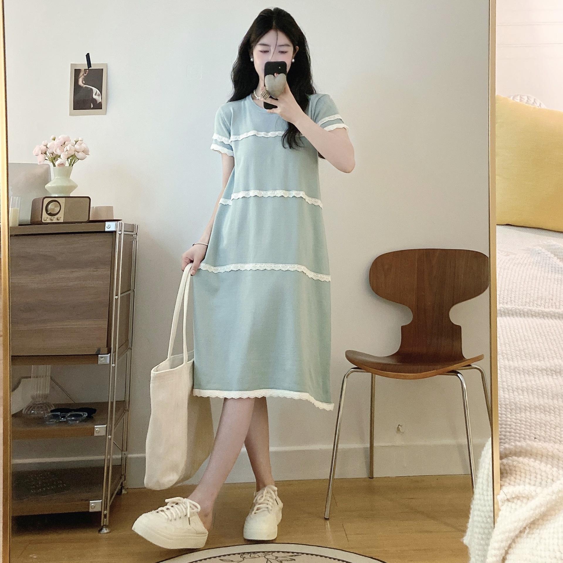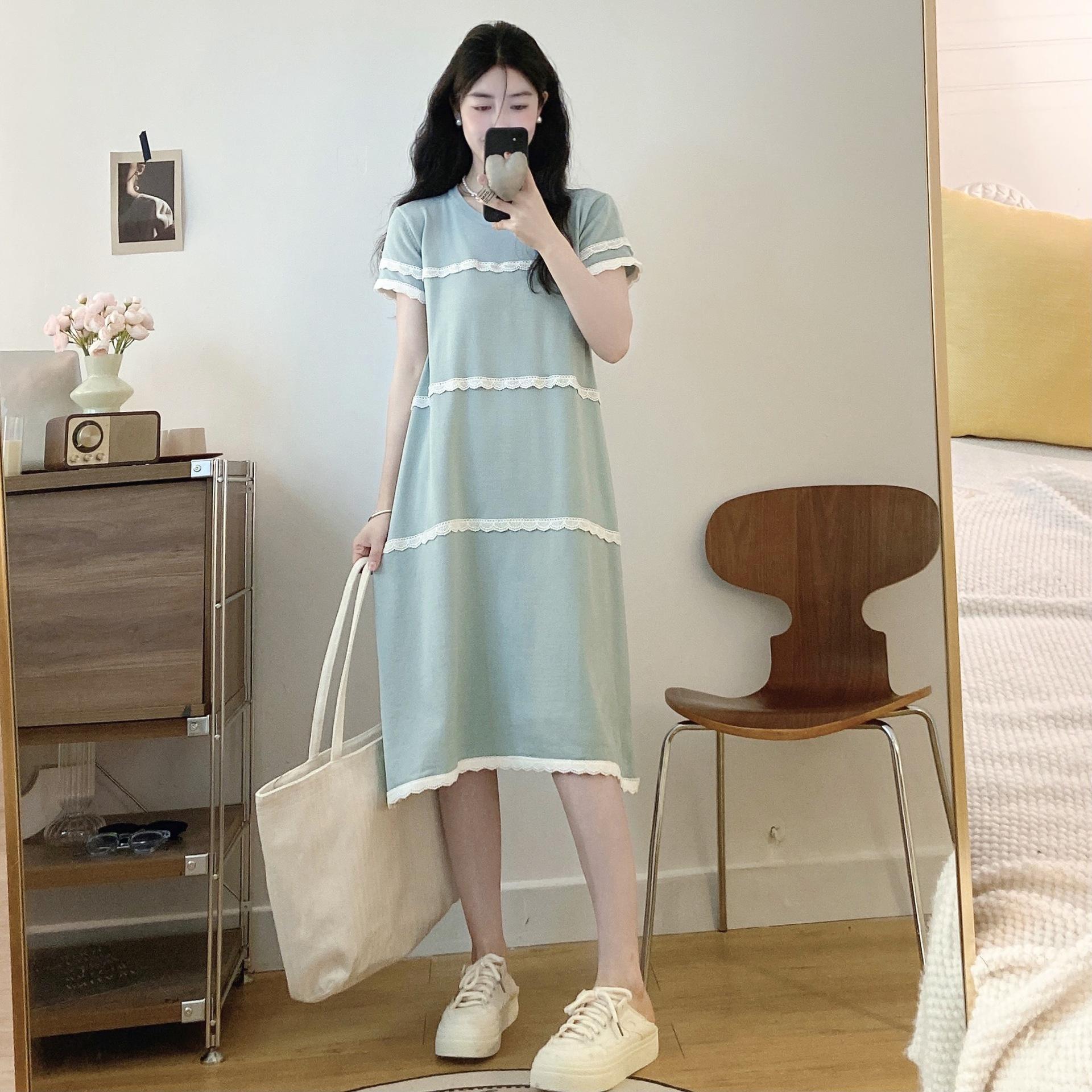 Maternidad 2025 Verano Nuevo Moda Coreana Encaje Costura Talla Grande Tejido Suelto Vestido de Mujeres Embarazadas