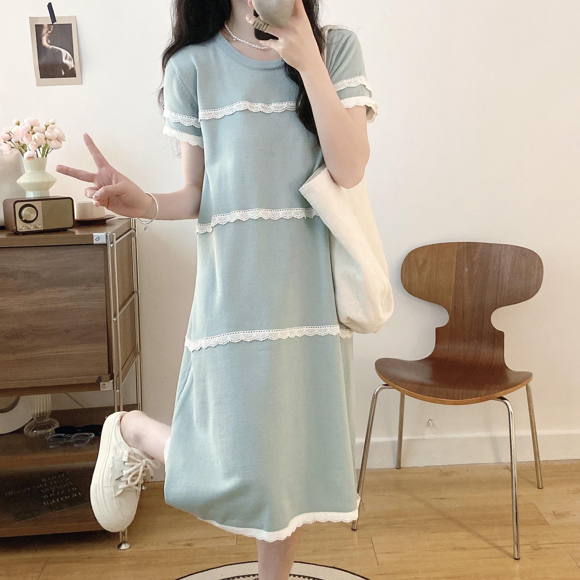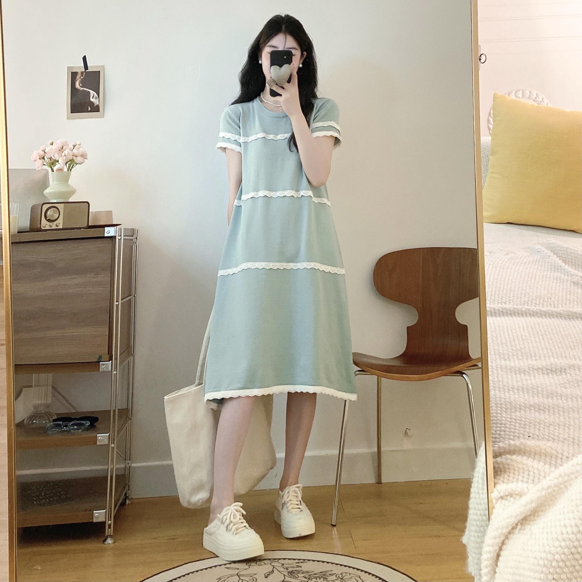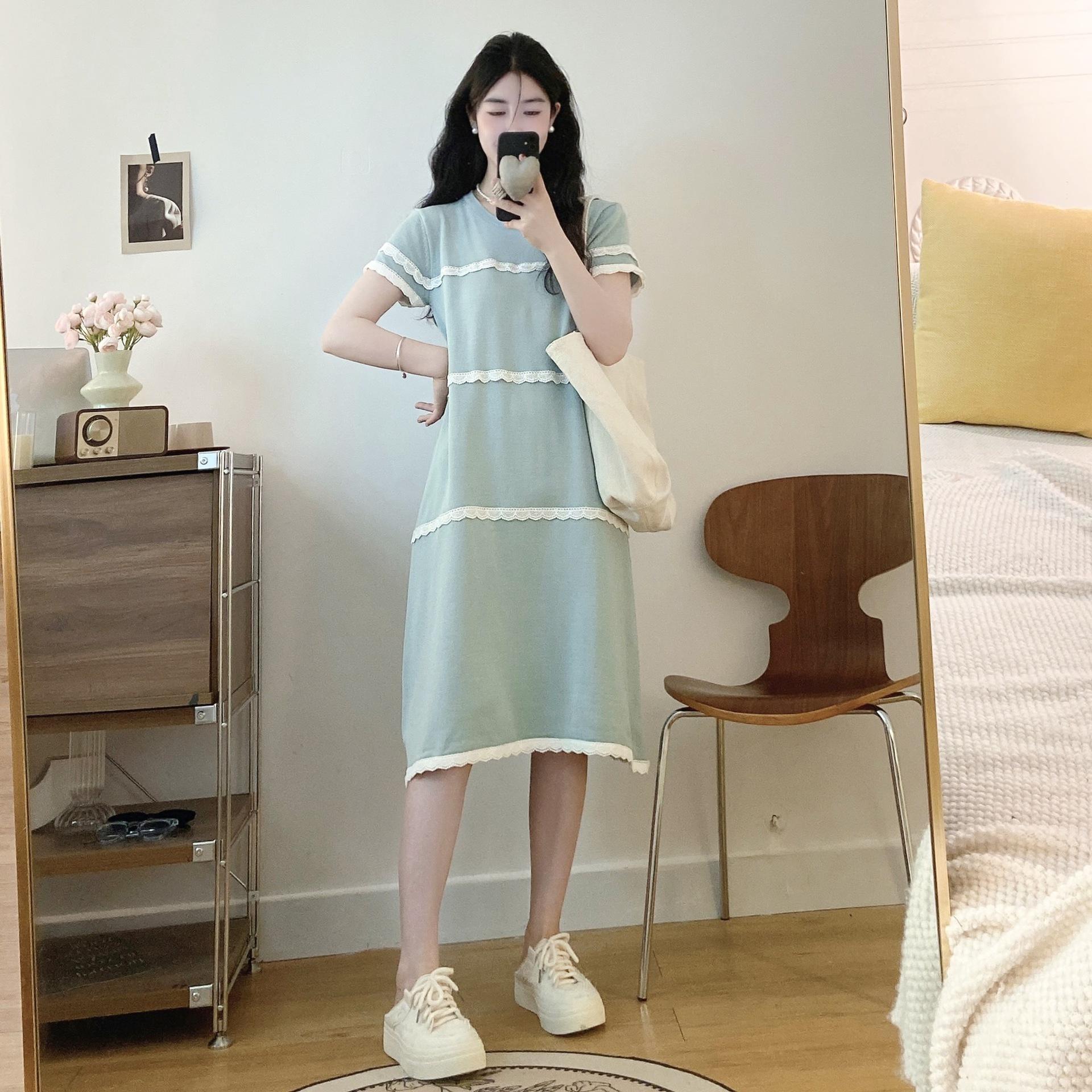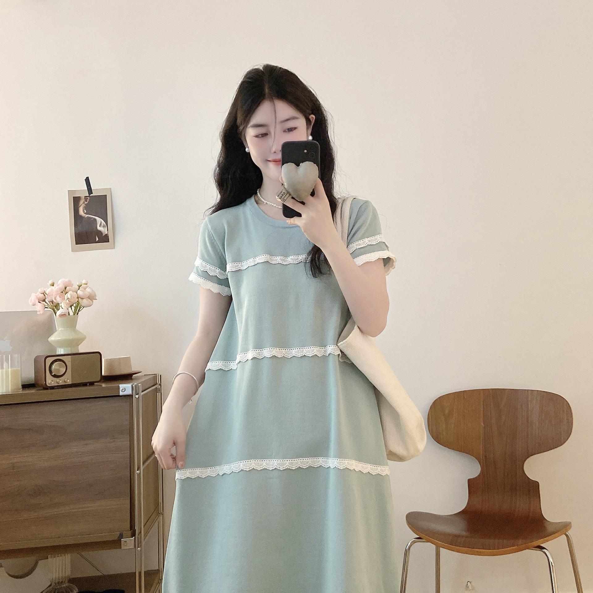 Maternidad 2025 Verano Nuevo Moda Coreana Encaje Costura Talla Grande Tejido Suelto Vestido de Mujeres Embarazadas