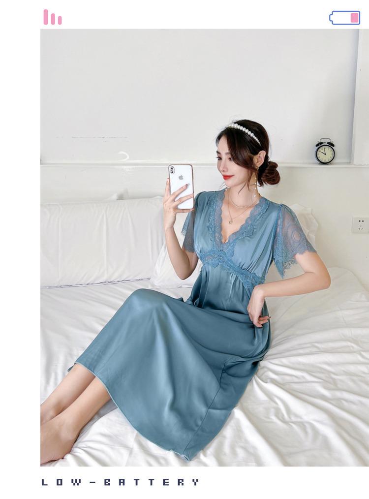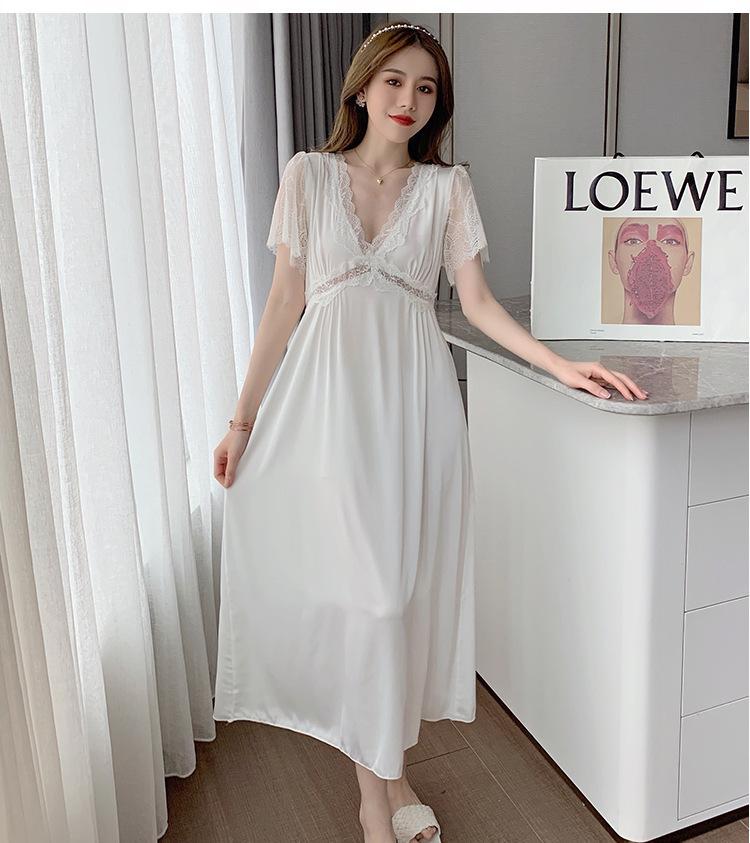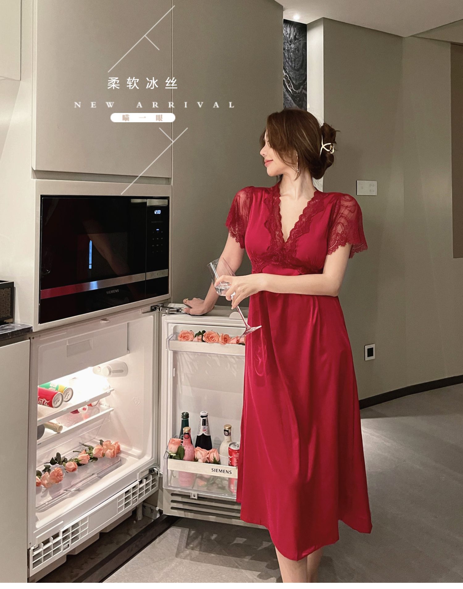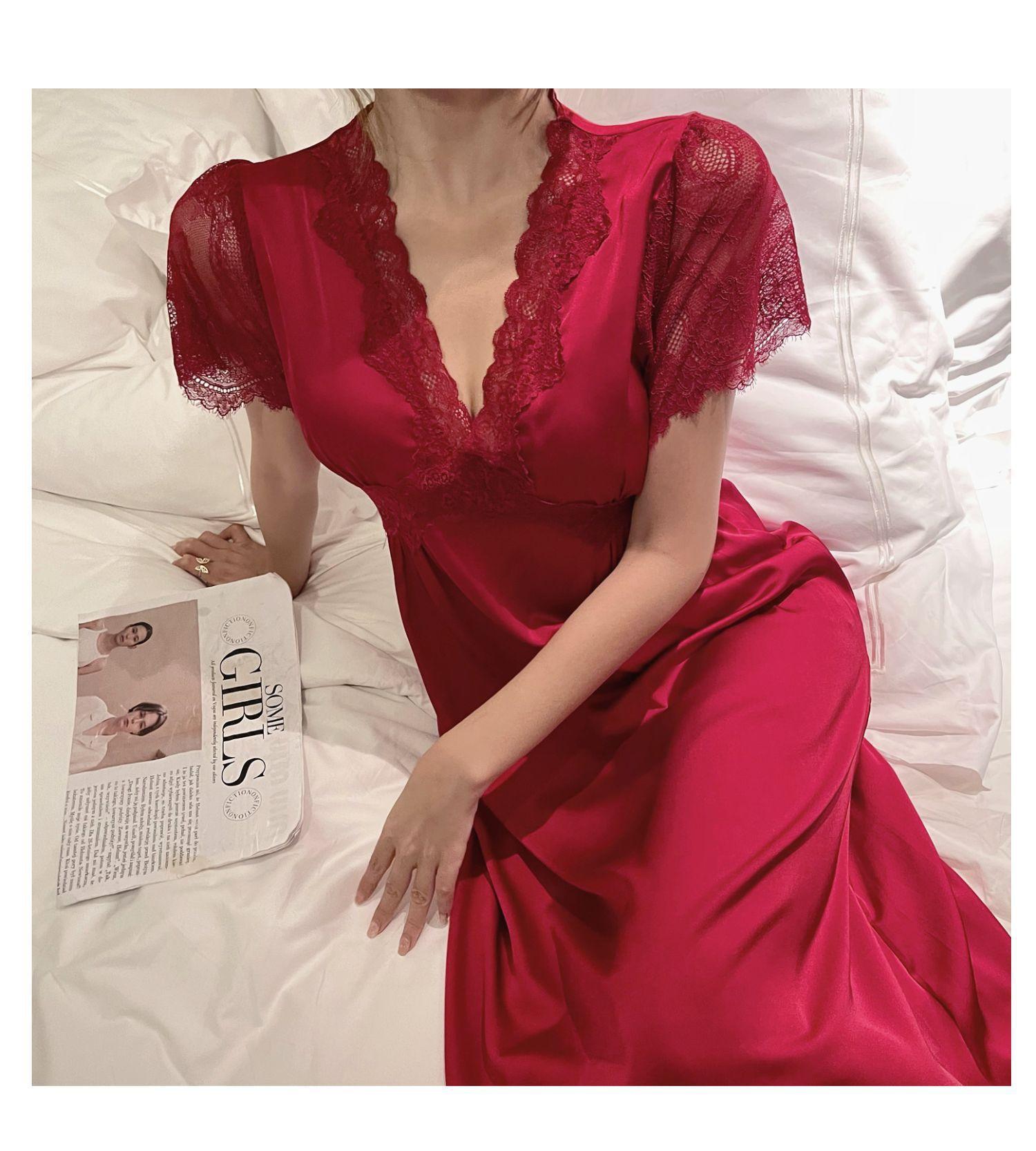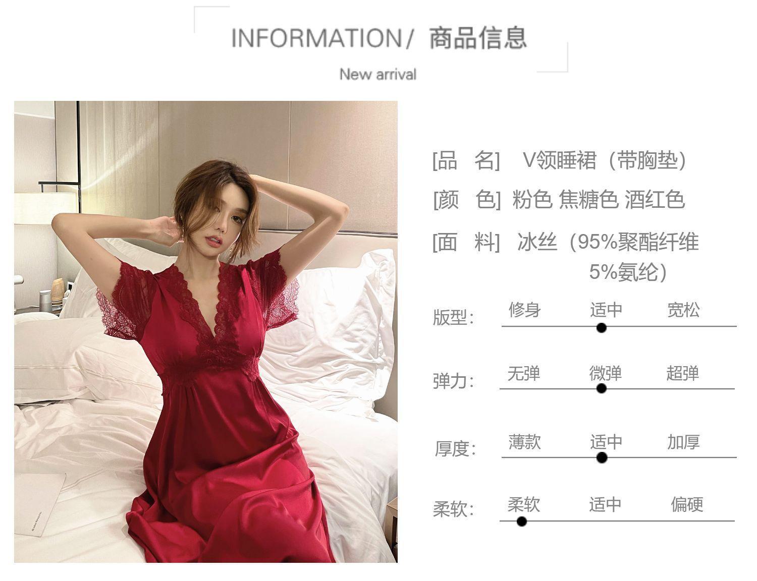 Camisón de Verano para Mujer, Pijama de Seda Hielo y Nieve, Encaje de Tentación Sexy, Estilo Lujuria Pura Falda Larga de Seda Hielo, Transmisión en Vivo con Almohadillas para el Busto