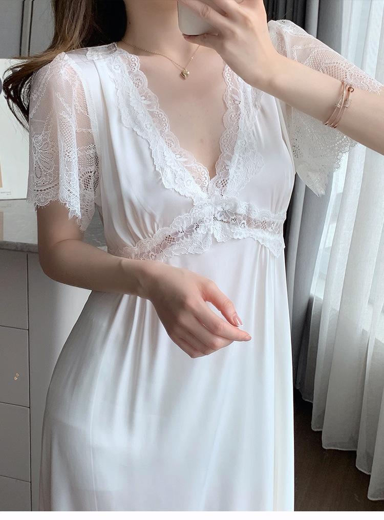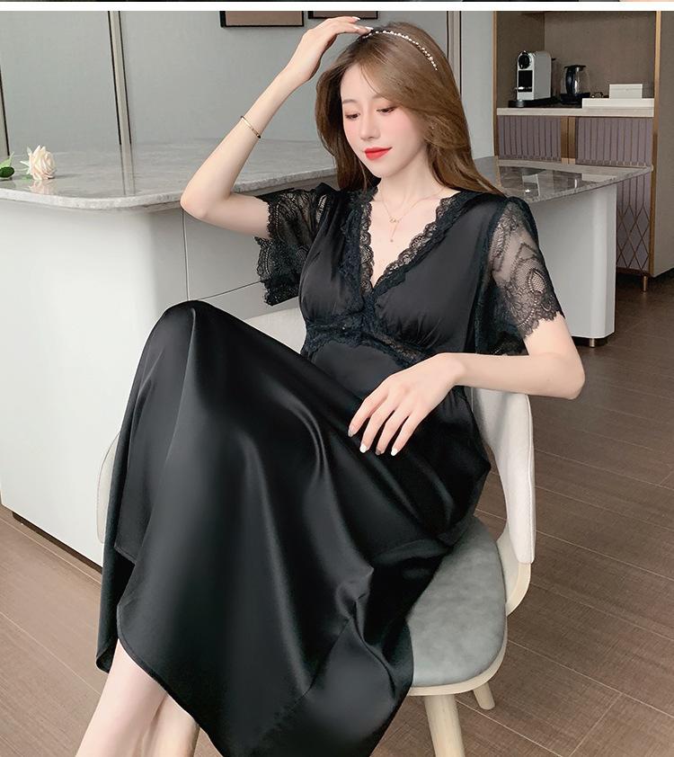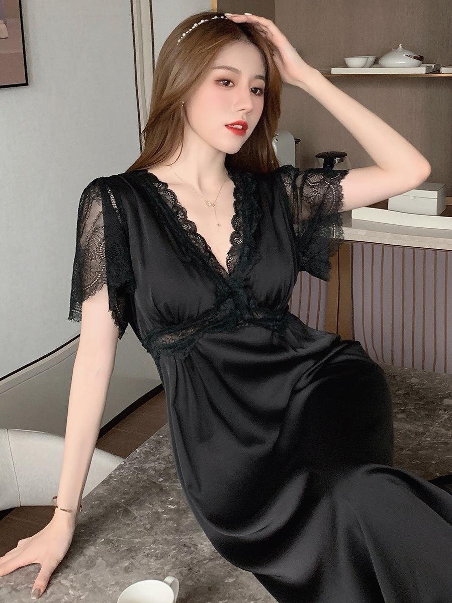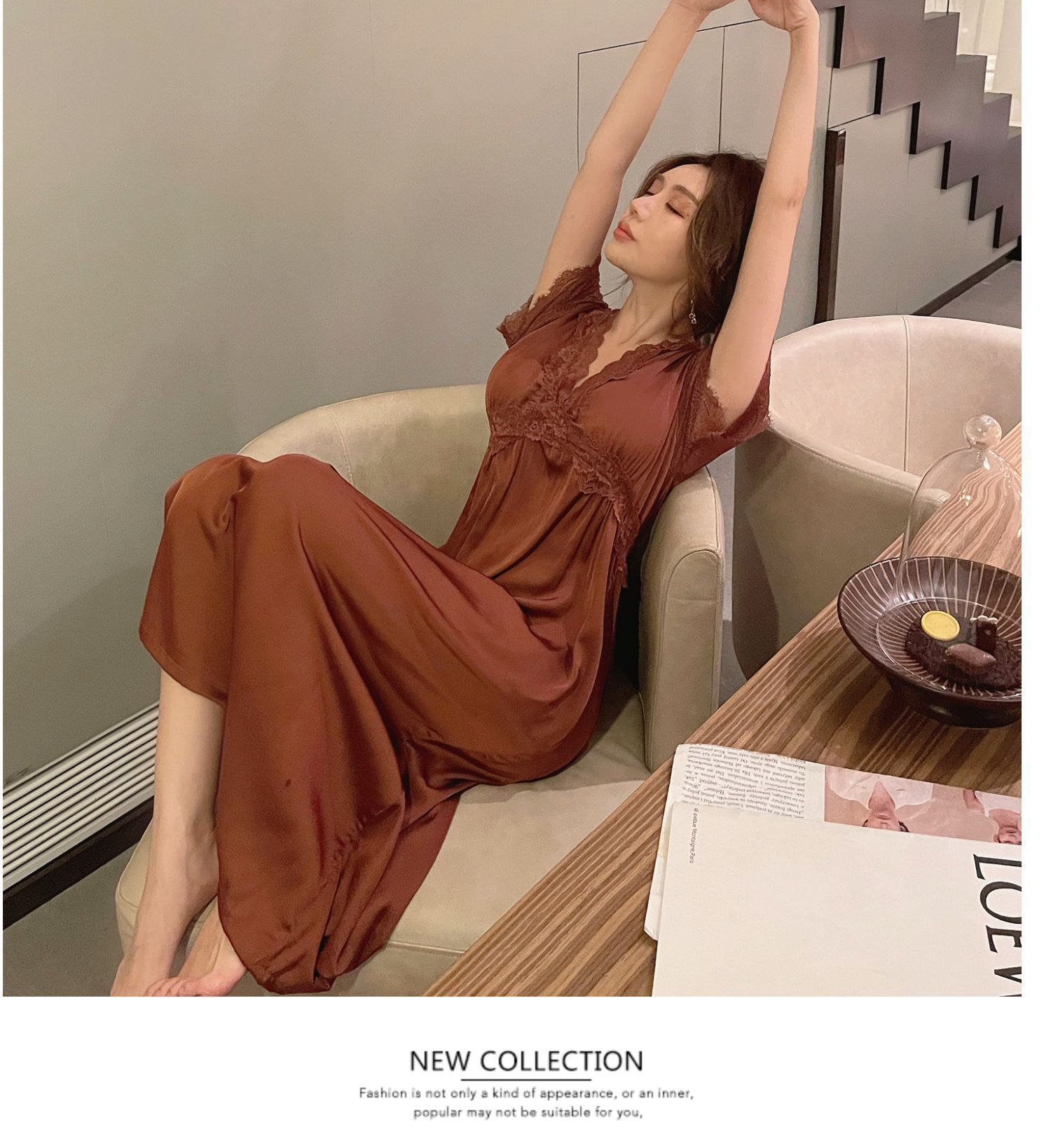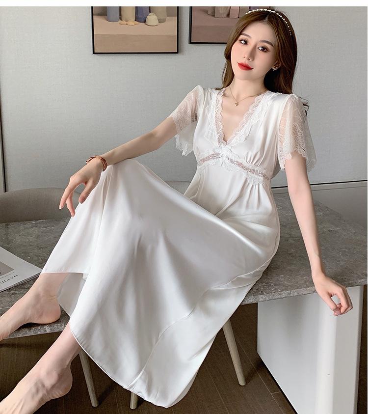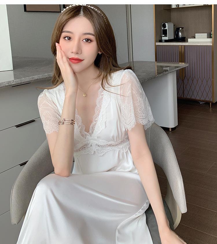 Camisón de Verano para Mujer, Pijama de Seda Hielo y Nieve, Encaje de Tentación Sexy, Estilo Lujuria Pura Falda Larga de Seda Hielo, Transmisión en Vivo con Almohadillas para el Busto