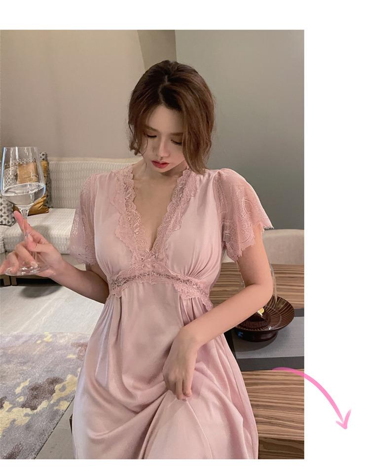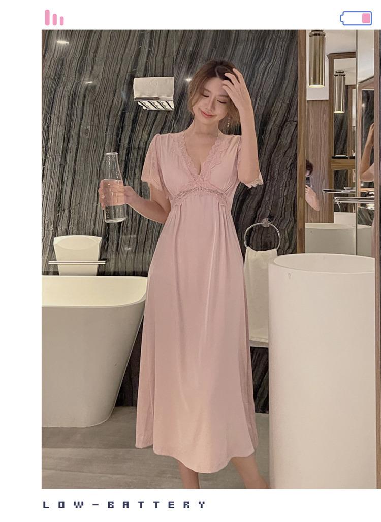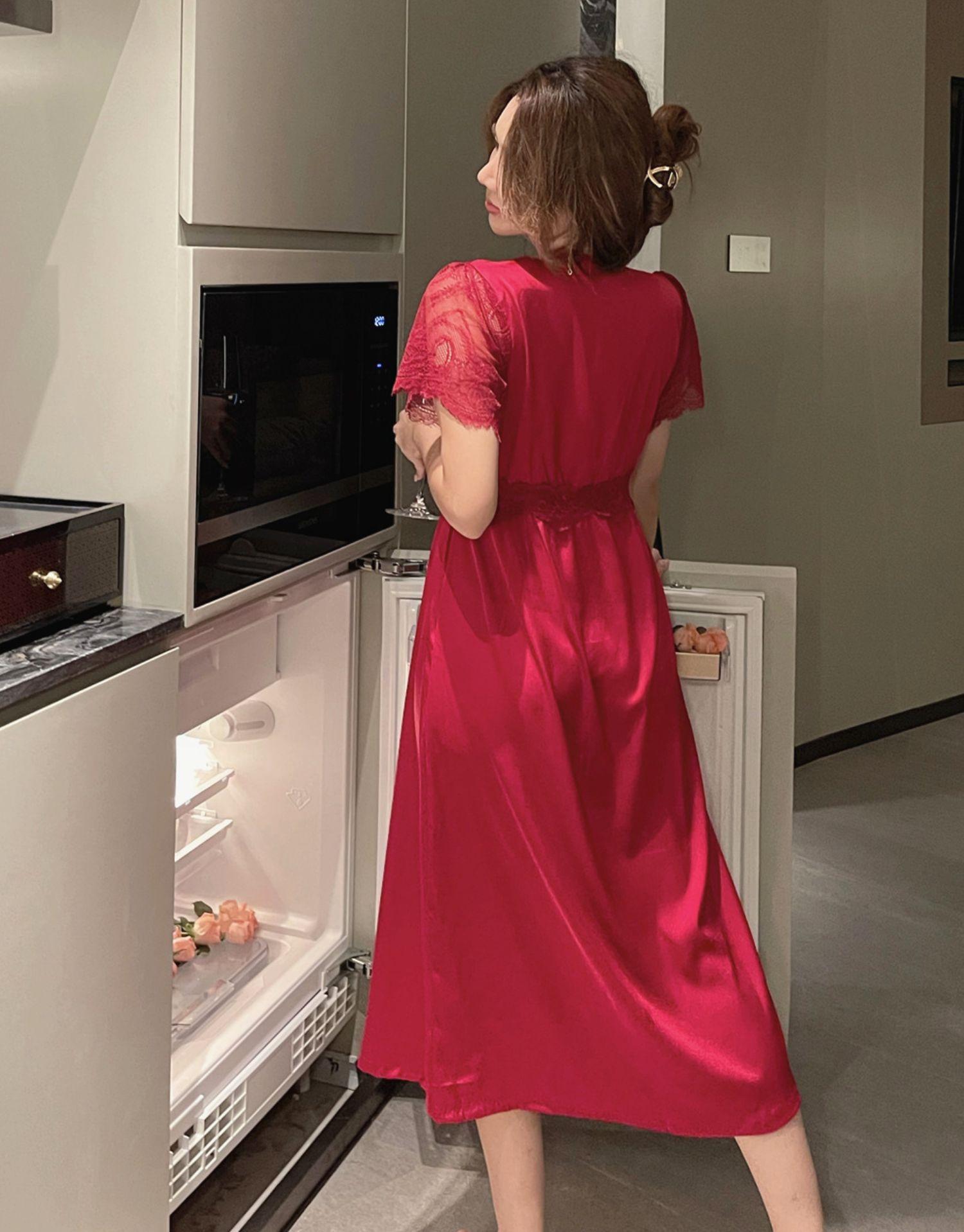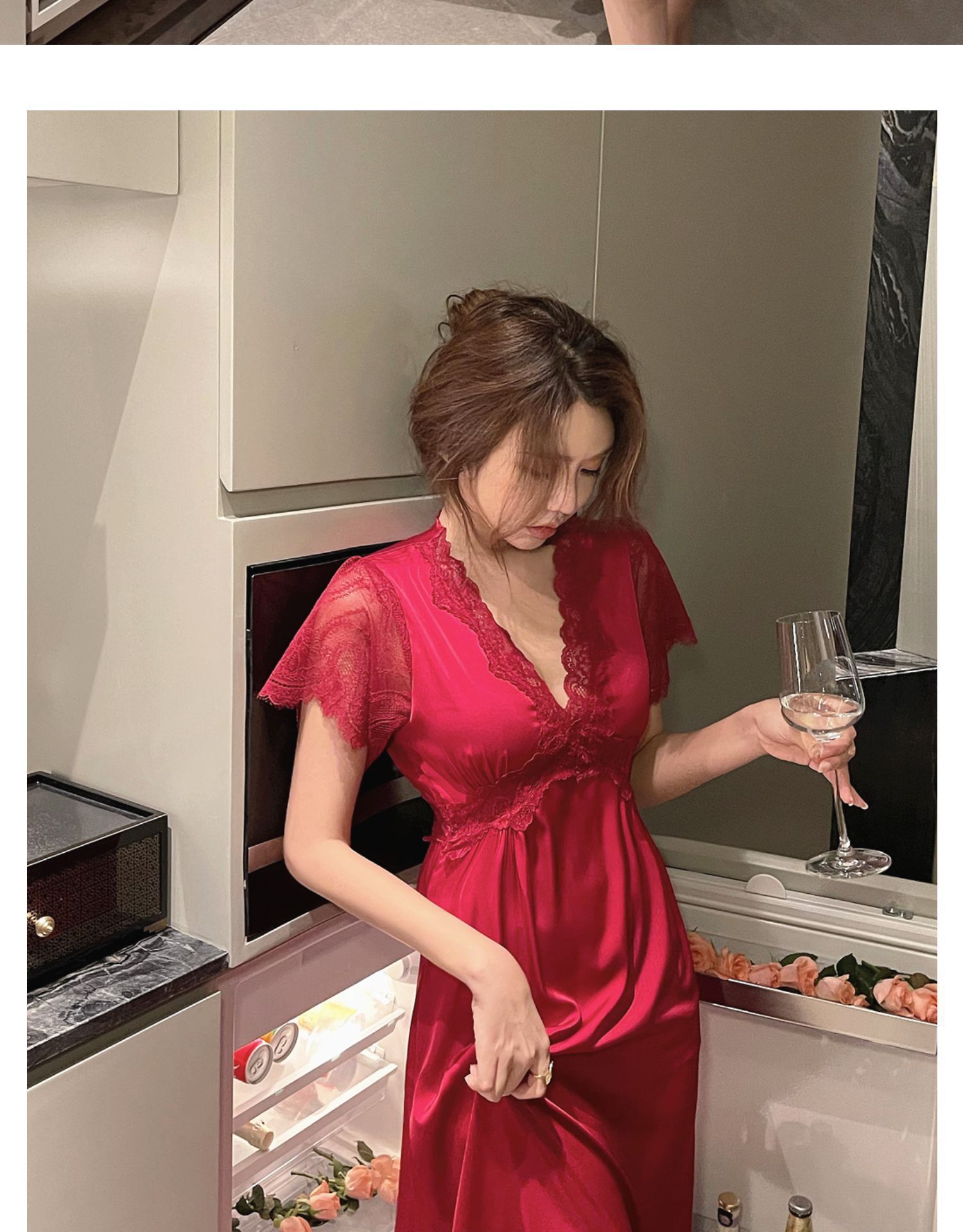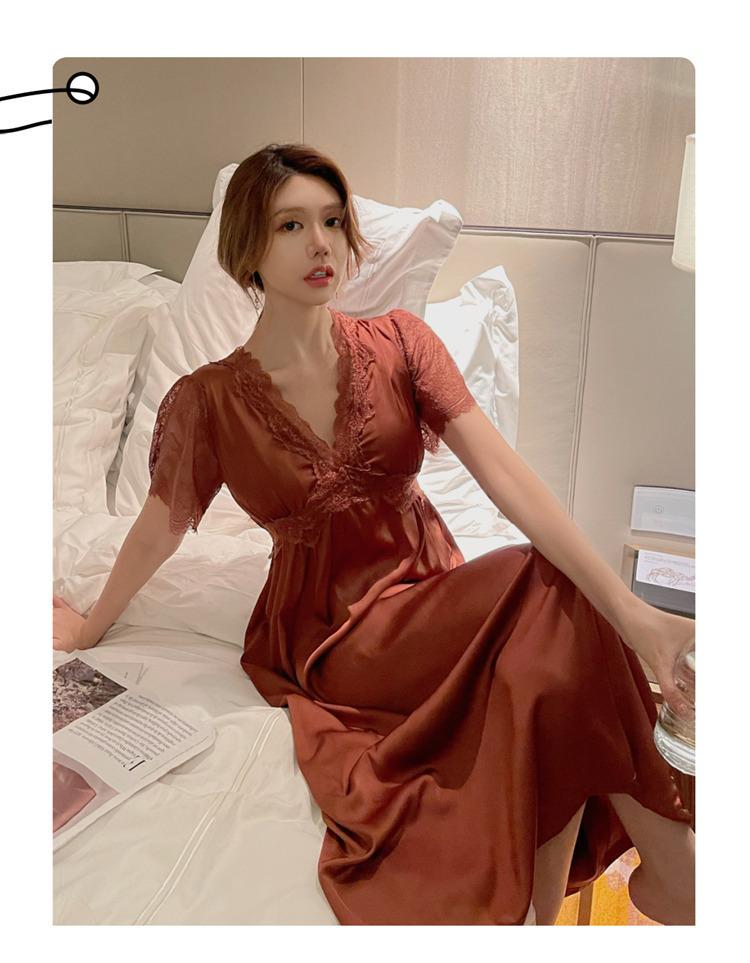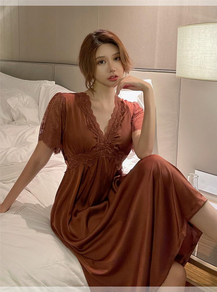 Camisón de Verano para Mujer, Pijama de Seda Hielo y Nieve, Encaje de Tentación Sexy, Estilo Lujuria Pura Falda Larga de Seda Hielo, Transmisión en Vivo con Almohadillas para el Busto