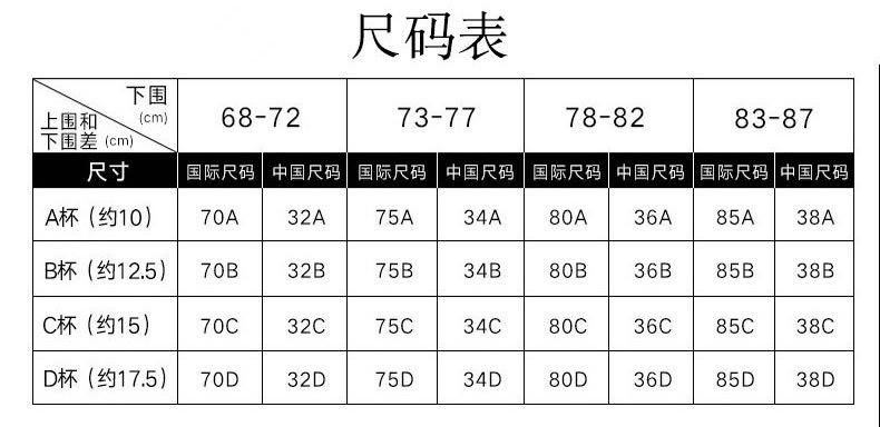 S【32/70ABC】, M【34/75ABC】, L【36/80ABC】, XL【38/85ABC】