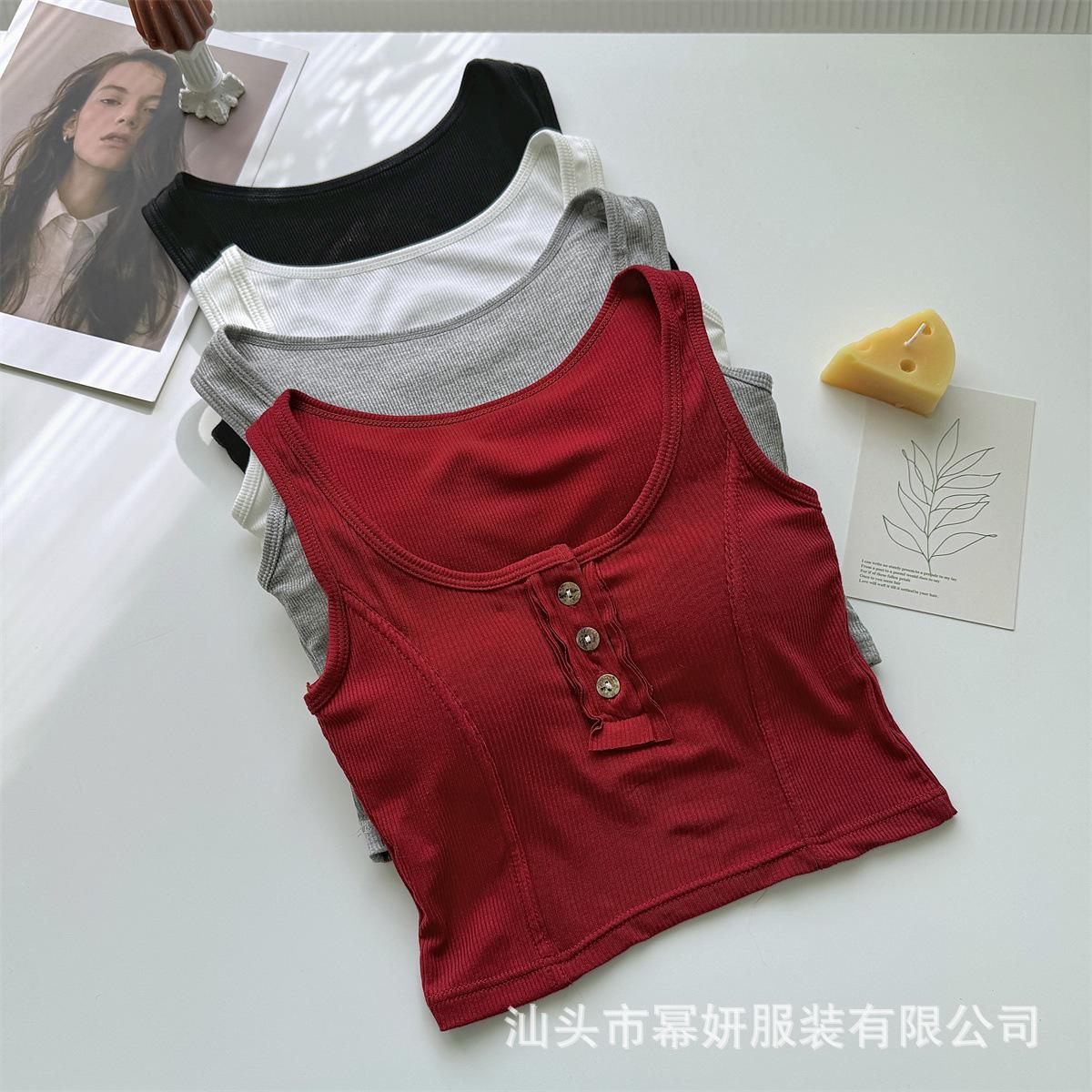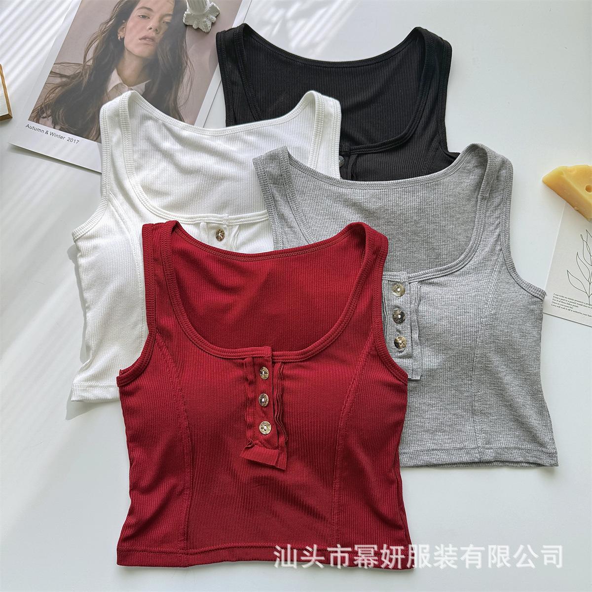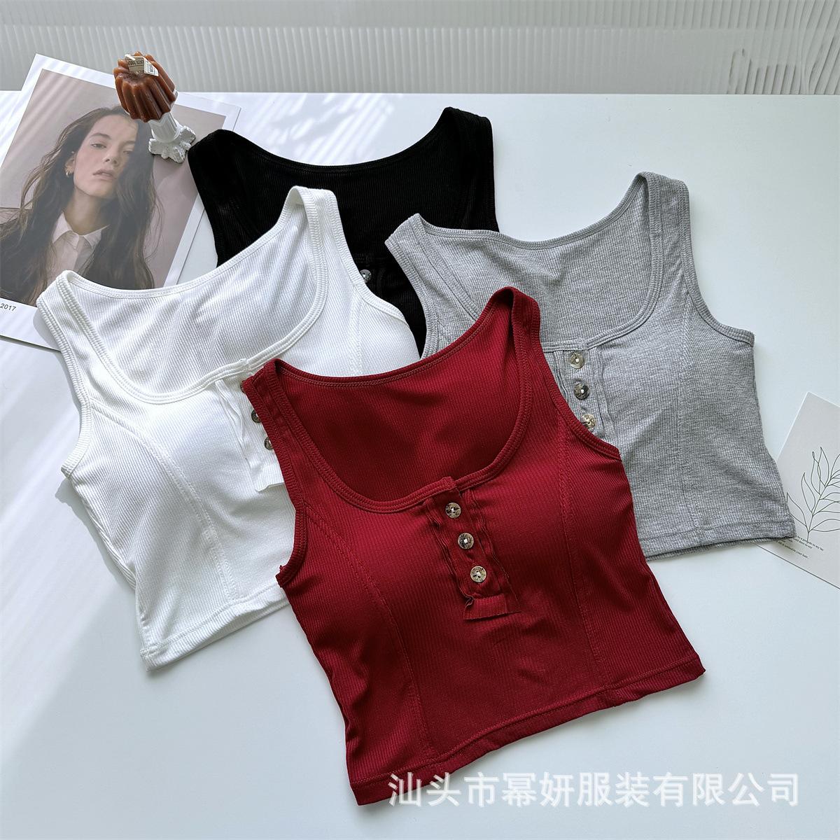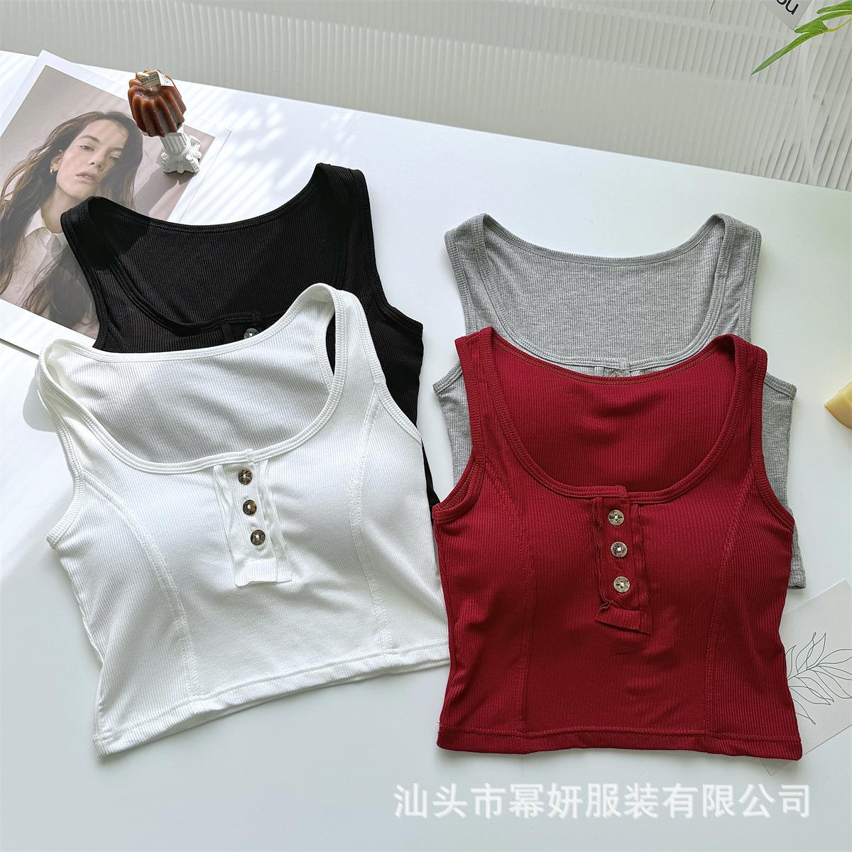 Algodón Puro Sexy Botón Camisola Chaleco de Hombro Ancho con Almohadilla en el Pecho Cuello U Grande Top Ombliguera Antiluz