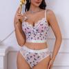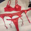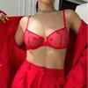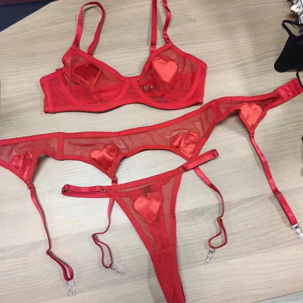 Sujetador de encaje transparente ultradelgado sexy transfronterizo de comercio exterior para mujer con forma de corazón anti-bultos, conjunto de ropa interior sexy de tres piezas