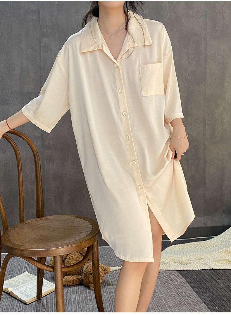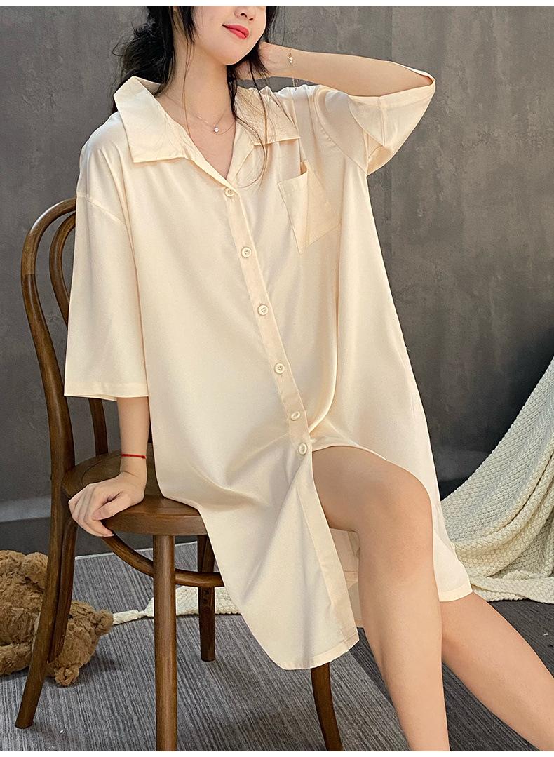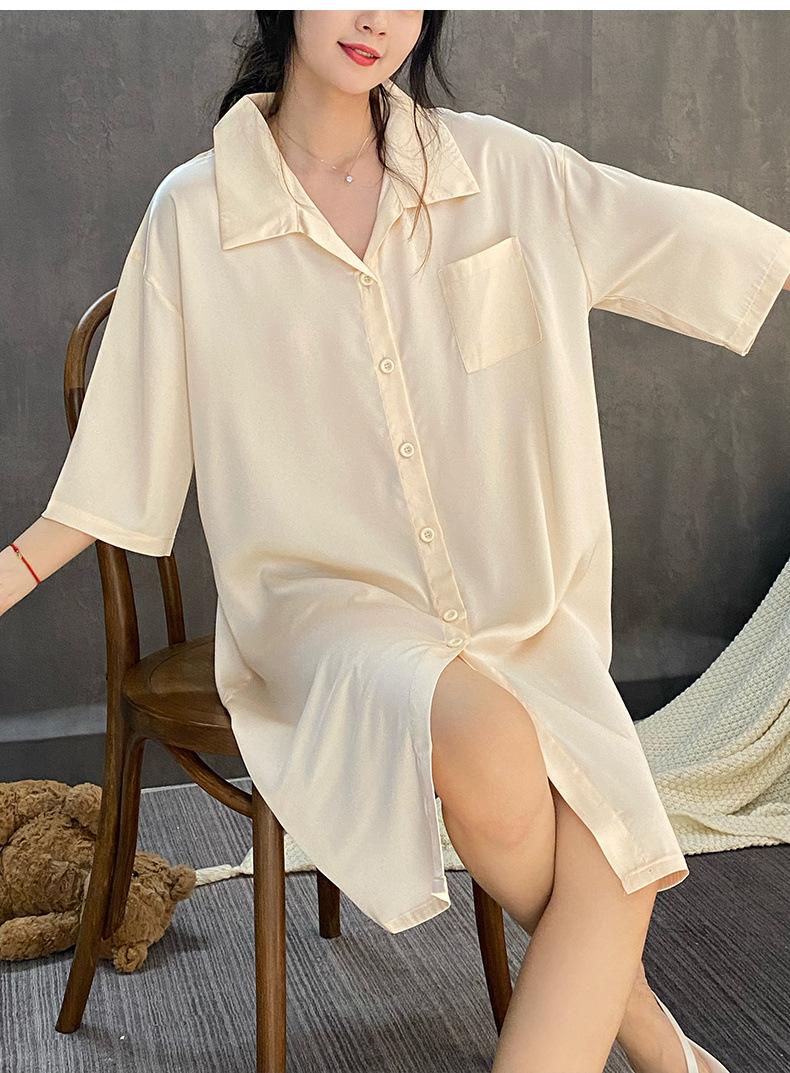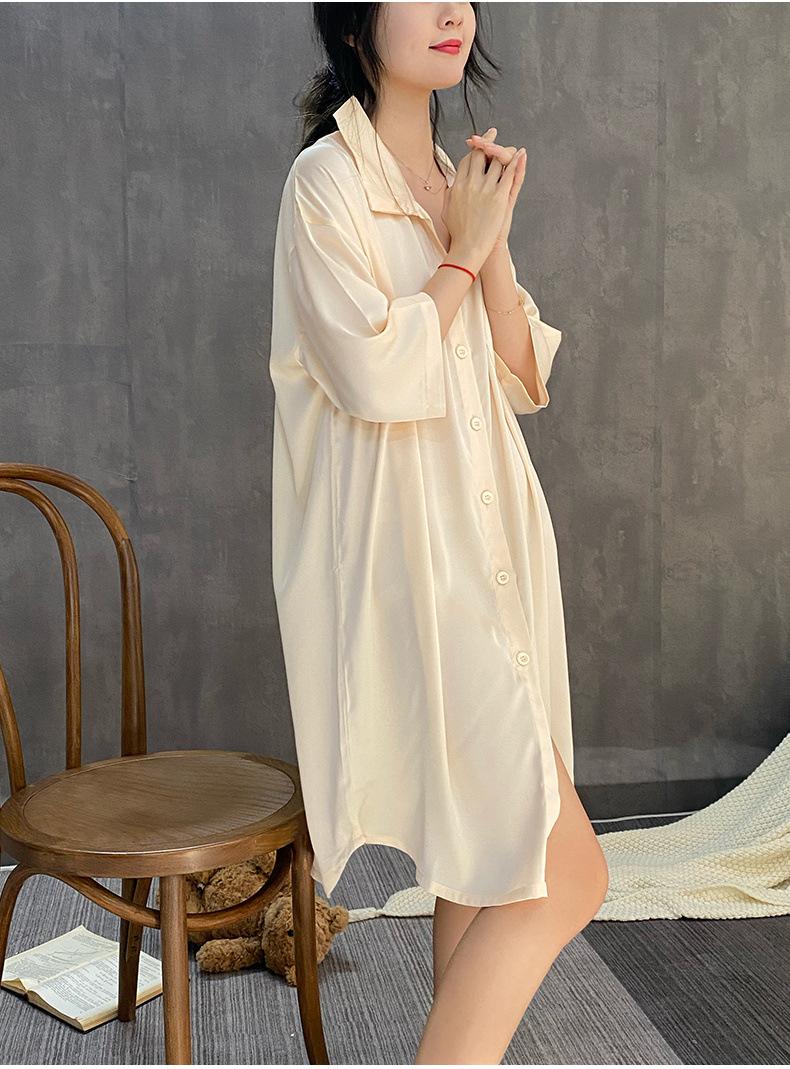 2025 Nuevo Camisón de Seda de Hielo para Mujer Verano Manga Corta Cárdigan Largo Medio Pijama de Seda Fino Sexy Ropa para el Hogar