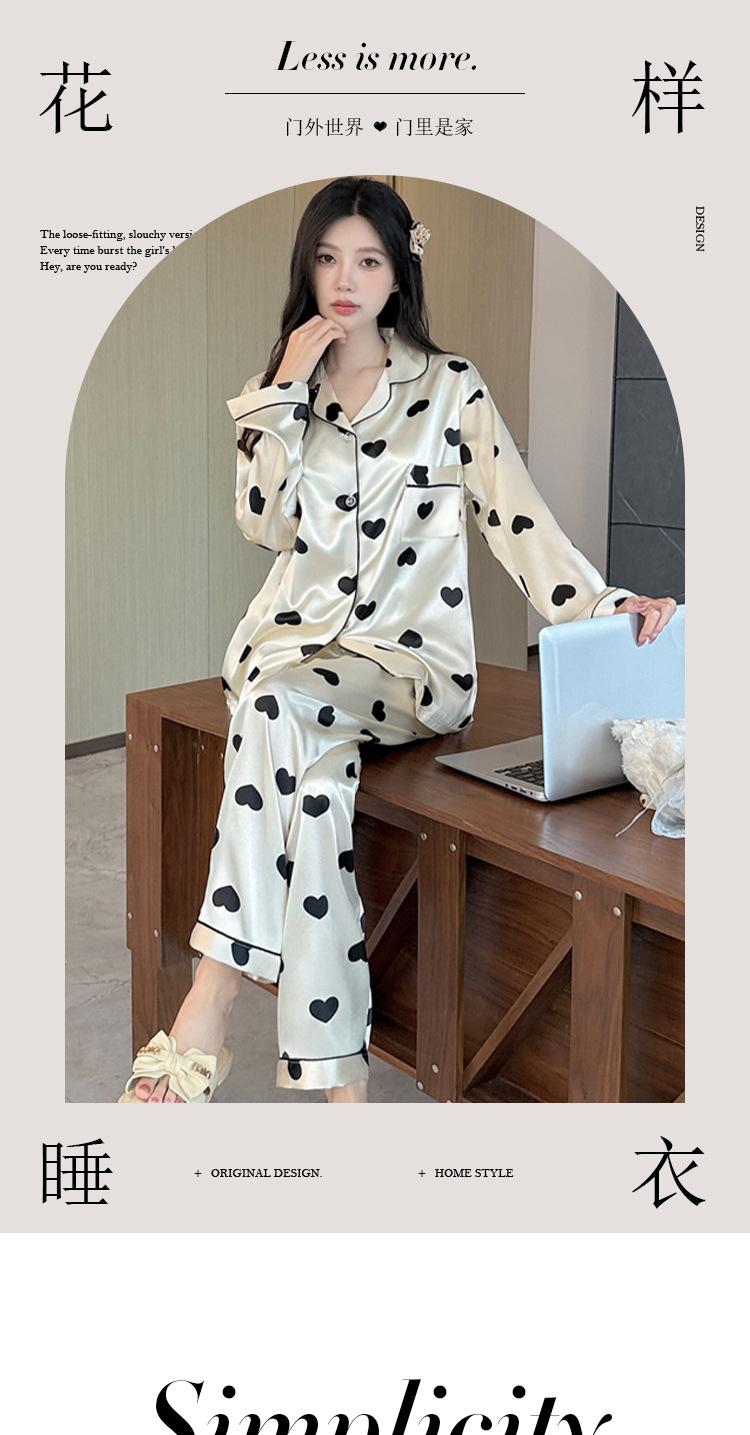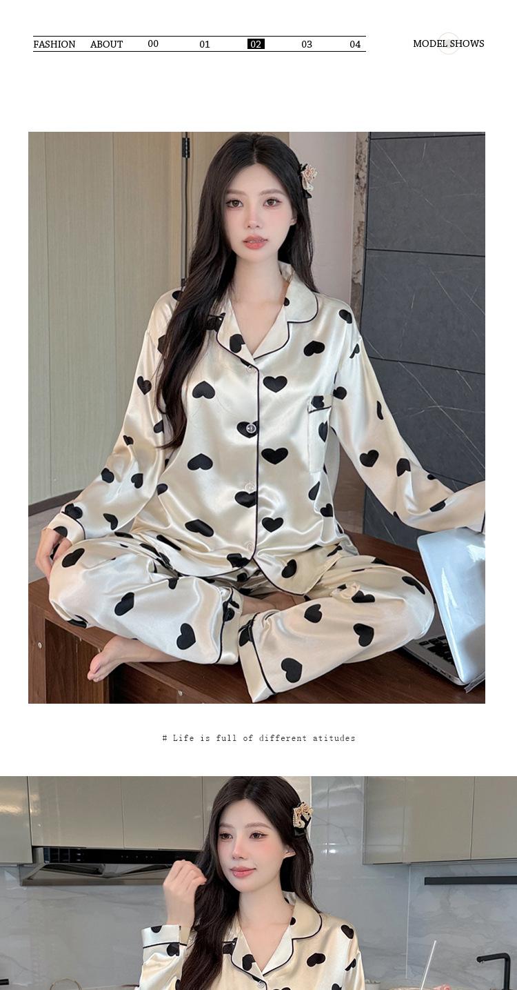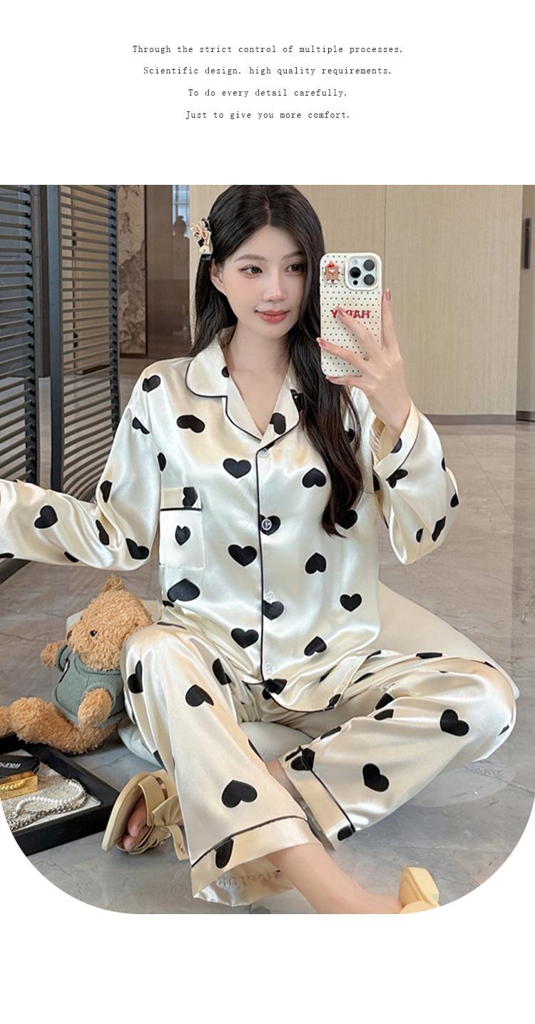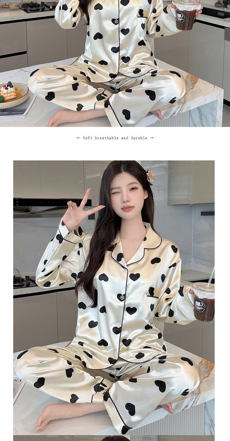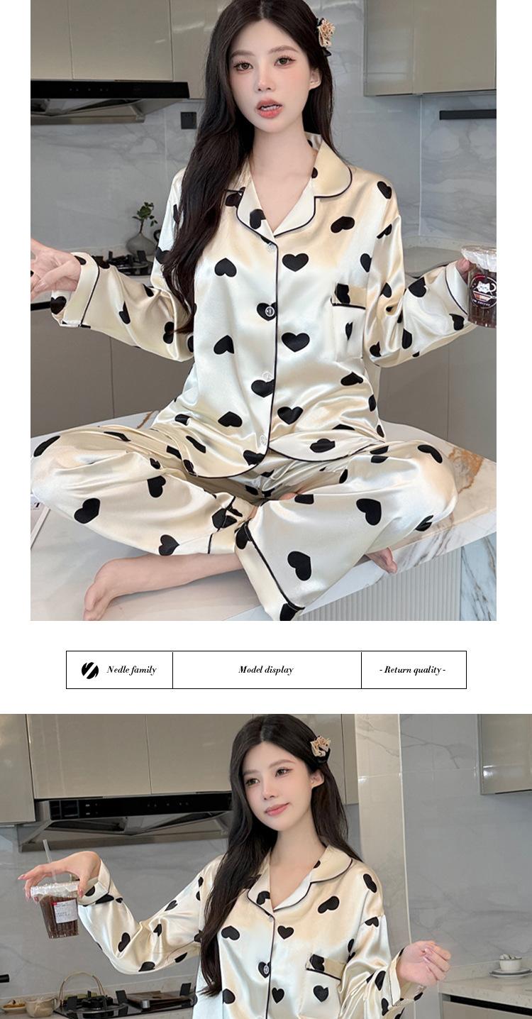 Pijamas de Seda de Hielo para Mujer Verano Nuevo Estilo Corazón Simple Ins Alta Gama Primavera y Otoño Manga Larga Conjunto de Ropa para el Hogar Venta al por Mayor