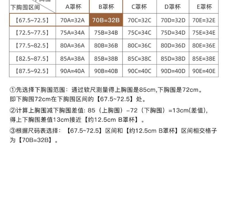 S 70A/70B/65C, M 75A/75B/70C, L 80A/80B/75C, XL 85A/85B/80C