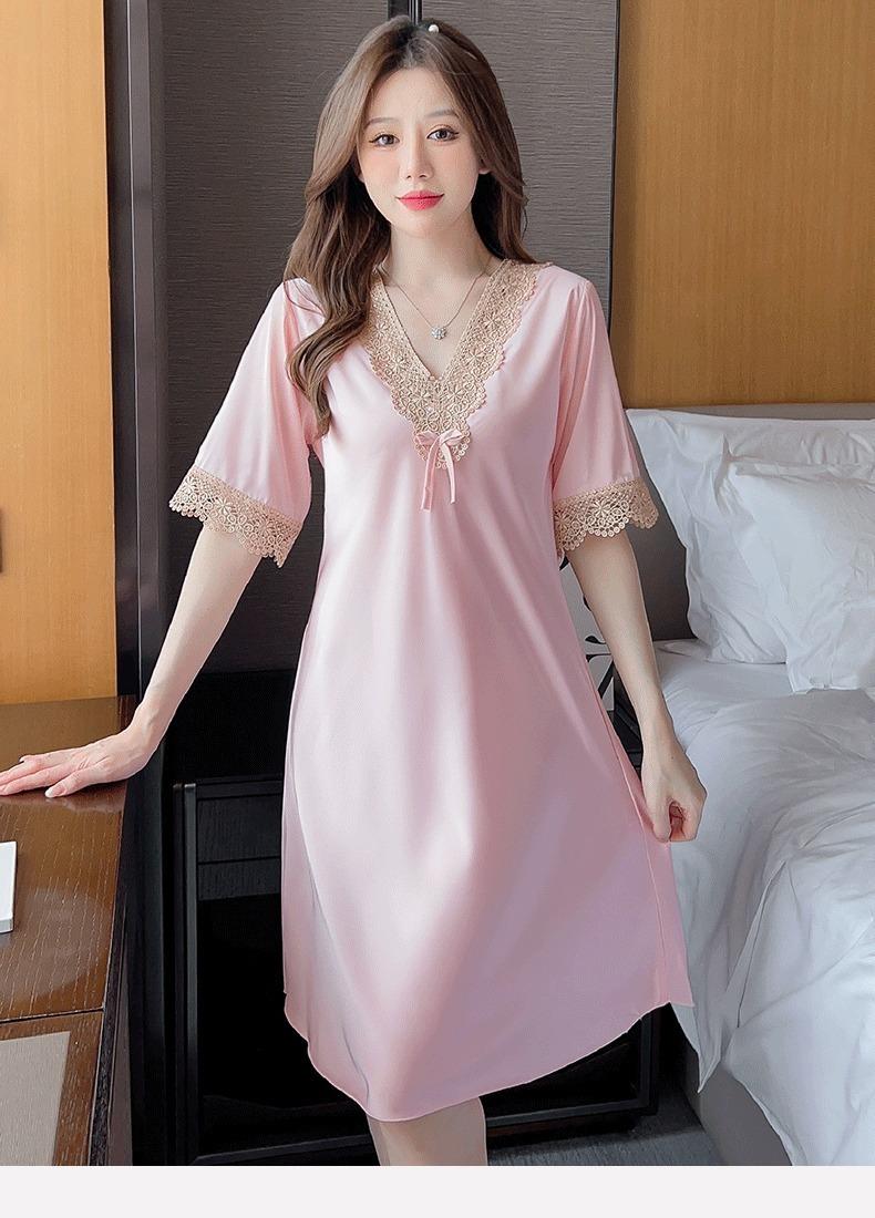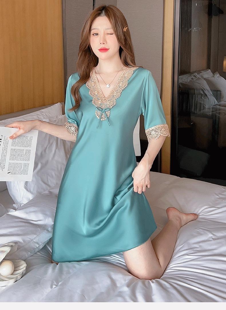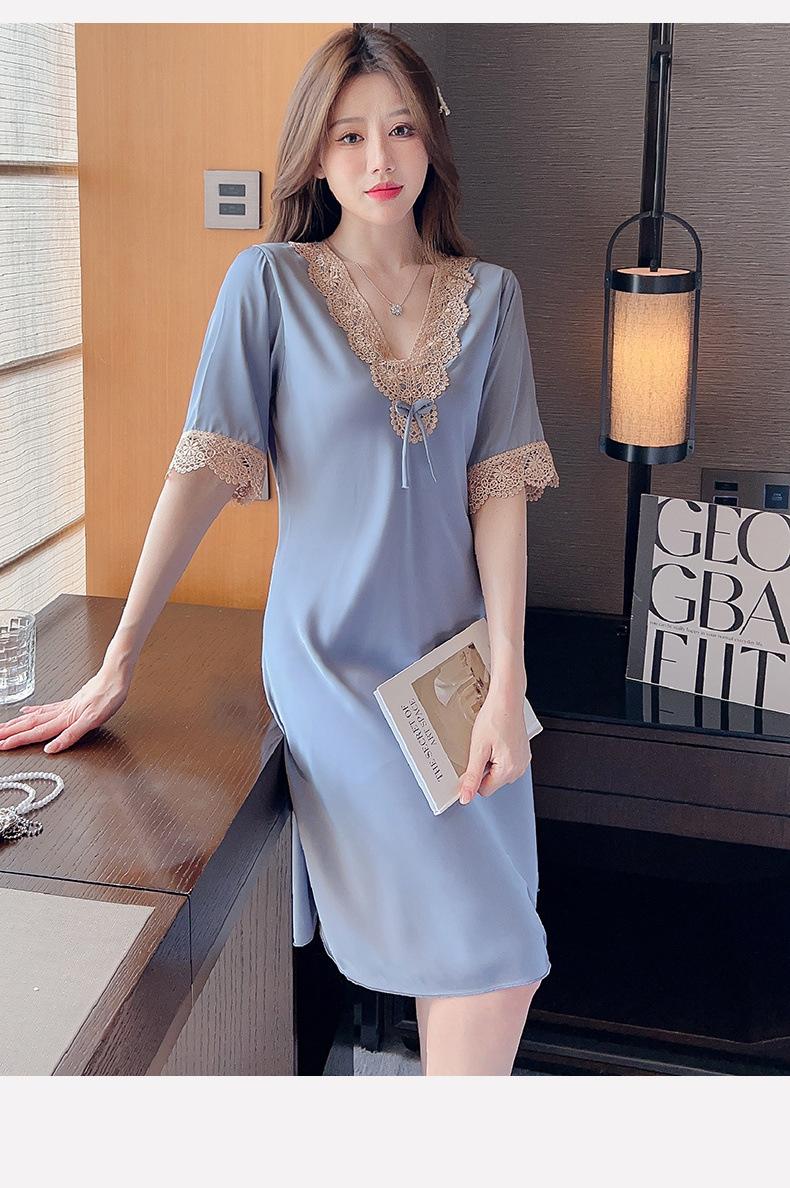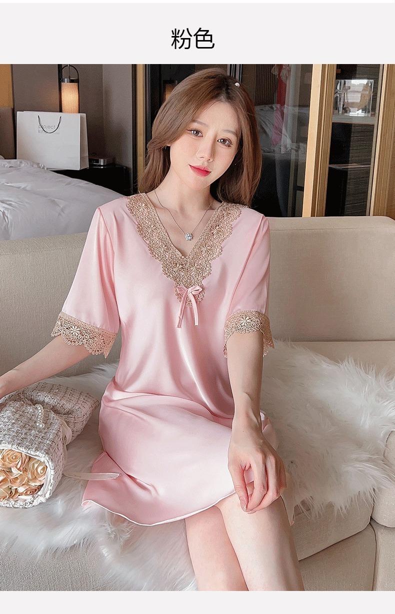 Pijamas para Mujer Verano Seda de Hielo Manga Corta Encaje Sexy Camisón de Seda de Alta Gama Verano Delgada Holgada Ropa para el Hogar