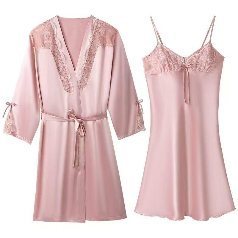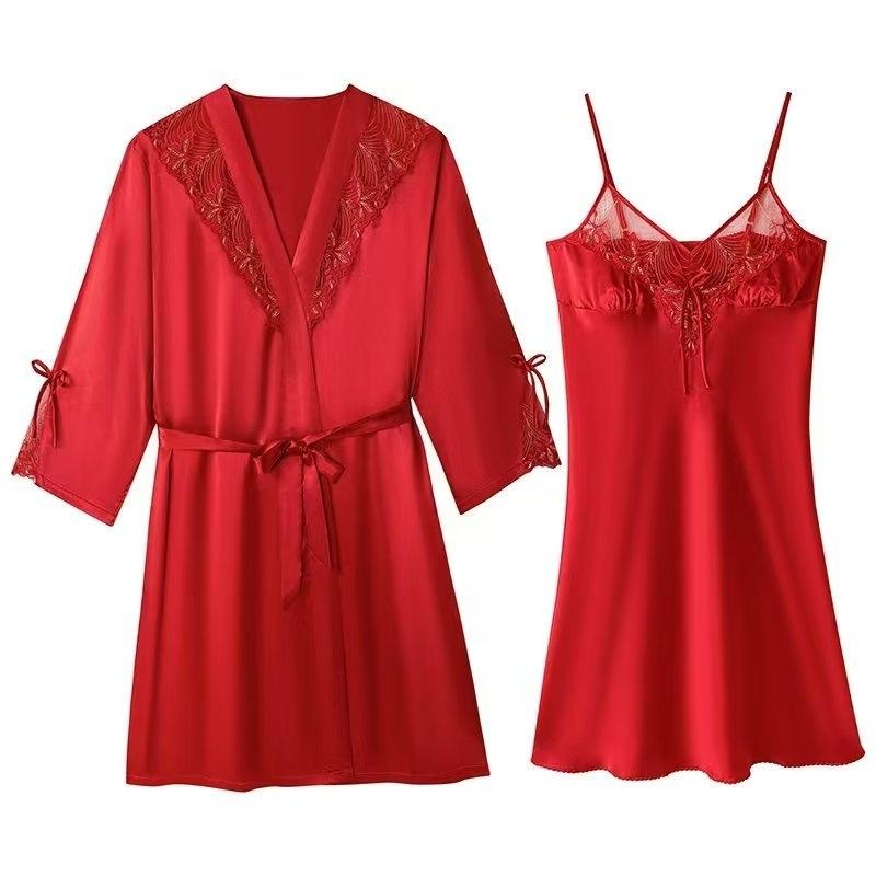 Estilo Caliente de Verano Camisón Sexy de Seda, Ropa Exterior de Alta Gama, Camisón de Encaje de Seda Fina con Tirantes Conjunto de Dos Piezas