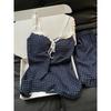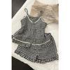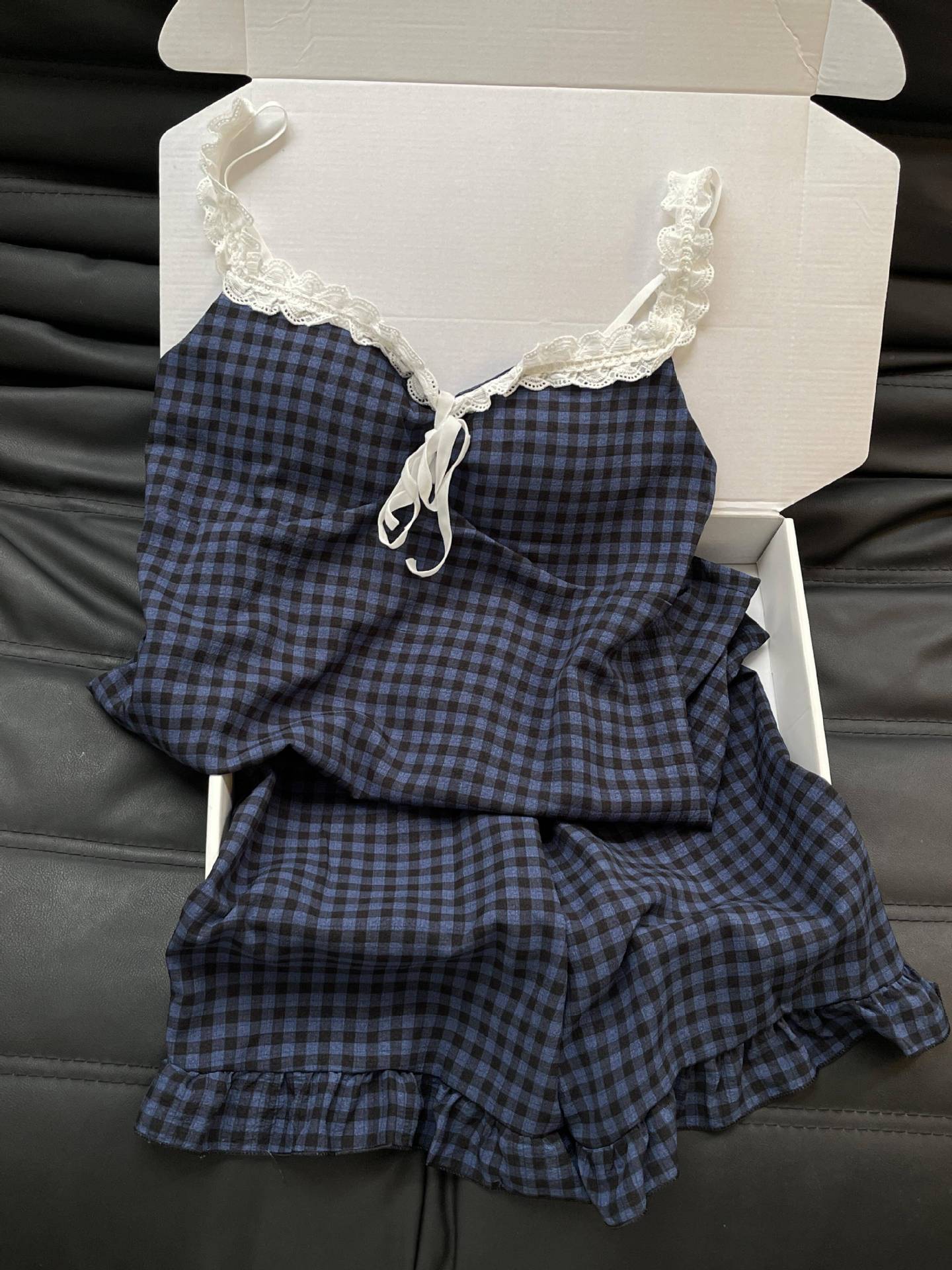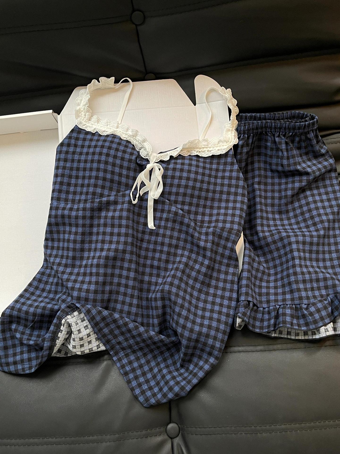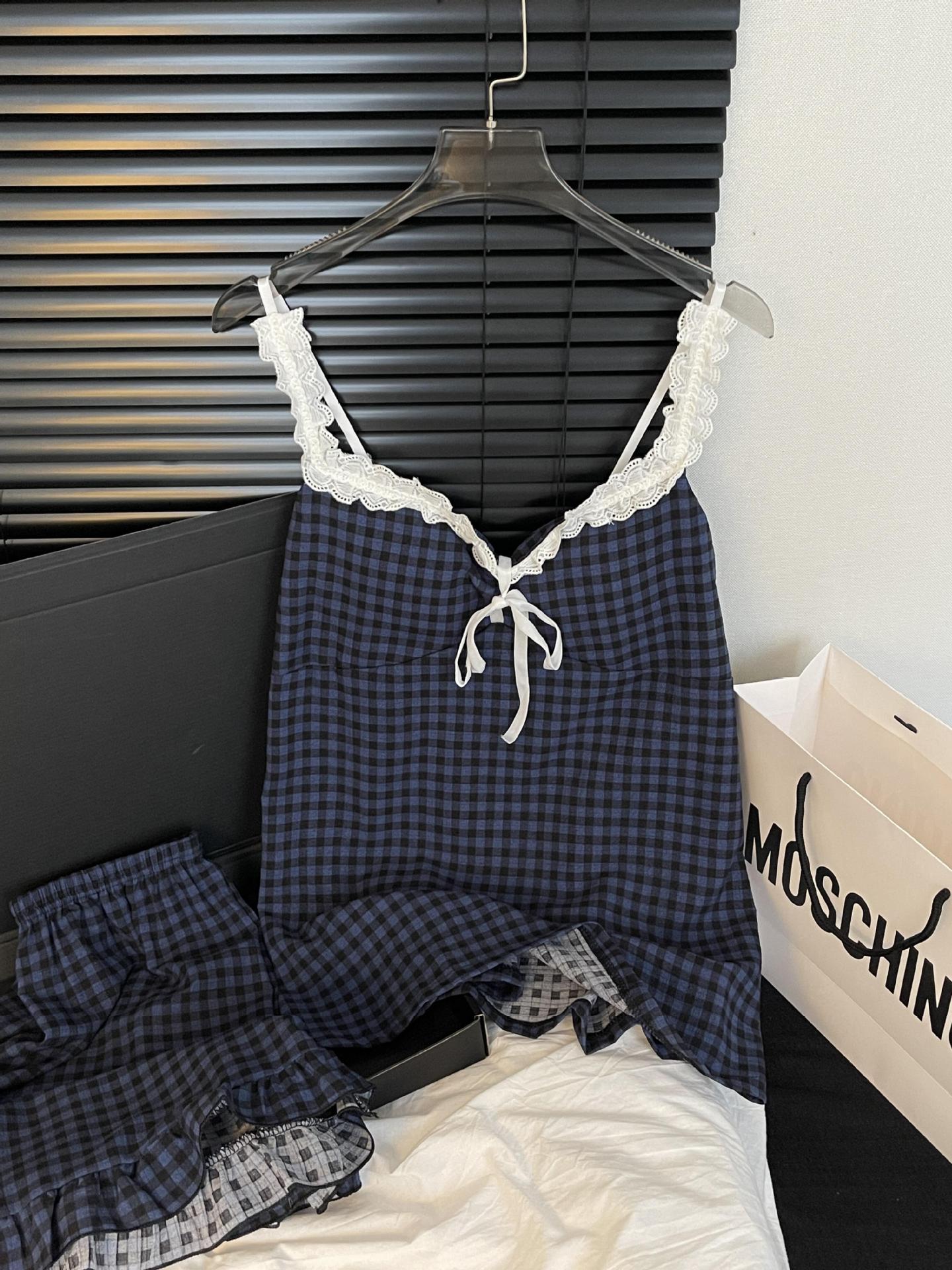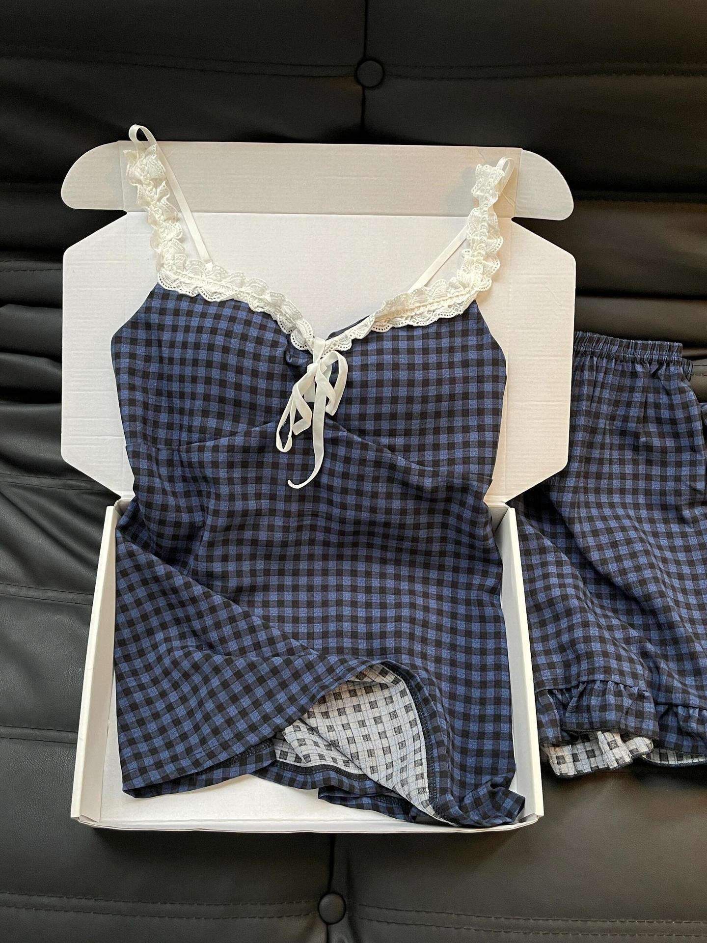 Pijama Coreano de Encaje a Cuadros Coreano Dulce y Lindo para Mujer Verano Nuevo Shorts de Tirantes Ropa para el Hogar Conjunto de Dos Piezas