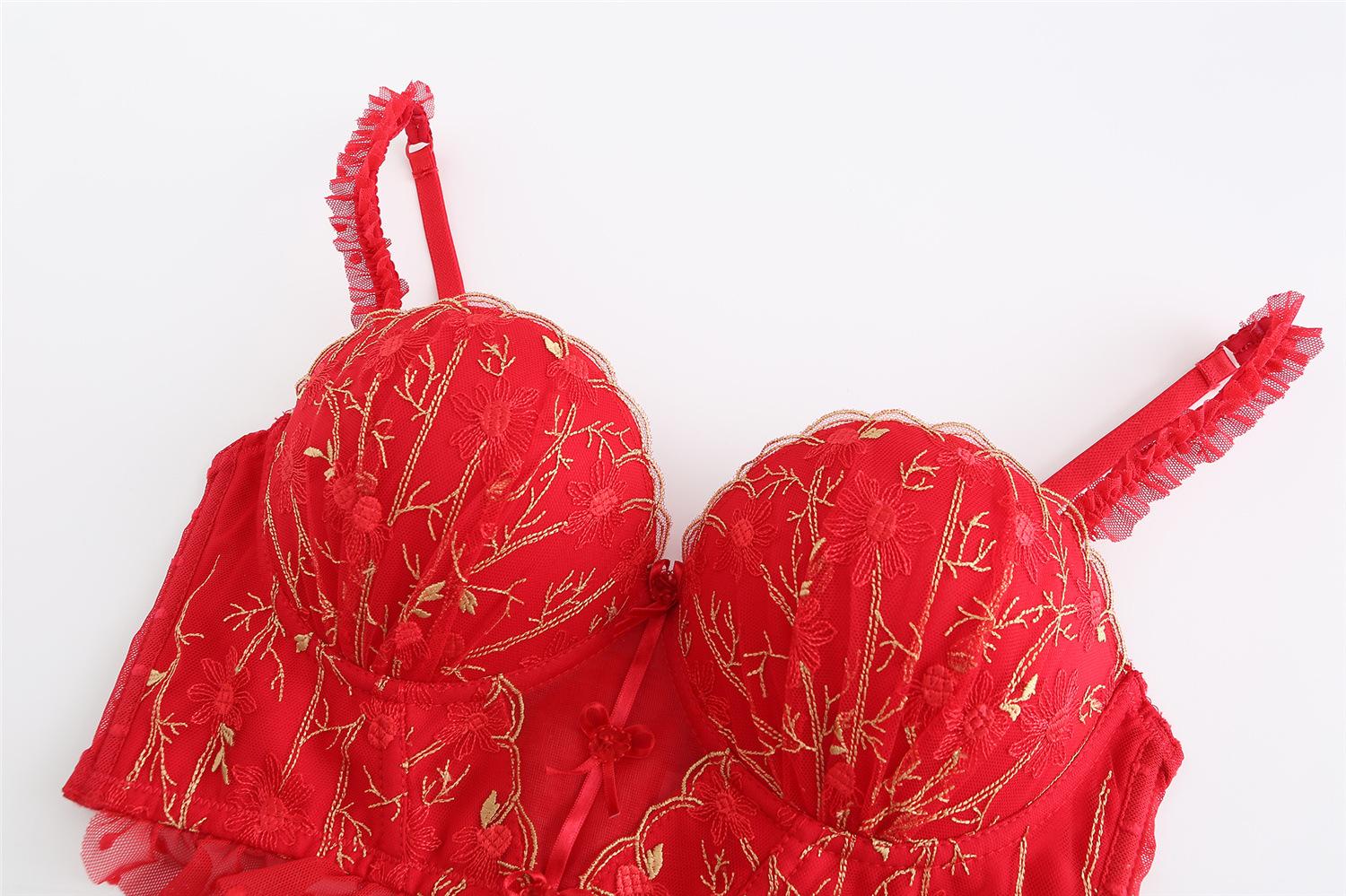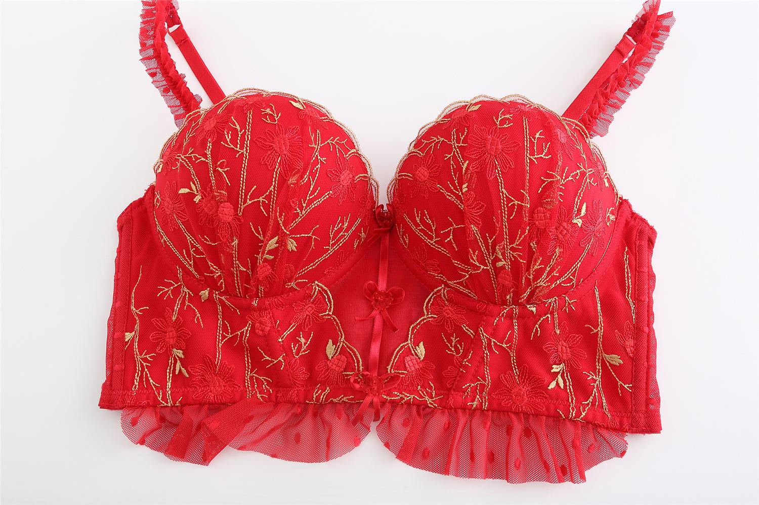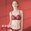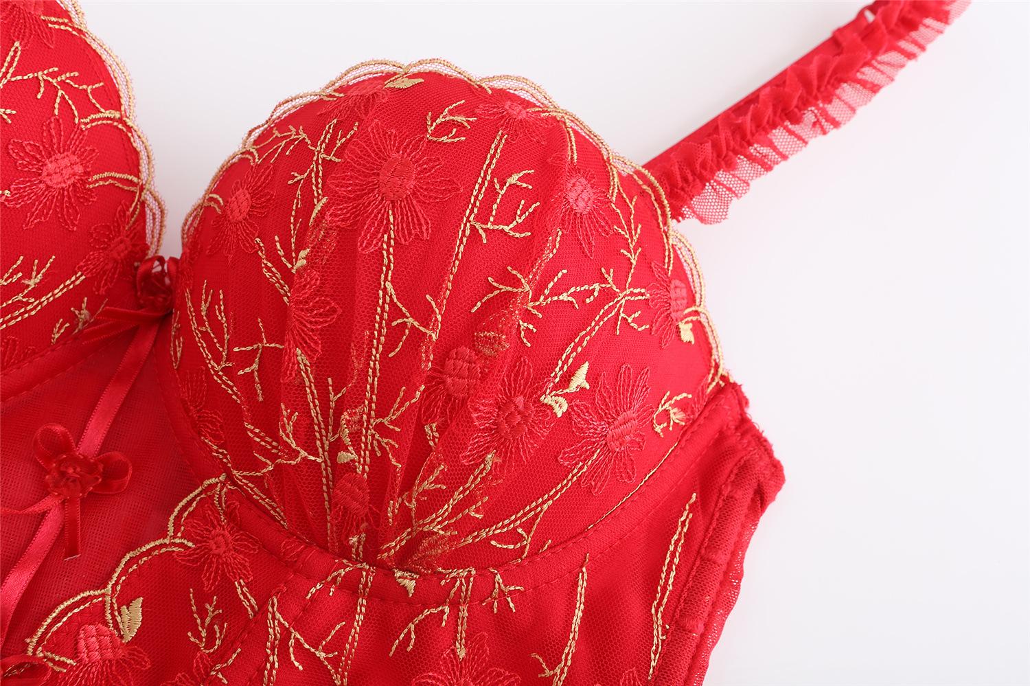 Traje de Ropa Interior Rojo Estilo Francés Boda Vida Año Encaje Pecho Pequeño Push-up Sujetador Sujetador Anti-flacidez para Mujer