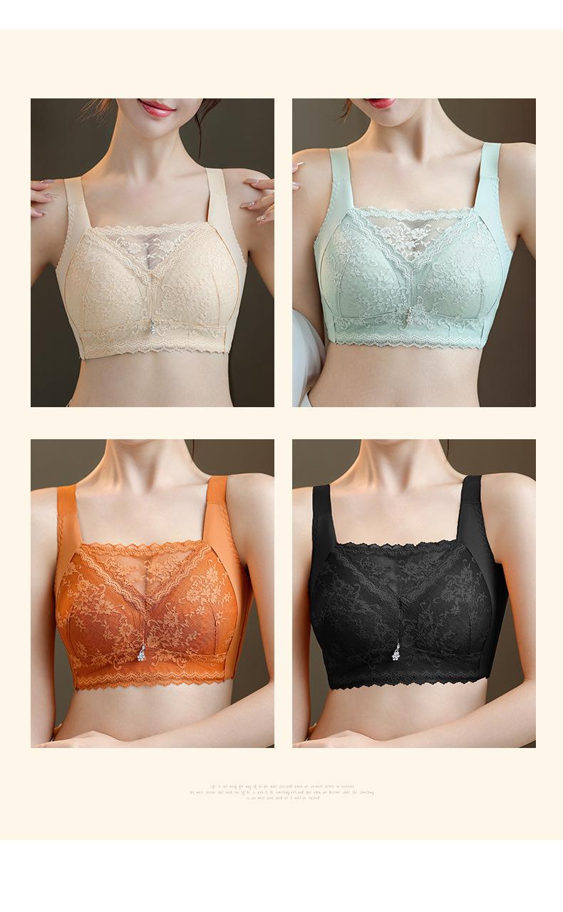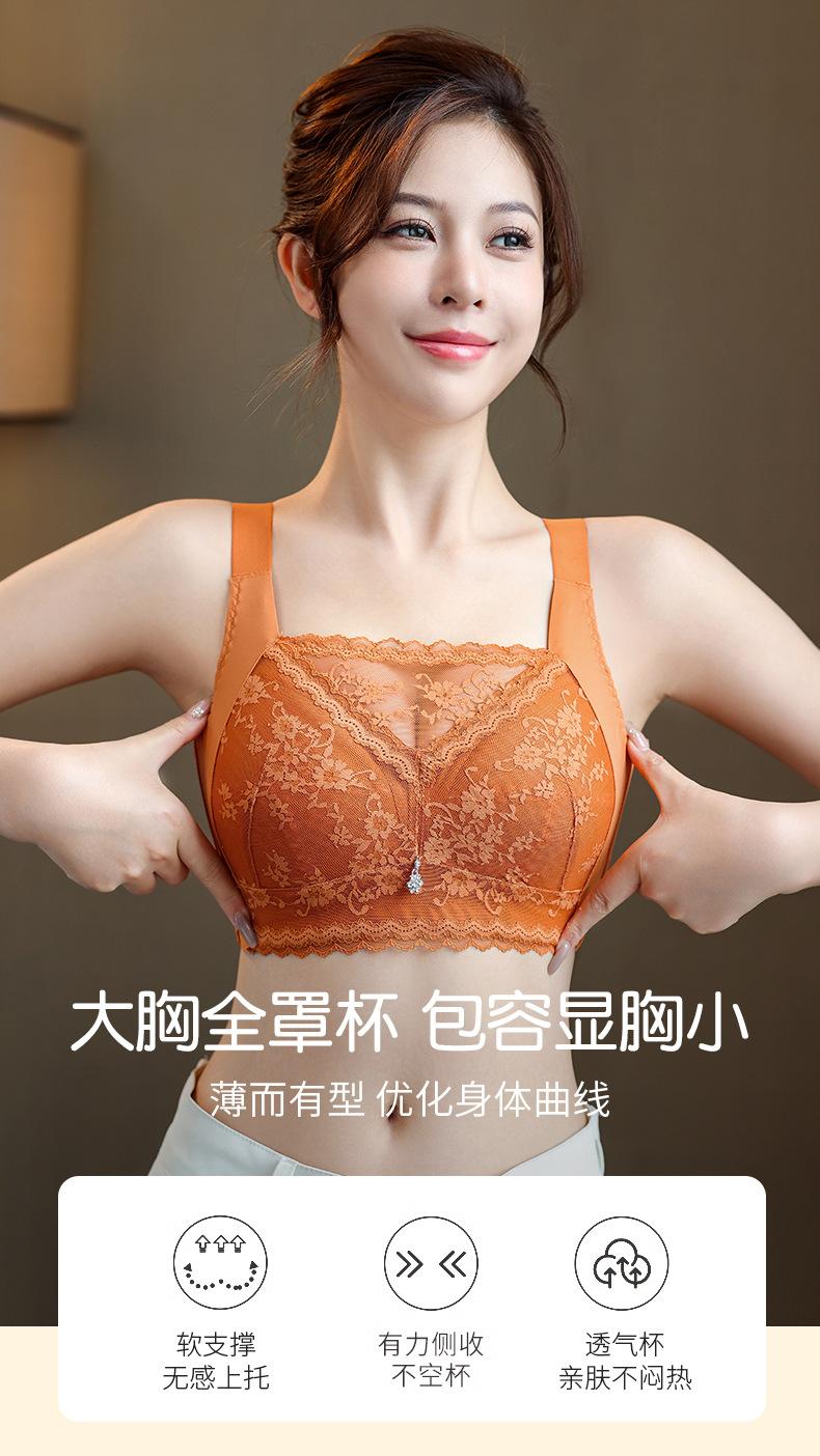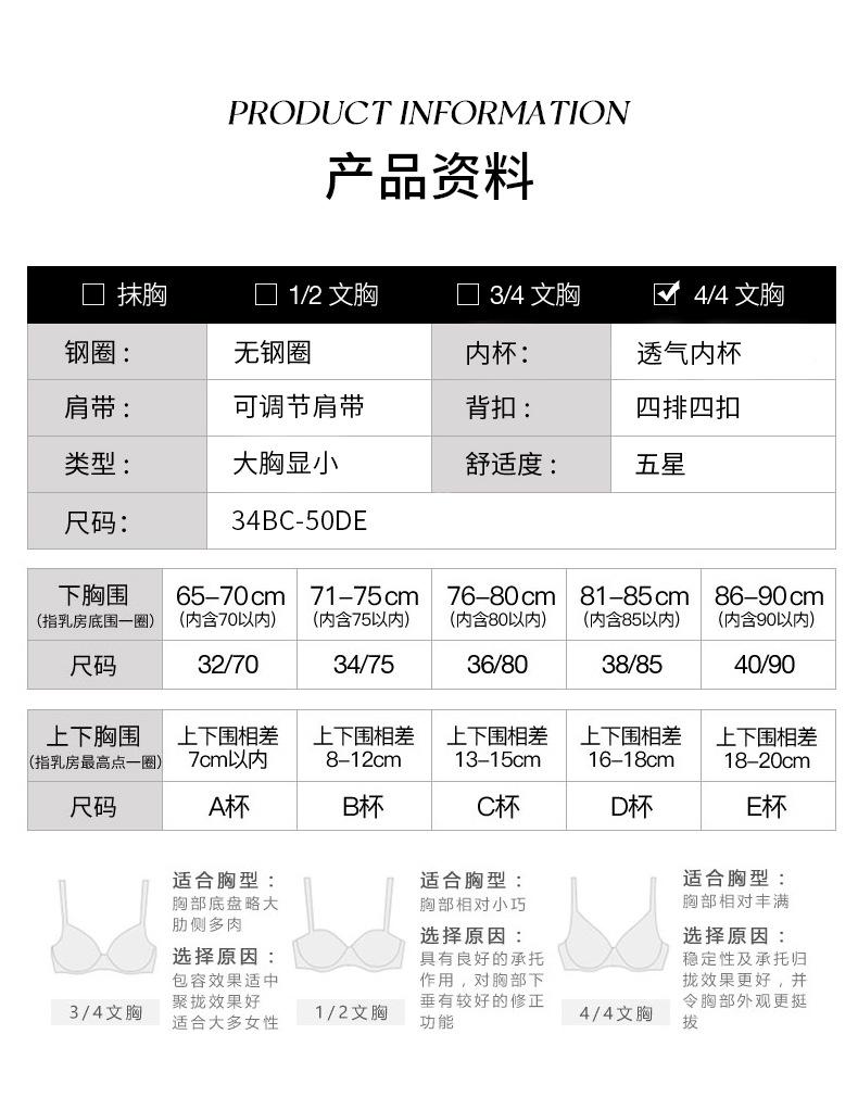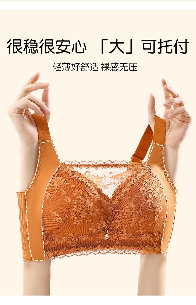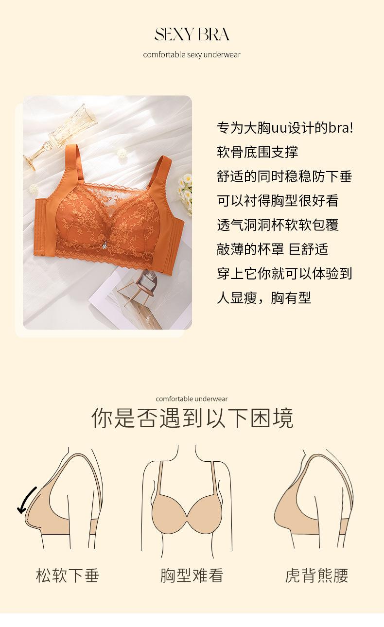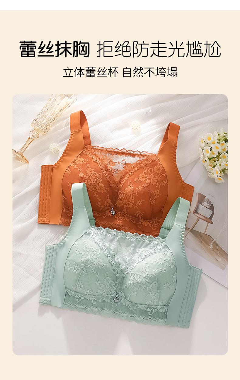 Este es un brasier de encaje de talla grande, con un diseño para prevenir la exposición, disponible en cuatro colores: caramelo/nude/verde/negro, las tallas varían de 34-42 copa BC, 36-50 copa DE, con tejido lateral de corte libre y un cierre trasero de gancho y ojo de cuatro filas. Se vende como una sola pieza sin bragas a juego.