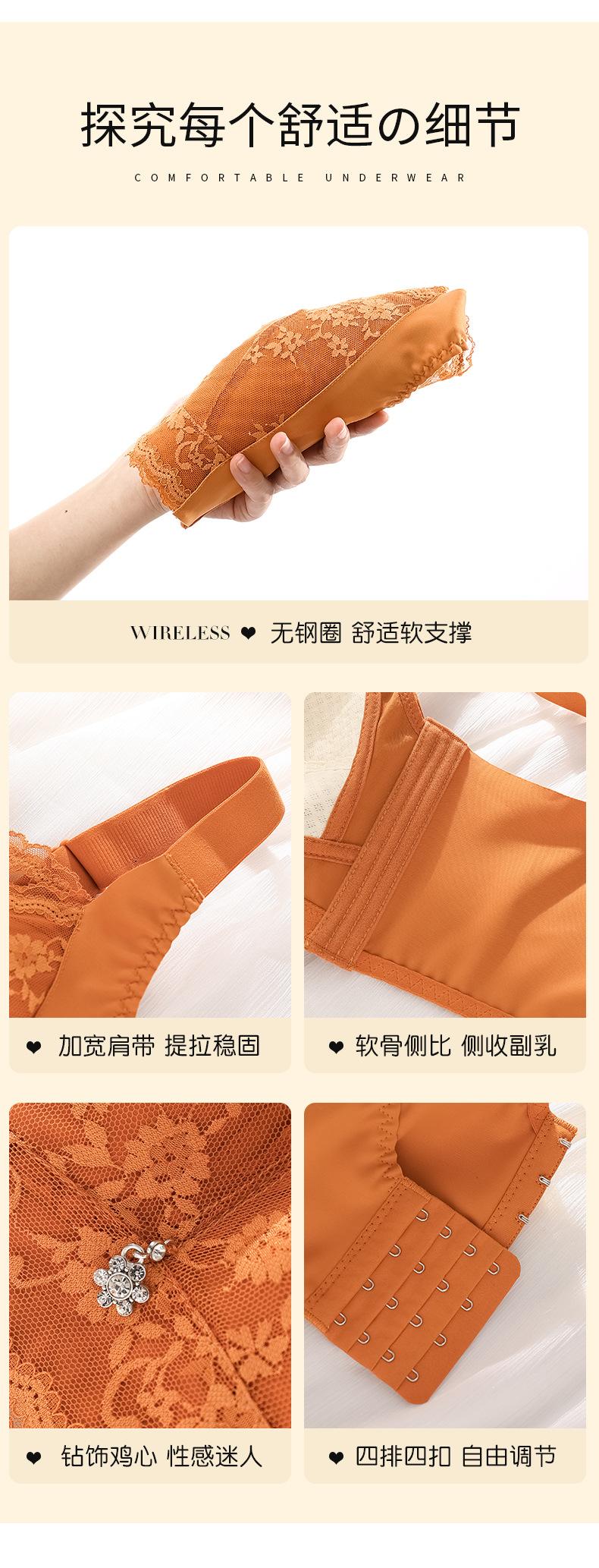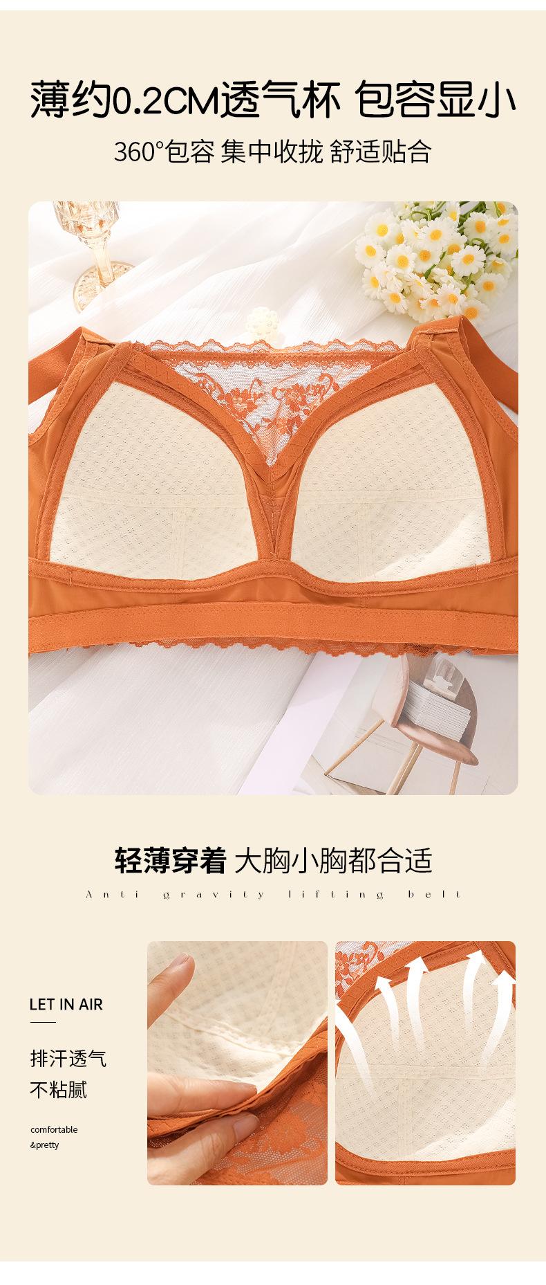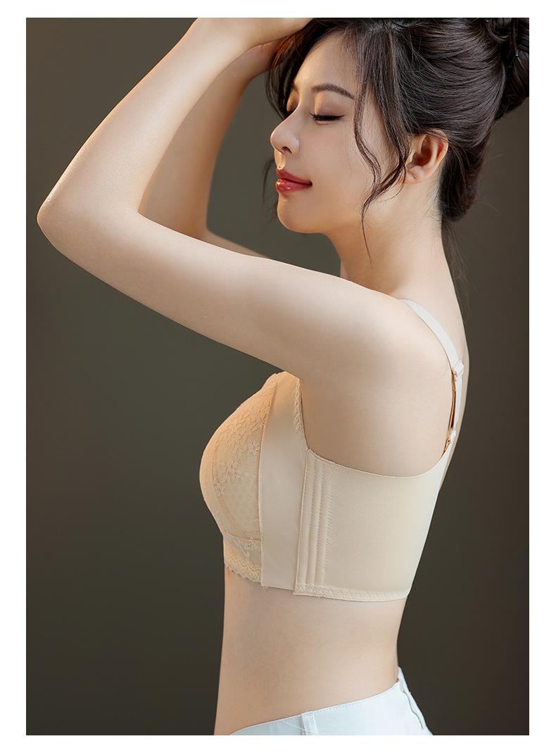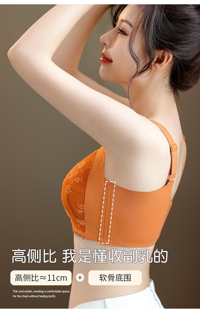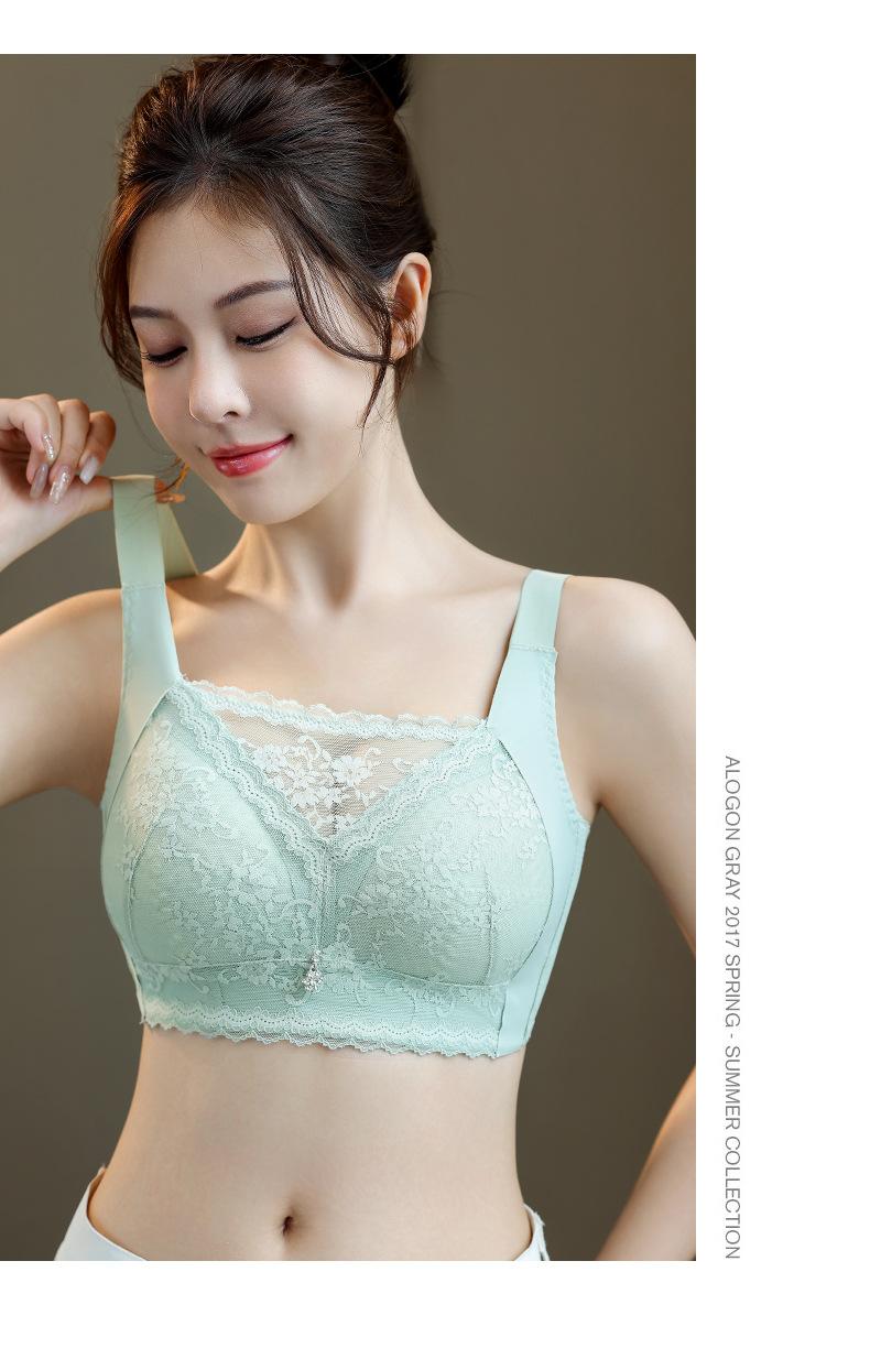 Este es un brasier de encaje de talla grande, con un diseño para prevenir la exposición, disponible en cuatro colores: caramelo/nude/verde/negro, las tallas varían de 34-42 copa BC, 36-50 copa DE, con tejido lateral de corte libre y un cierre trasero de gancho y ojo de cuatro filas. Se vende como una sola pieza sin bragas a juego.