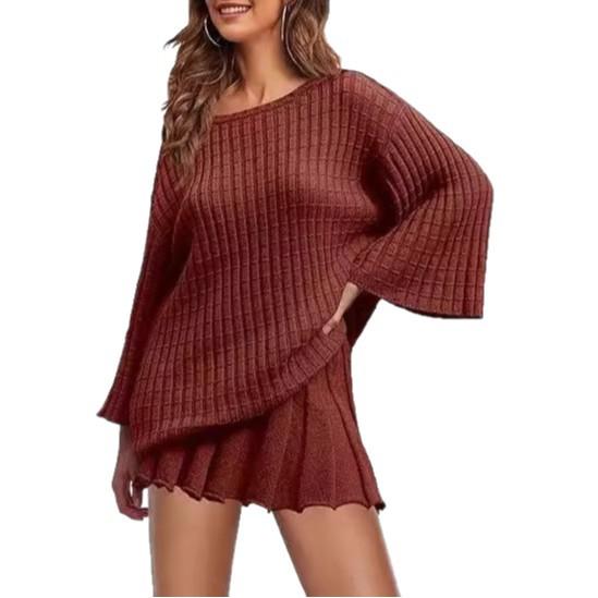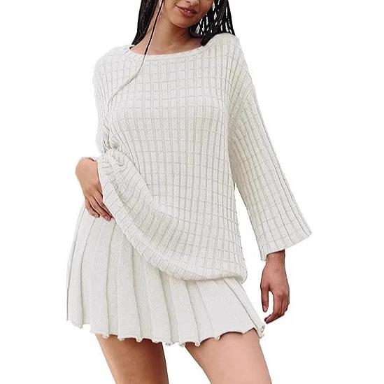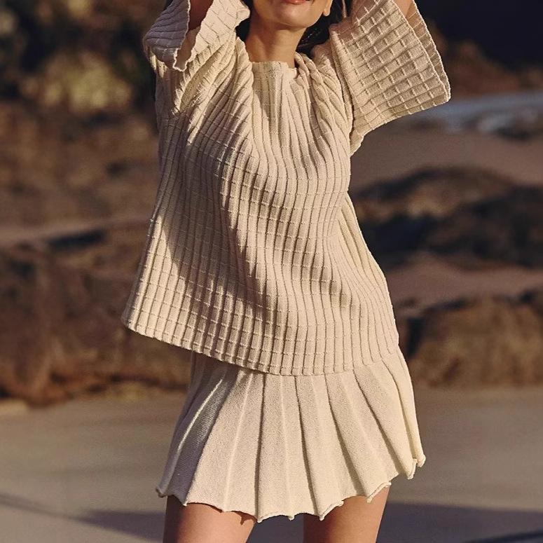 Falda plisada de punto a rayas nueva para mujer de primavera y verano transfronteriza europea y americana, traje casual de suéter de color puro de manga larga