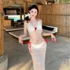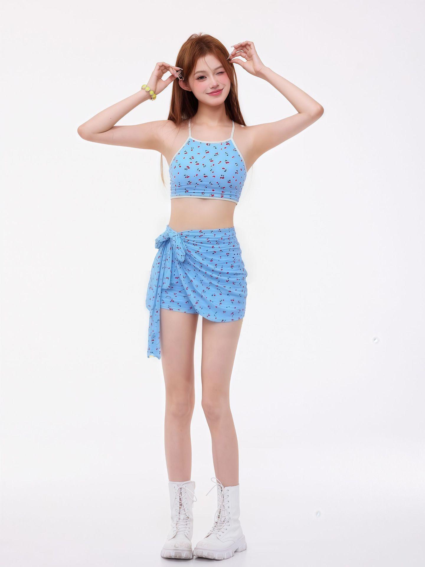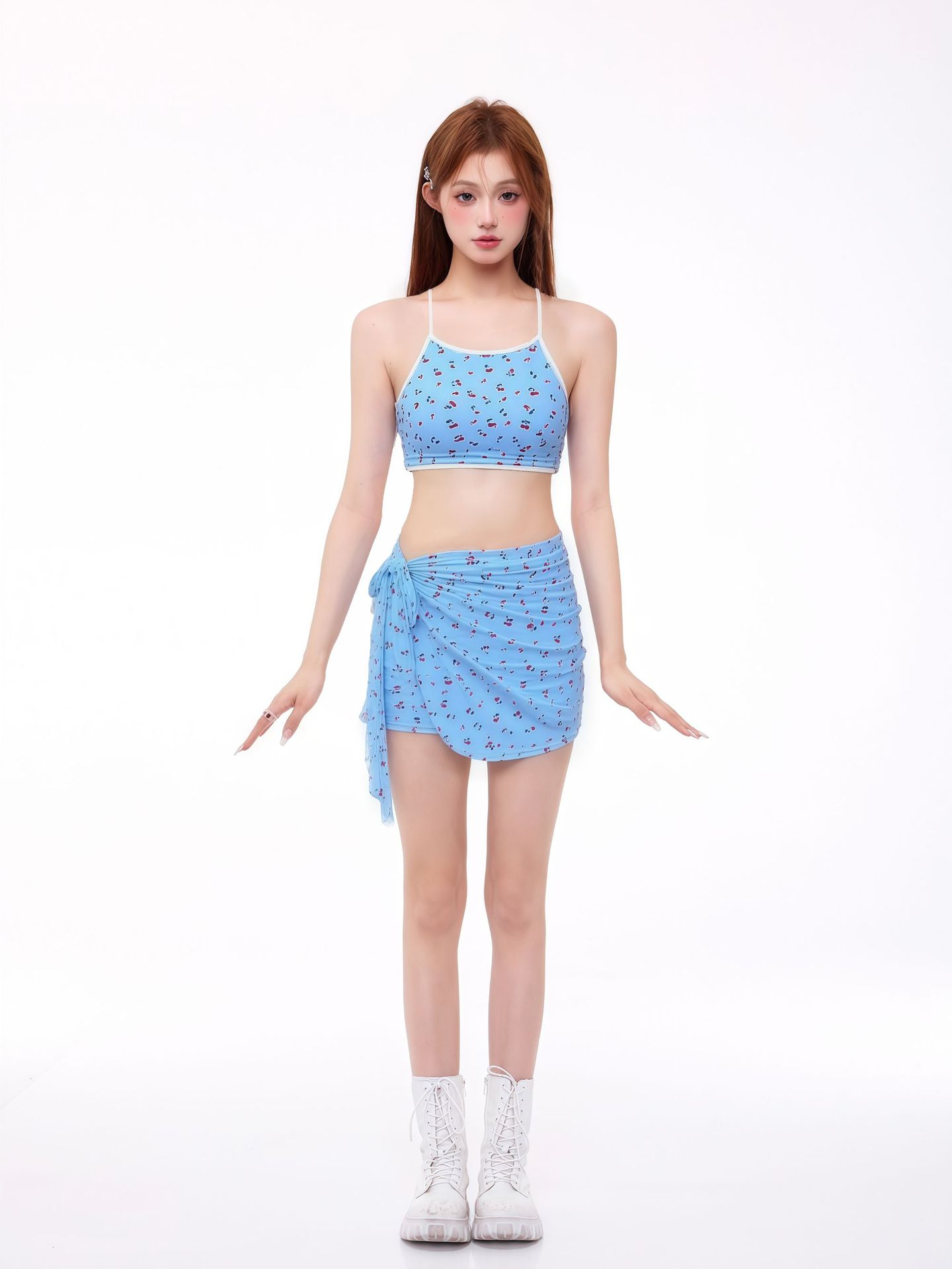 Traje de baño de tres piezas halter con estampado de cerezas lindo 2025 para busto pequeño, falda dividida, traje de baño para resort de aguas termales para mujer