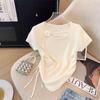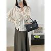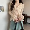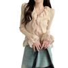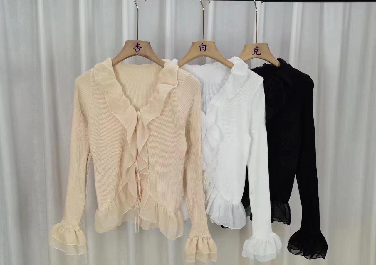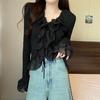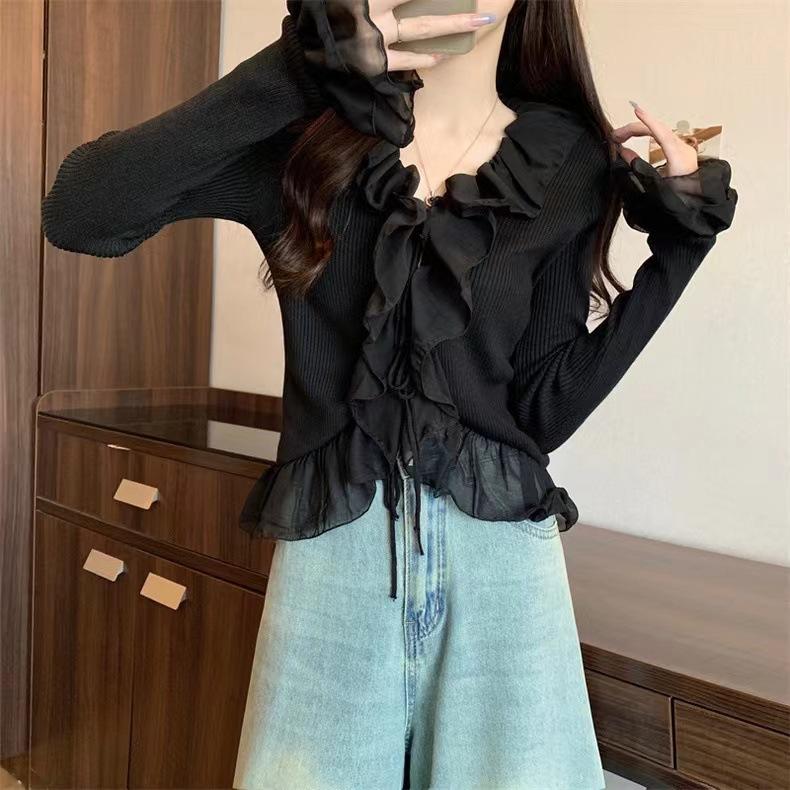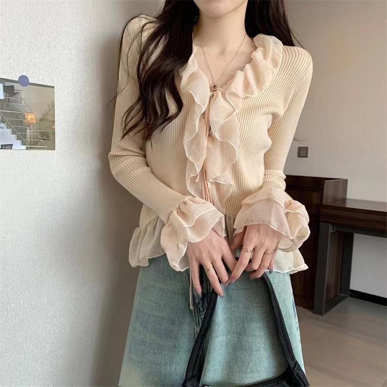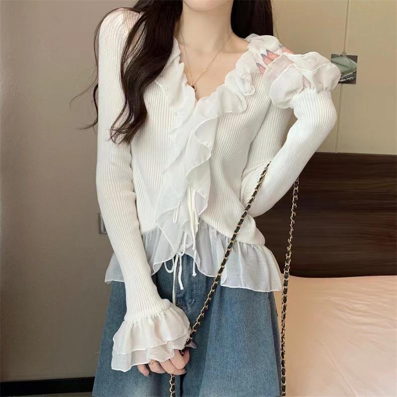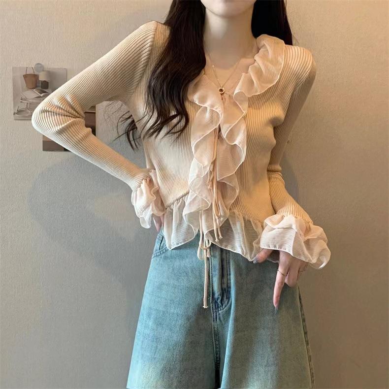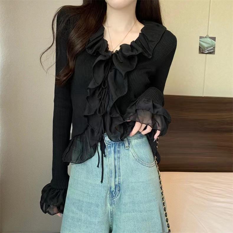Camiseta de Punto Top de Chifón con Volantes para Mujer Estilo Coreano Spice Girl Primavera Diseño Corto Manga Larga Pura Ropa Adelgazante Nicho