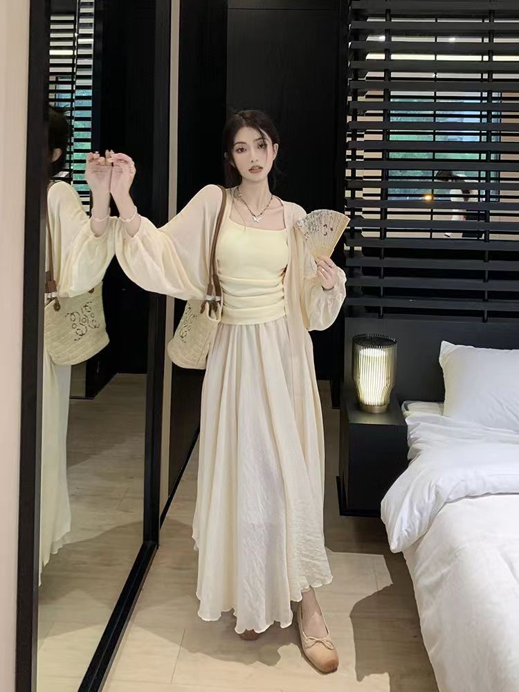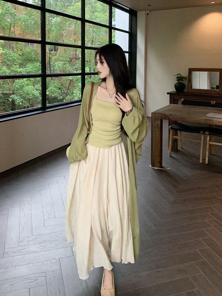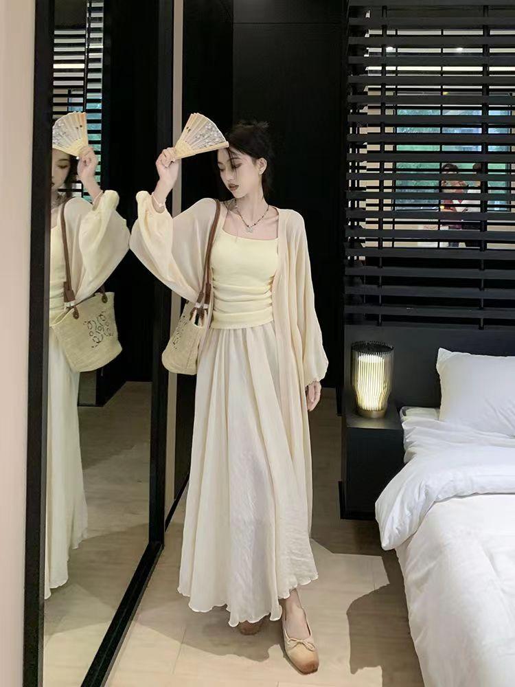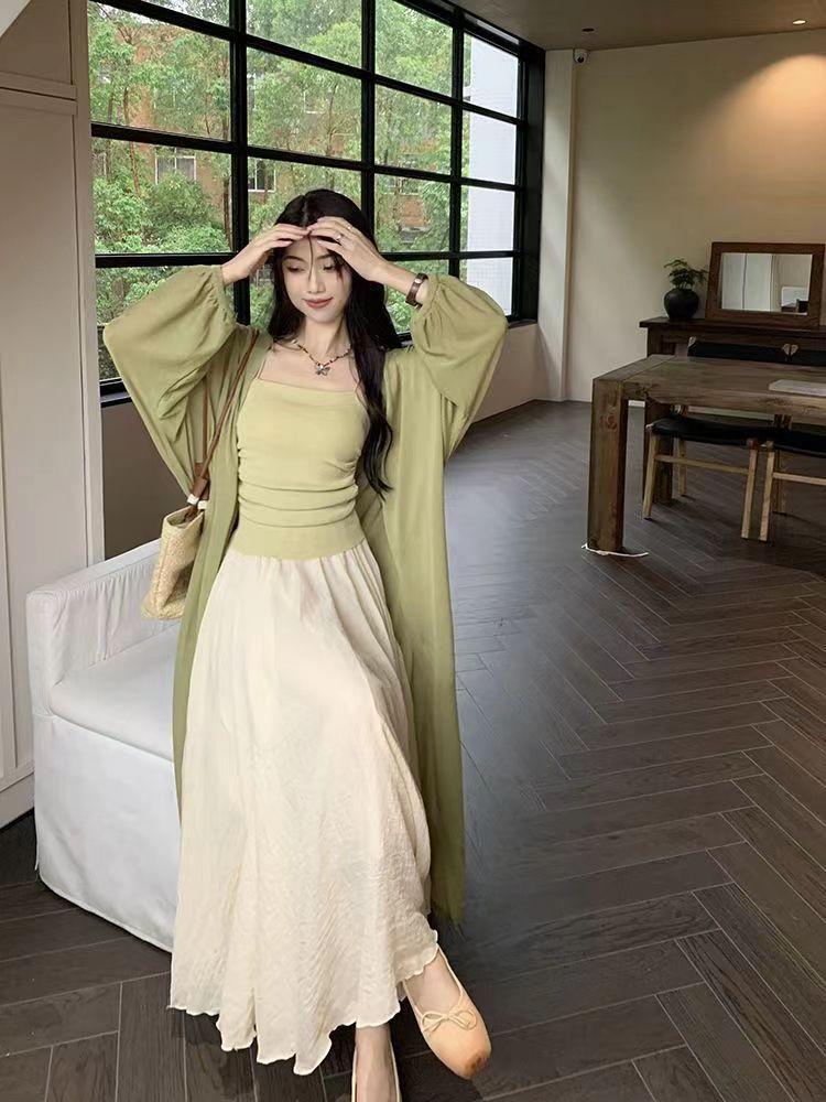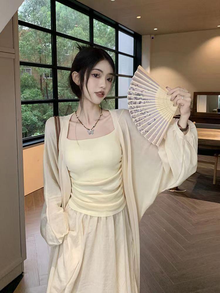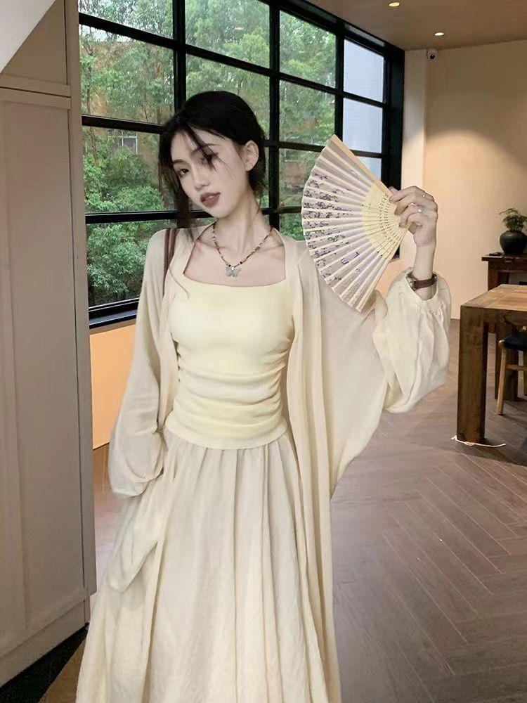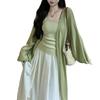 Cárdigan Largo con Protección Solar Camisola Plisada Falda de Hada 2024 Nuevo Vestido Delicado Conjunto de Dos Piezas