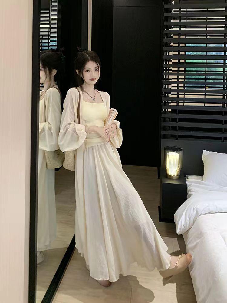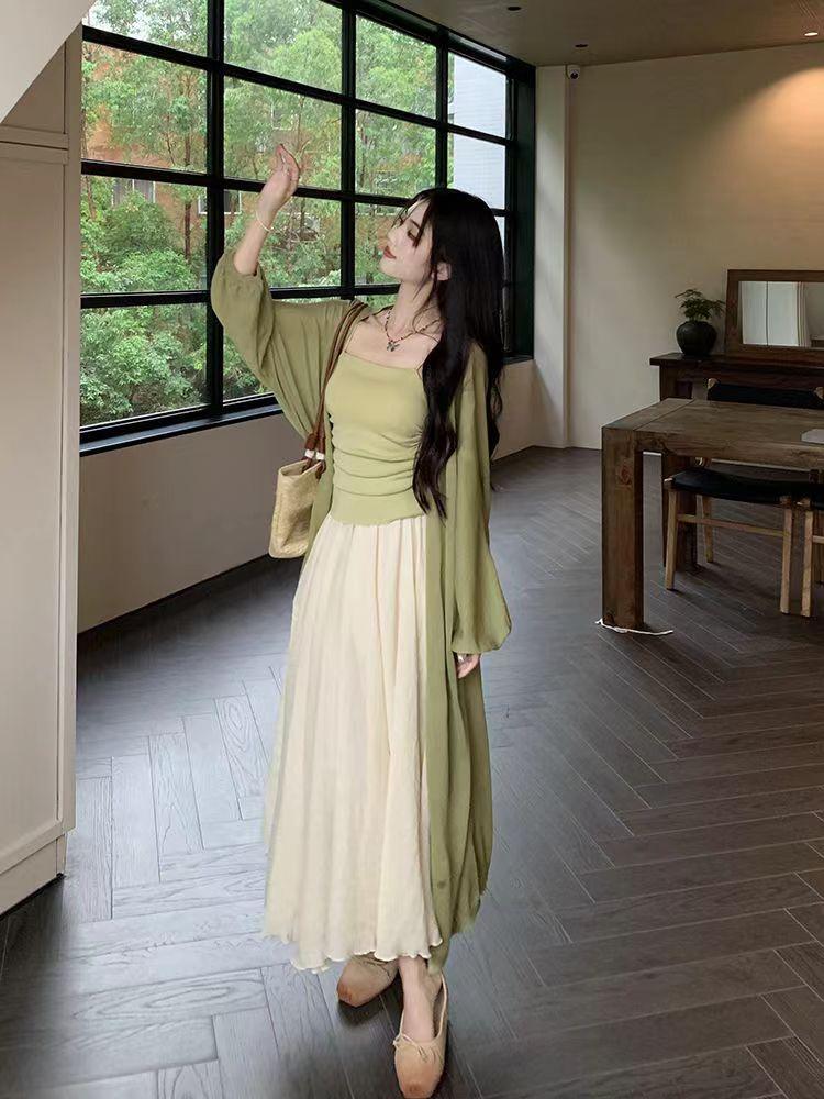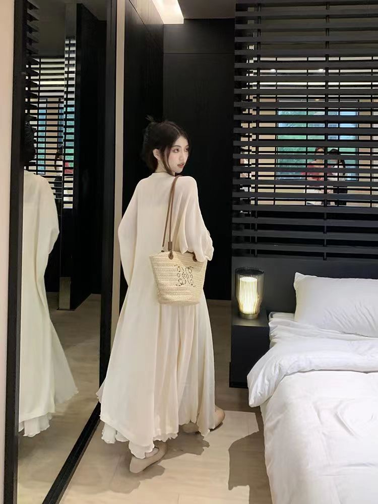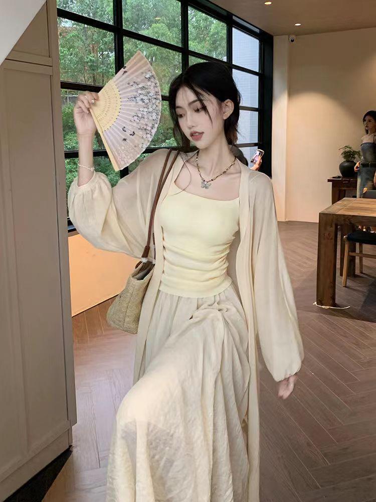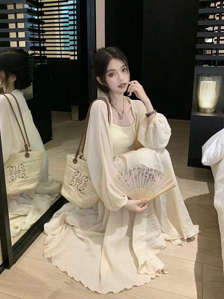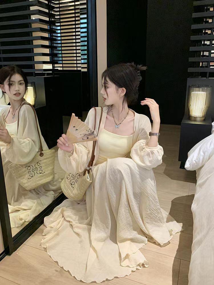 Cárdigan Largo con Protección Solar Camisola Plisada Falda de Hada 2024 Nuevo Vestido Delicado Conjunto de Dos Piezas