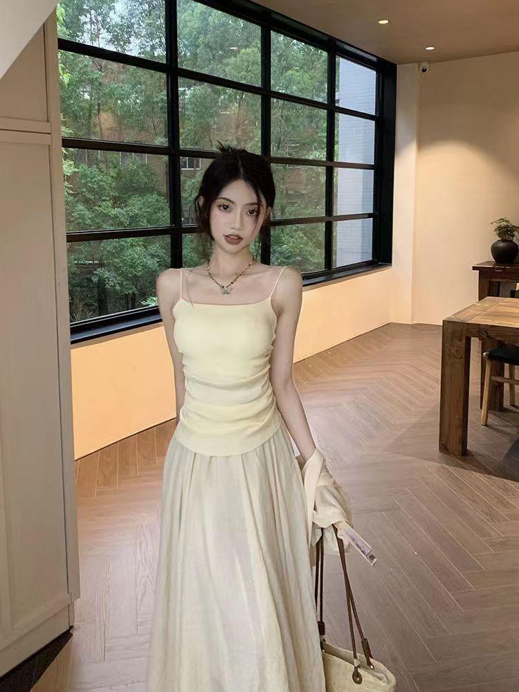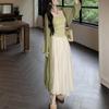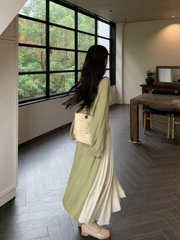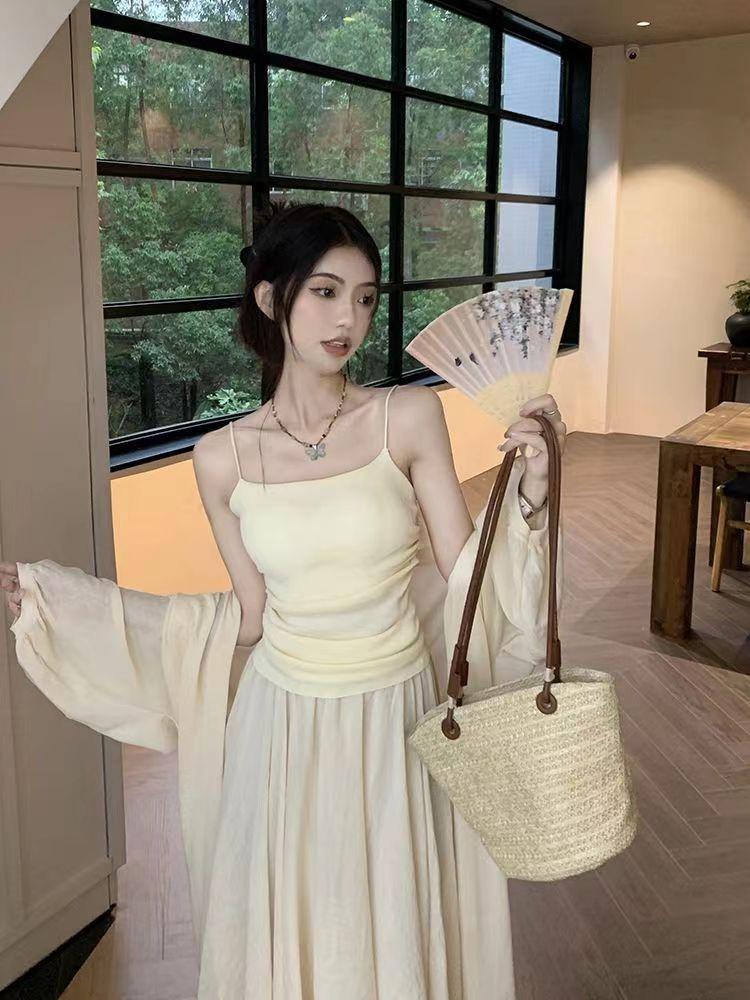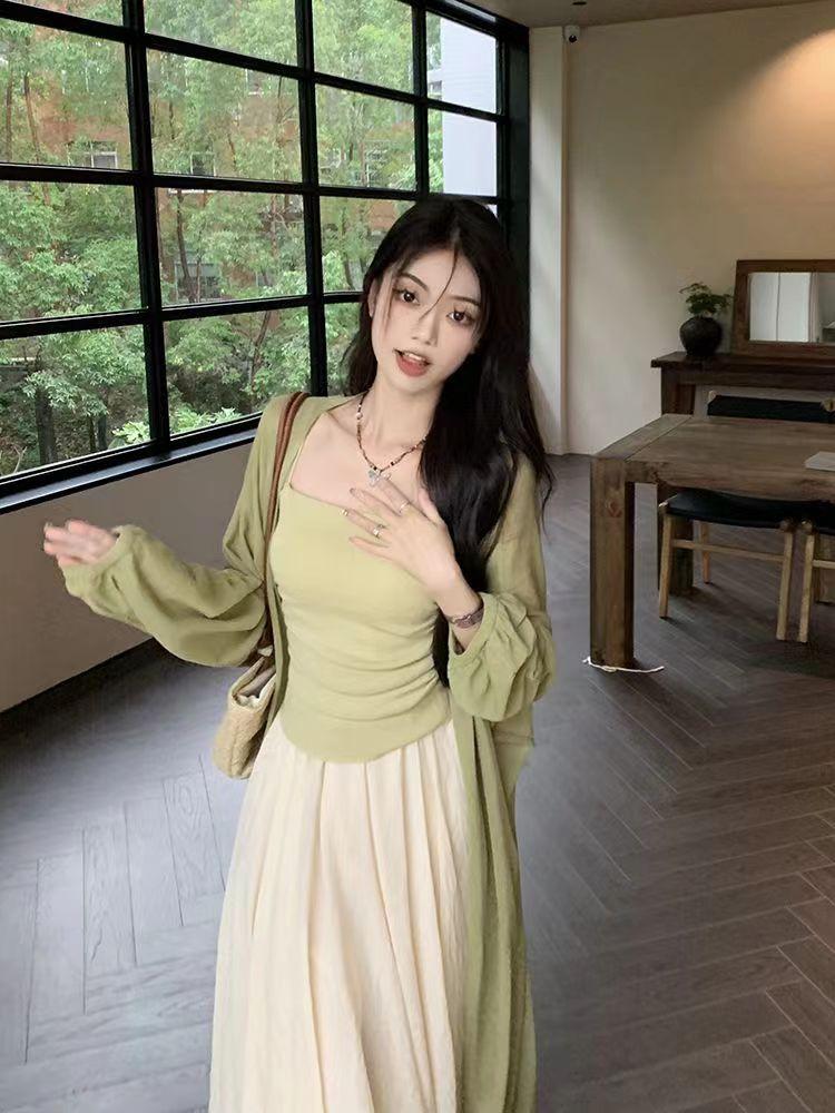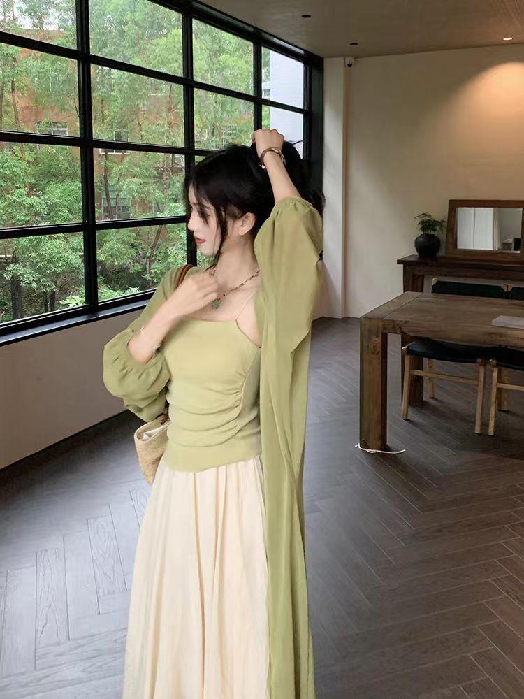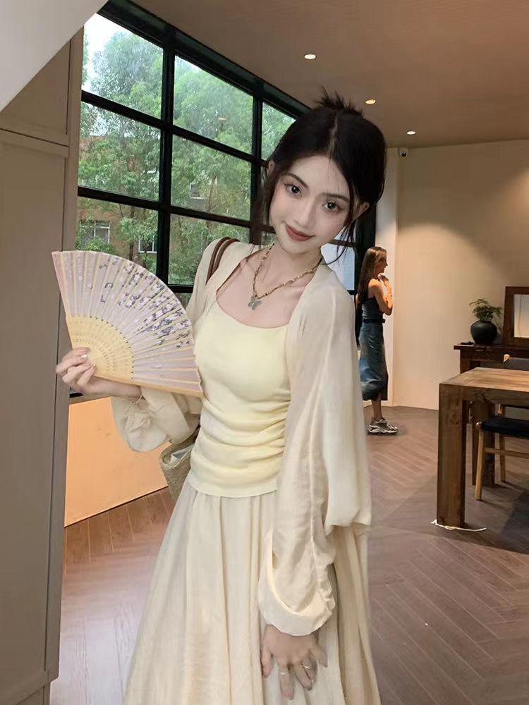 Cárdigan Largo con Protección Solar Camisola Plisada Falda de Hada 2024 Nuevo Vestido Delicado Conjunto de Dos Piezas