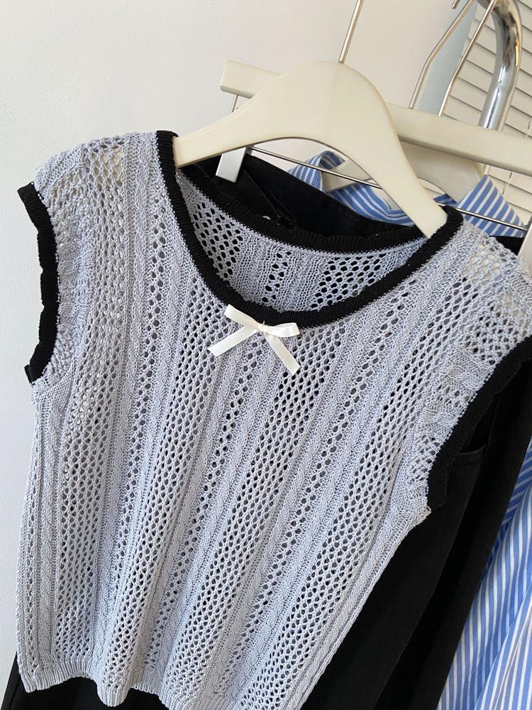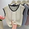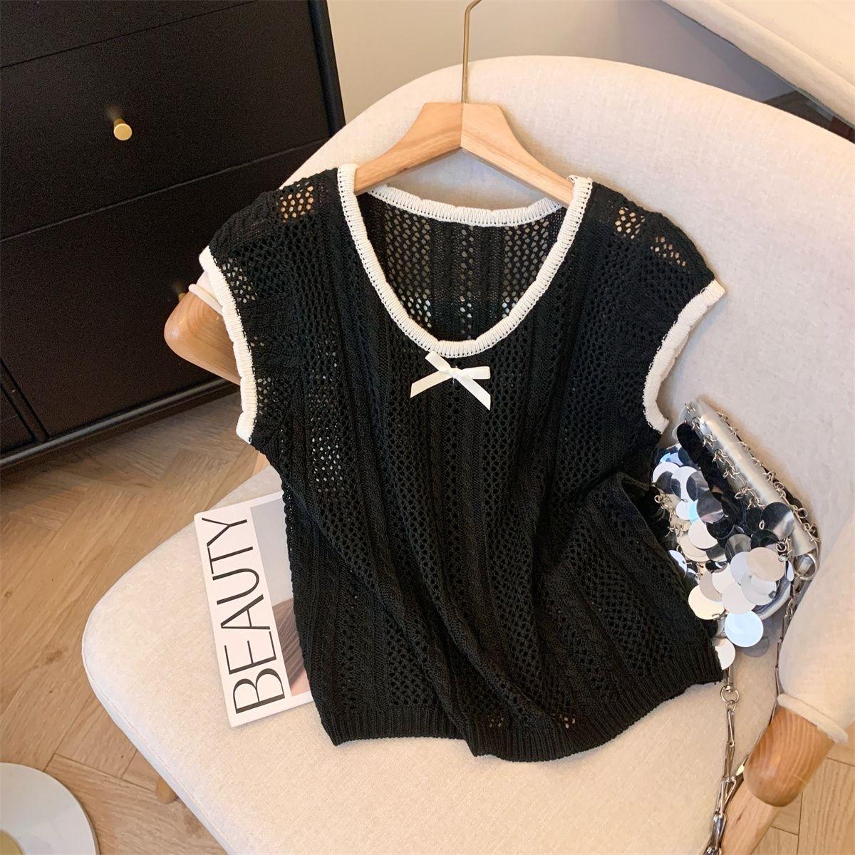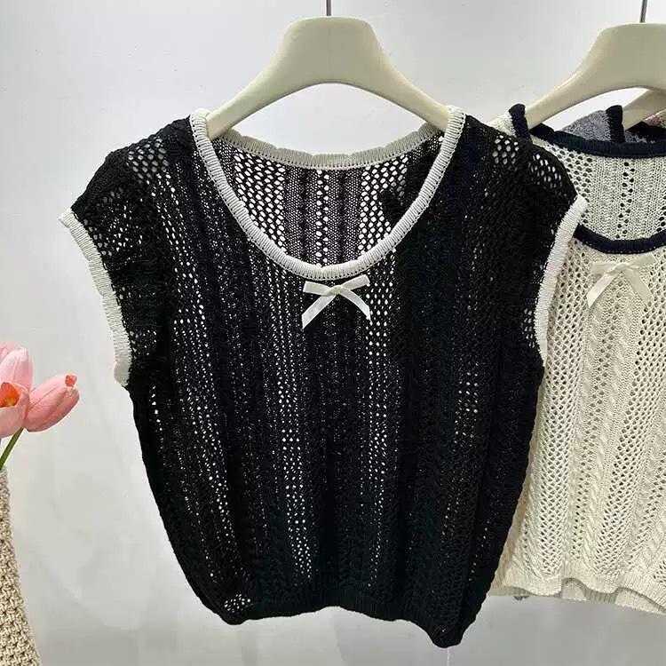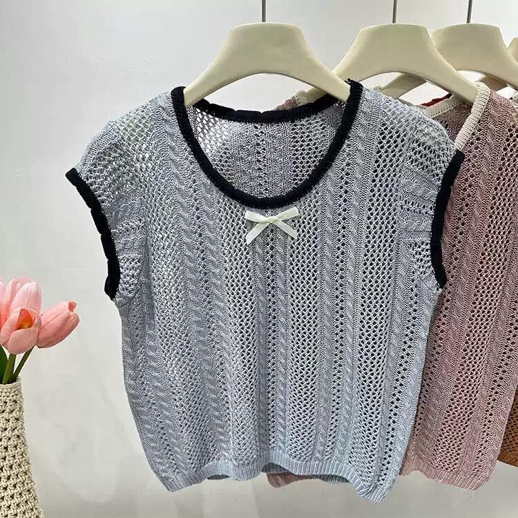 Suéter Calado con Lazo Estilo Coreano para Mujer Verano Sin Mangas Cuello Redondo Holgado y Elegante Prendas Exteriores Jersey Top