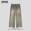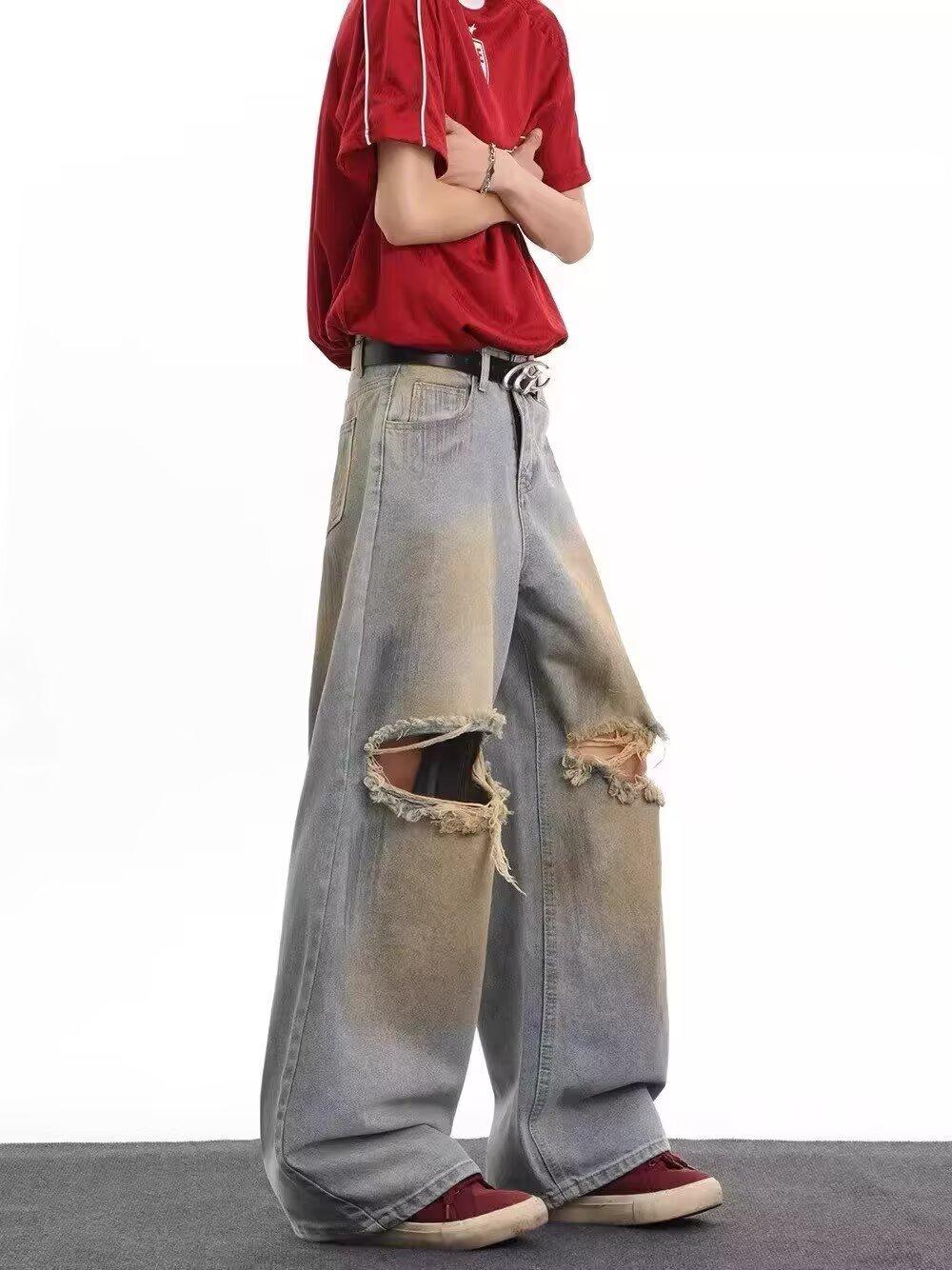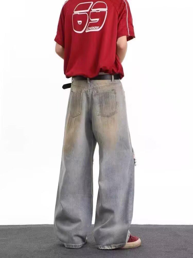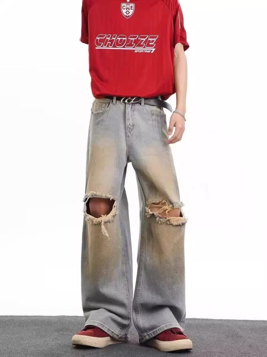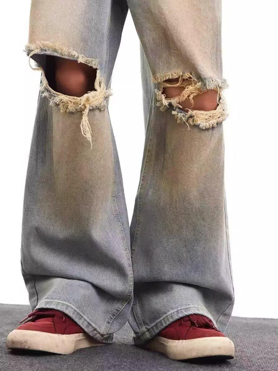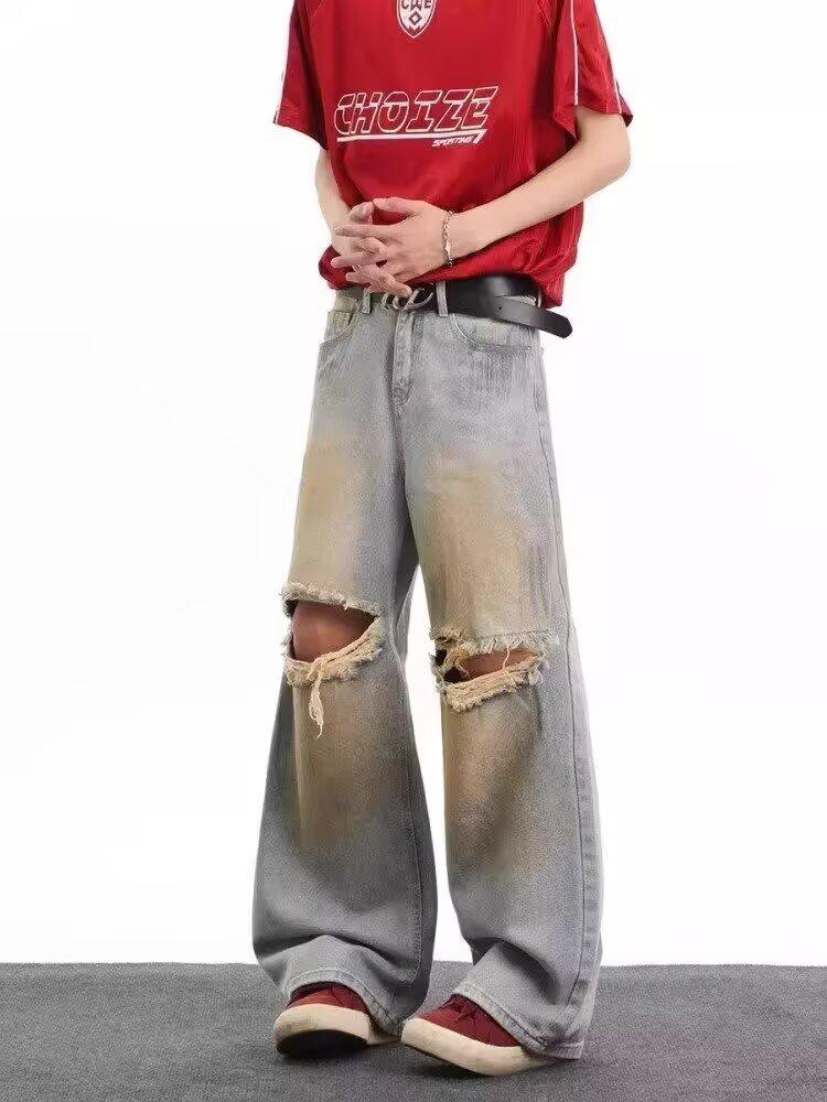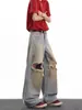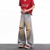 Jeans rectos rasgados lavados retro de moda estilo americano para hombres y mujeres, pantalones casuales versátiles holgados y geniales para la calle de pierna ancha