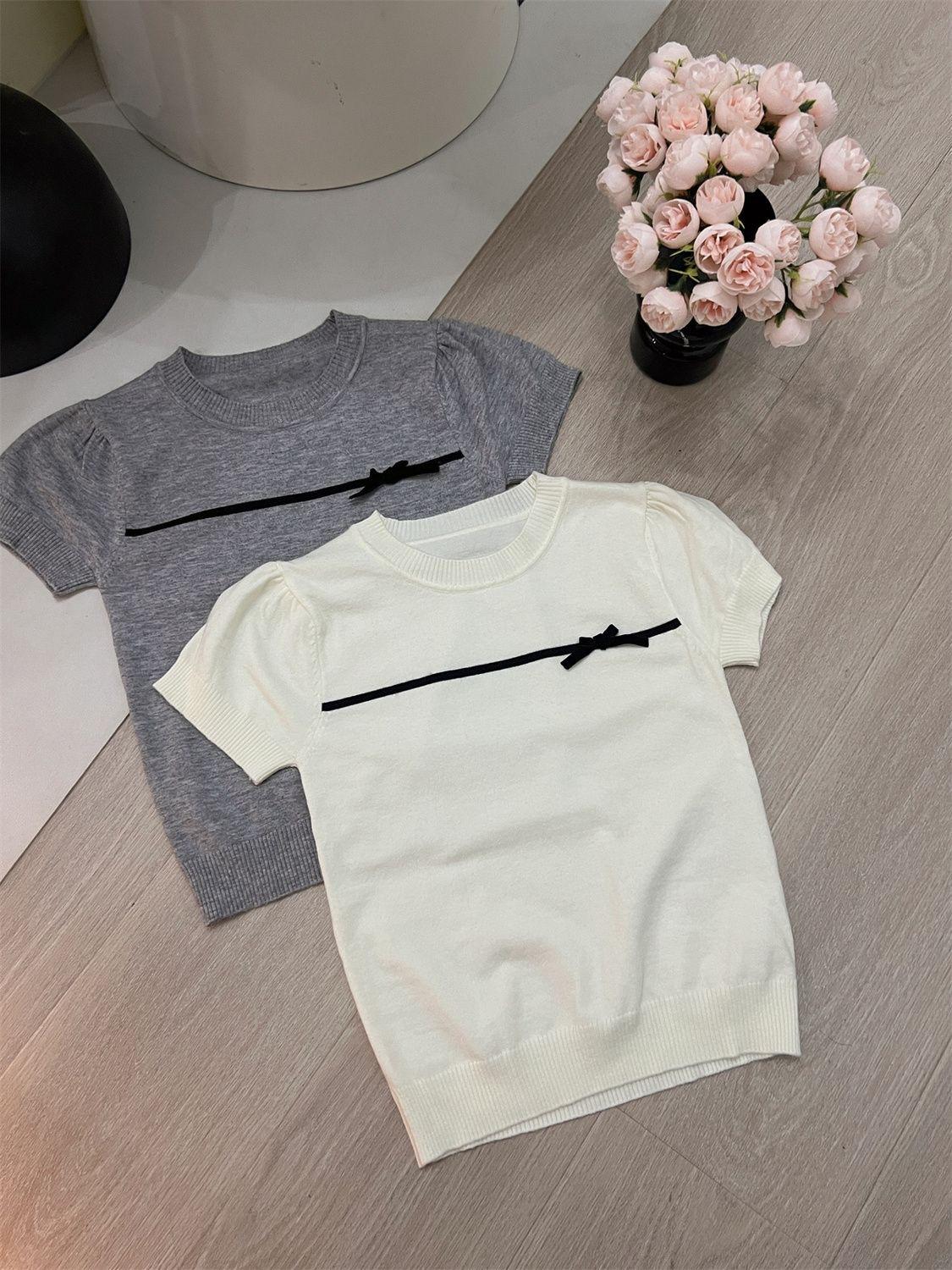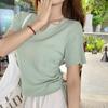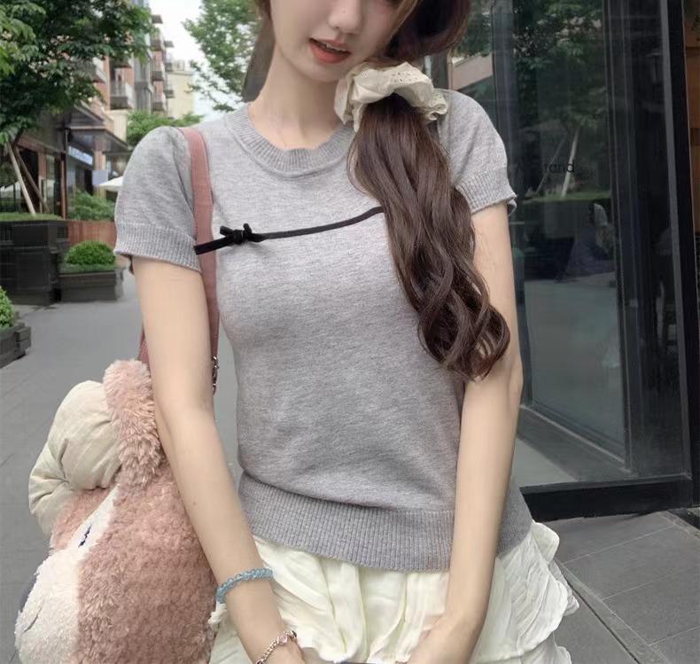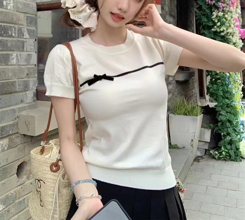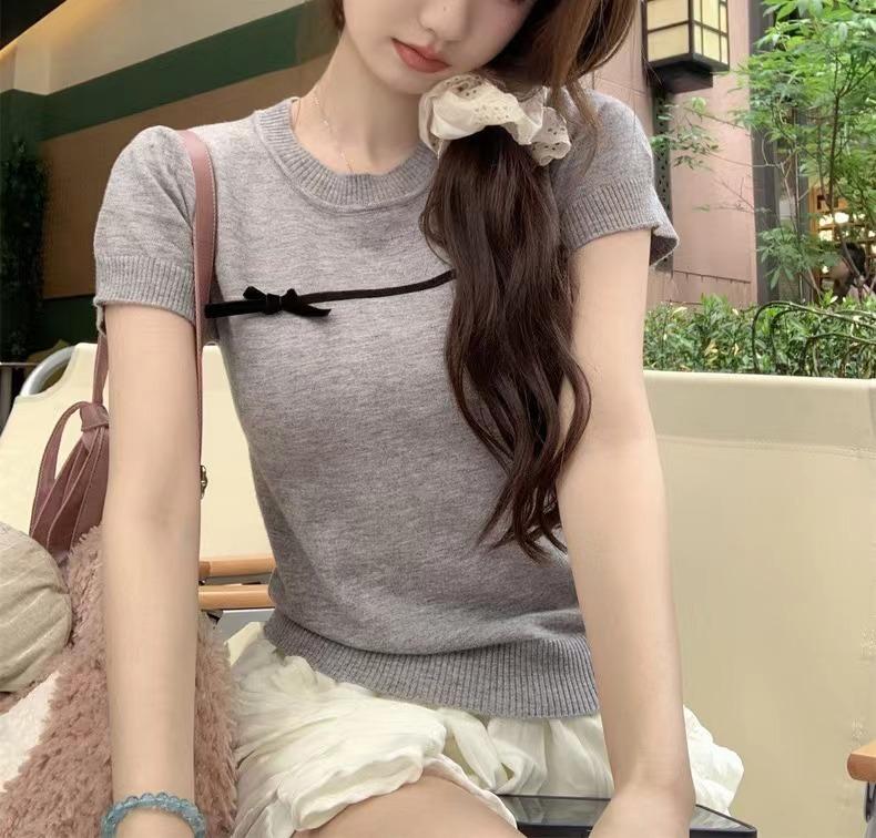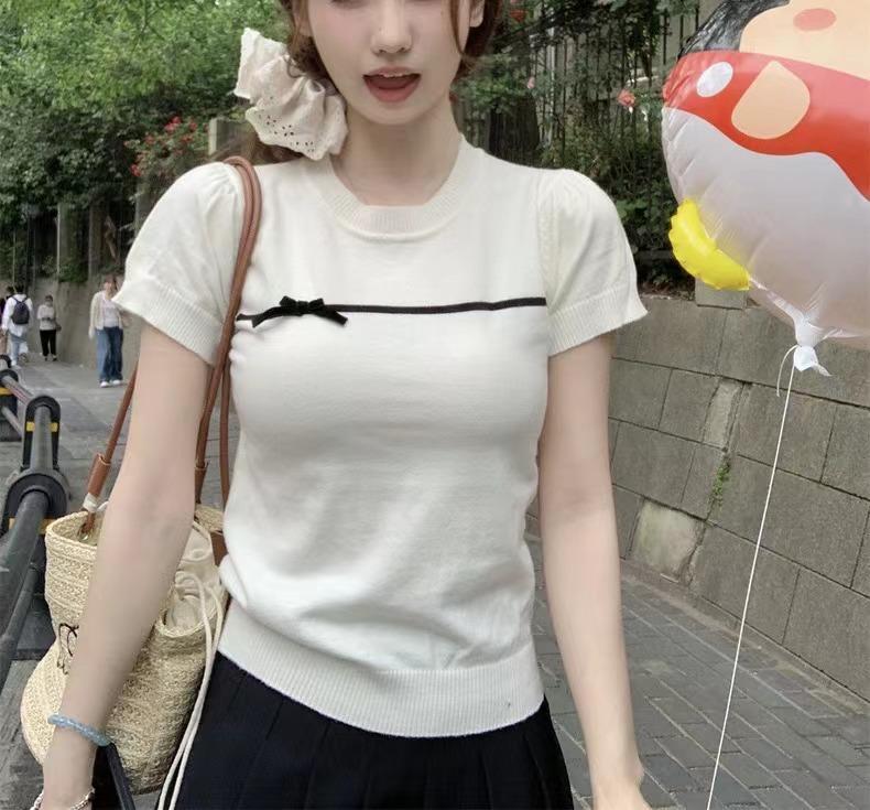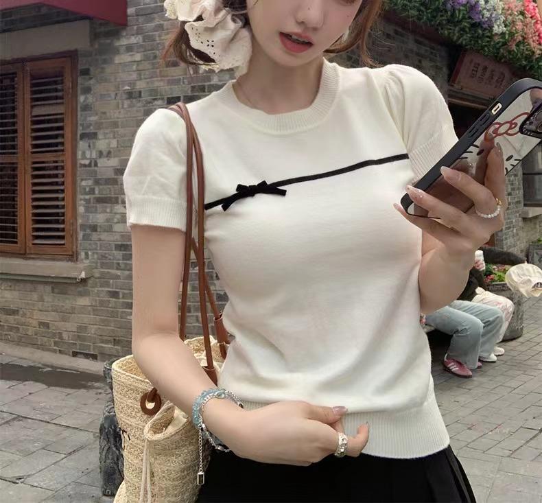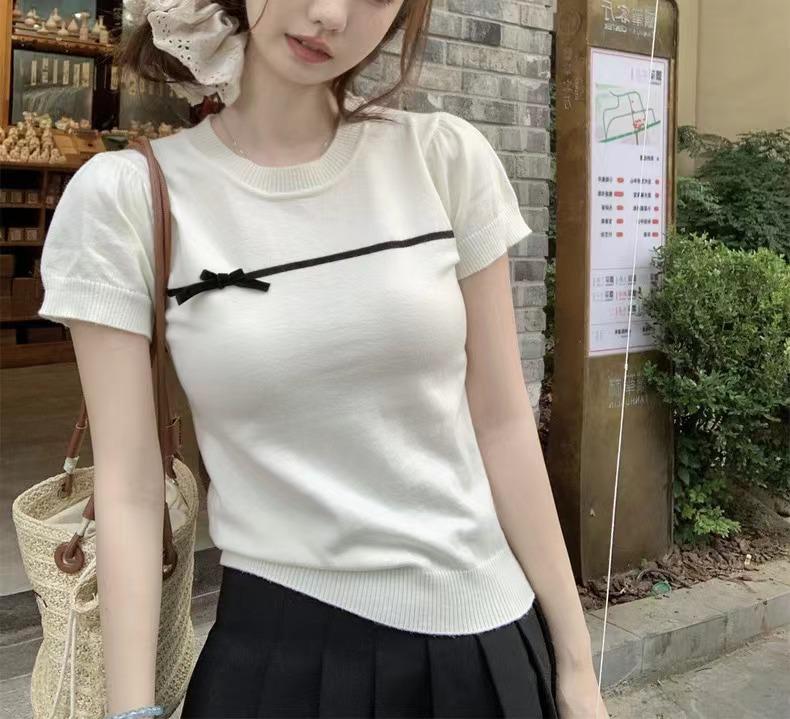 Diseño de Estilo Suave Nicho Manga Corta Abullonada Camiseta de Punto Corta Adelgazante de Otoño para Mujer