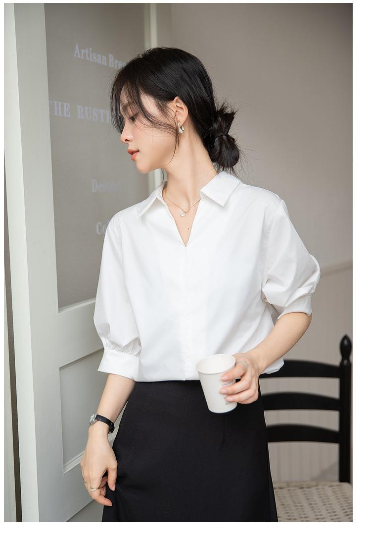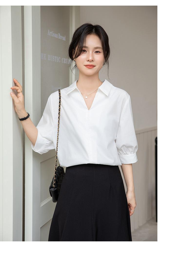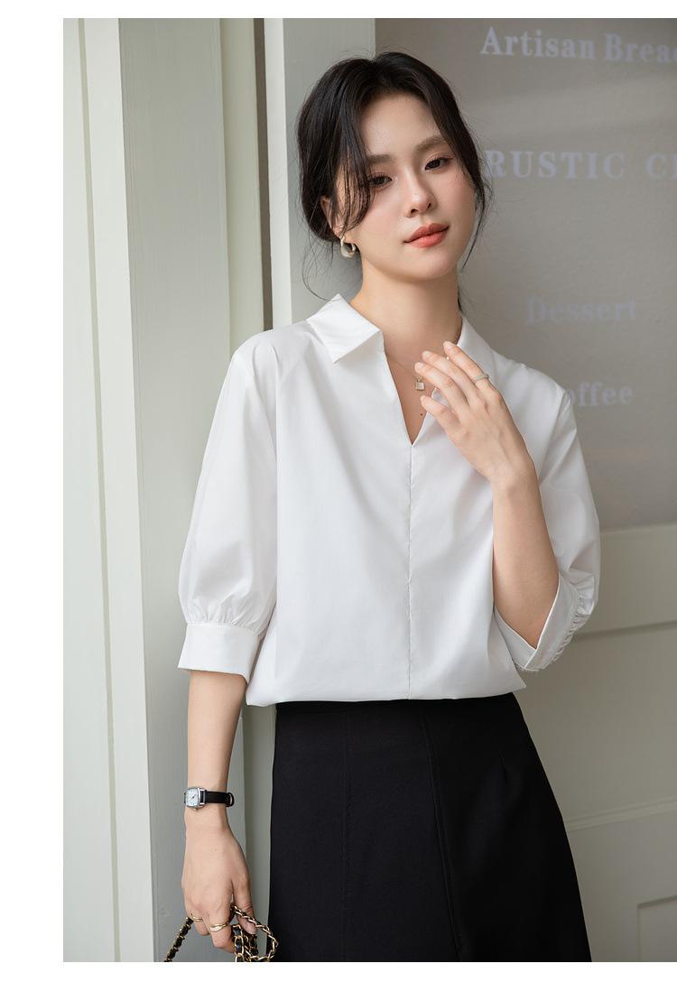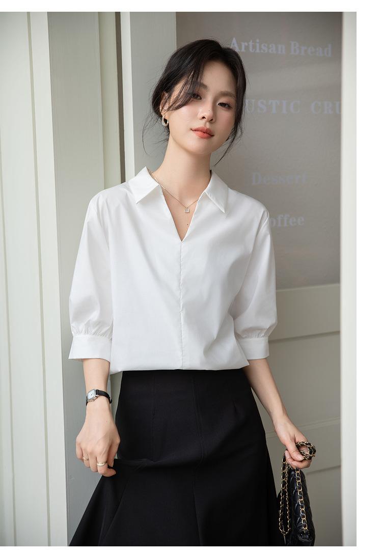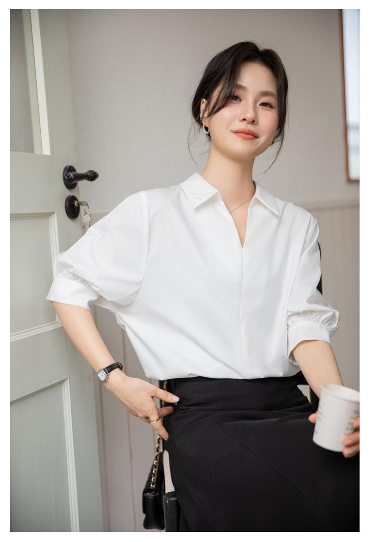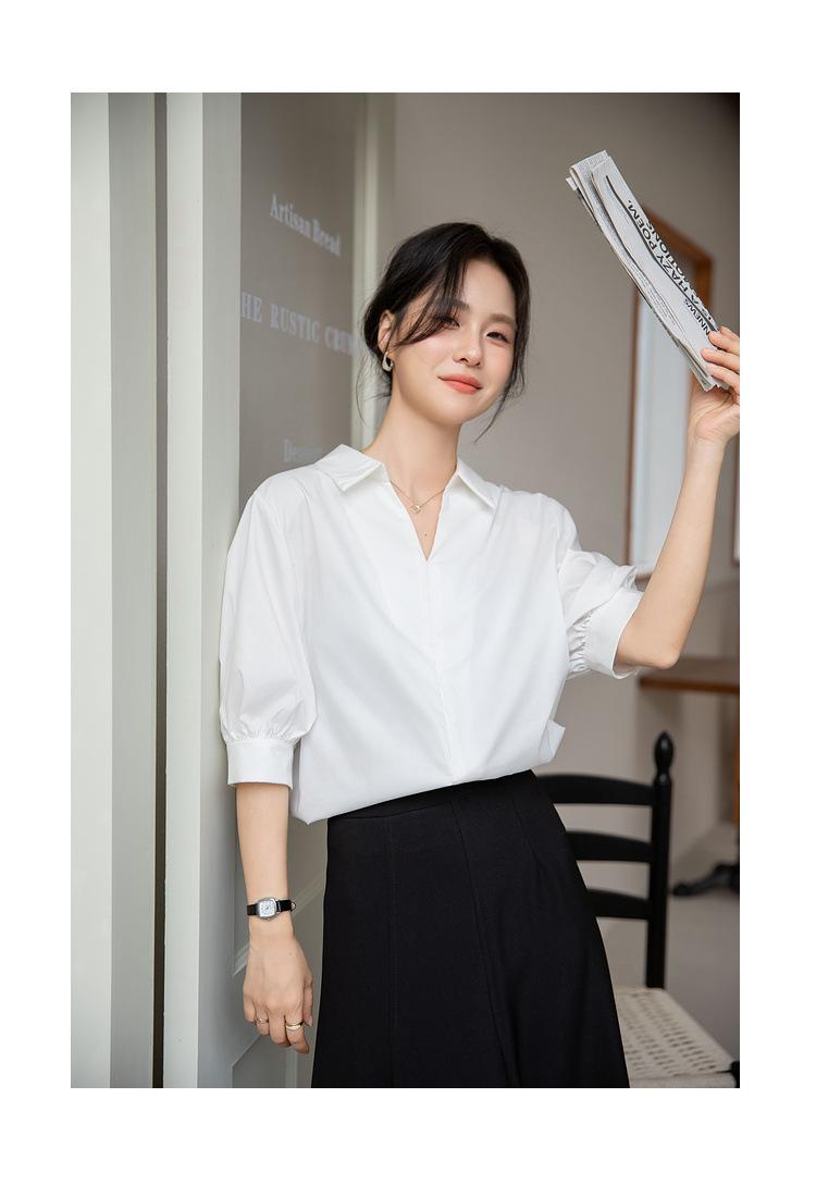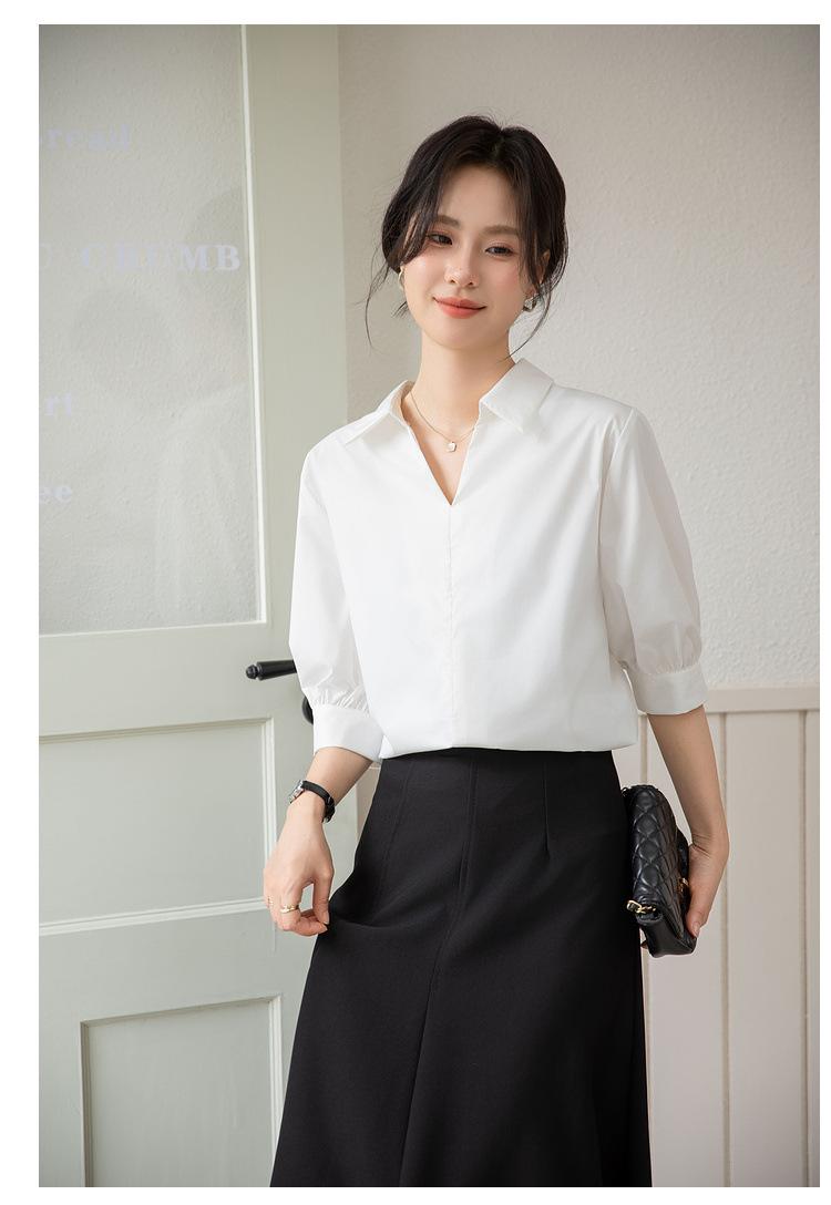 Camisa Blanca de Verano para Mujer con Cuello en V Francés y Manga Corta 2025 Ropa de Trabajo Profesional de Alta Gama Casual Holgada