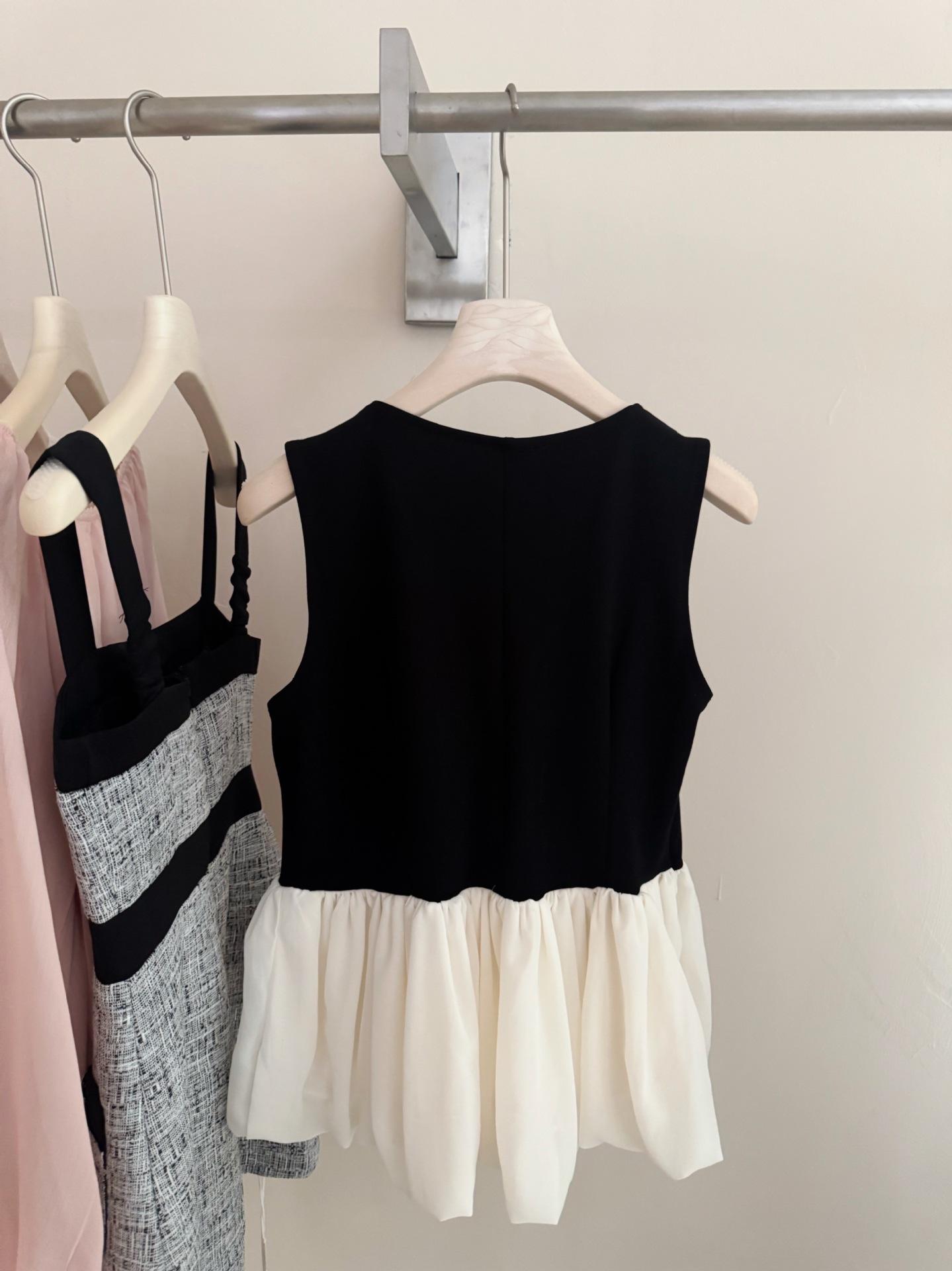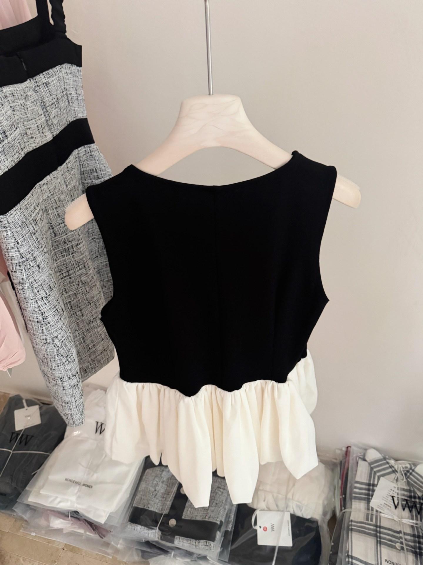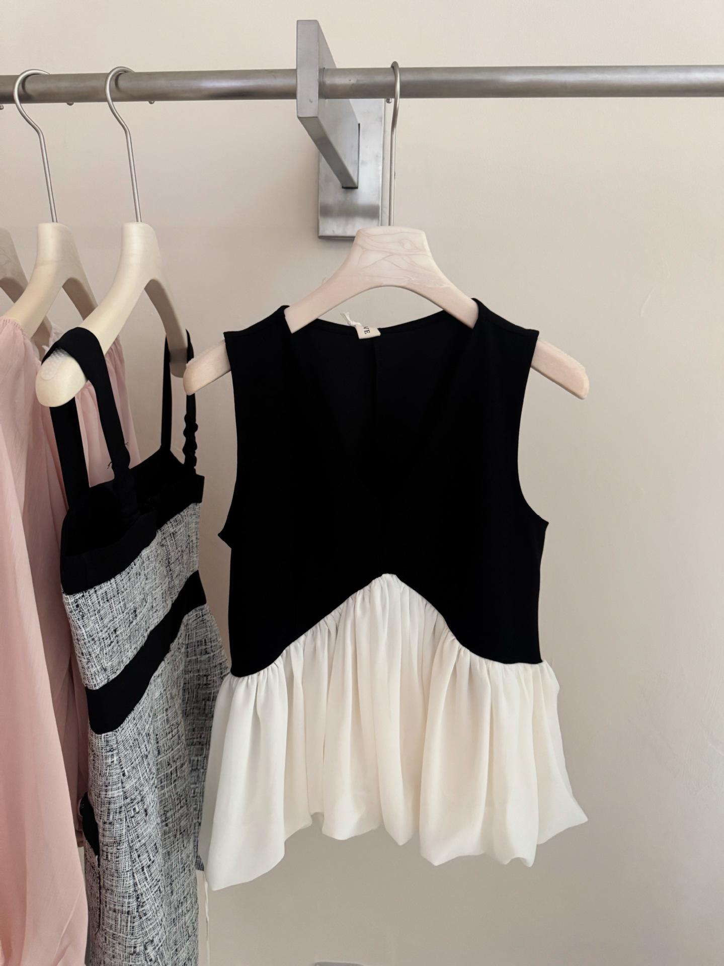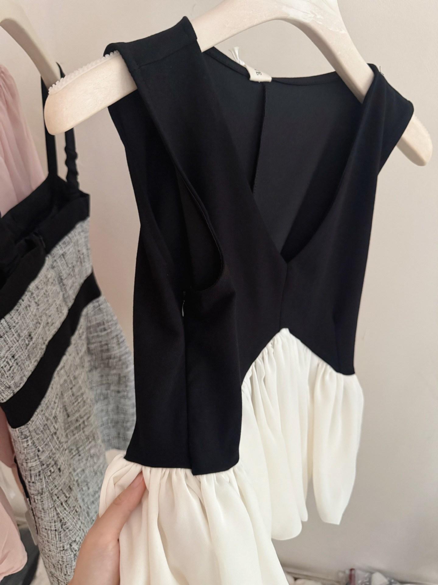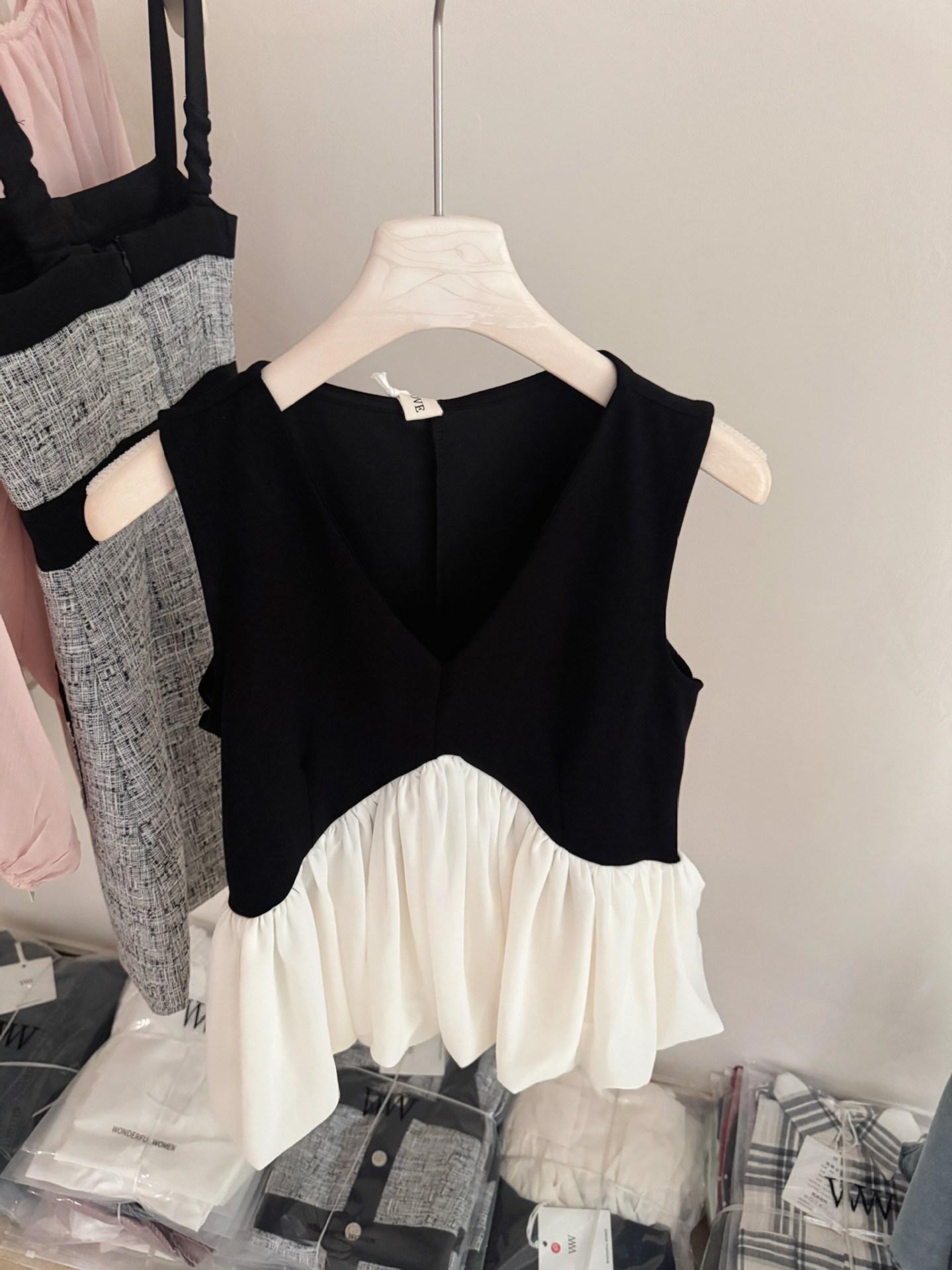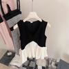 Verano 2025 Estilo Francés Cuello en V Jersey Sin Mangas Adelgazante Patchwork Color Contraste Crop Top para Mujer Trendy