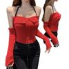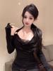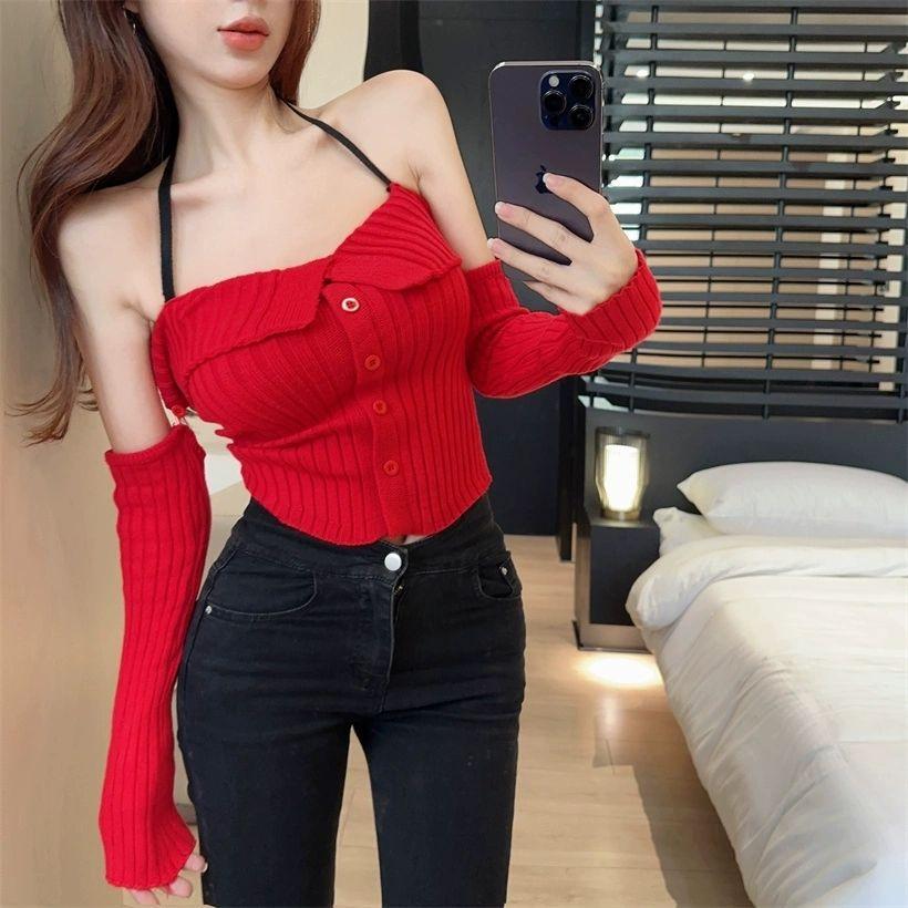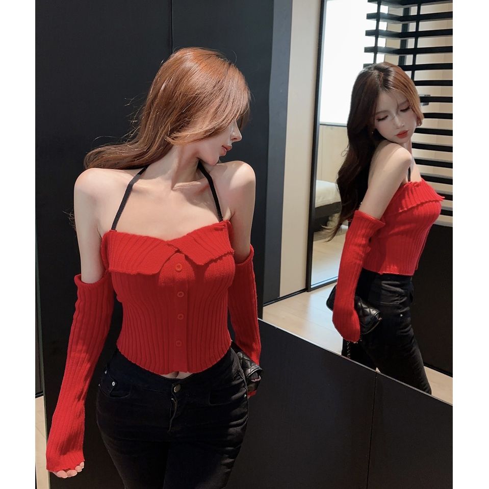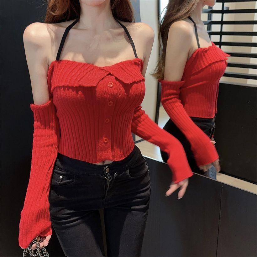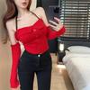 Sexy Spice Girl Elegante Cuello Colgante Hombro Descubierto Manga Larga Camiseta para Mujer Otoño e Invierno Estilo Deseo Puro Nicho Camiseta Base Top Ins