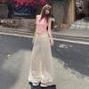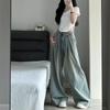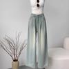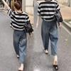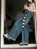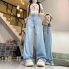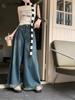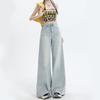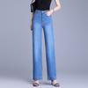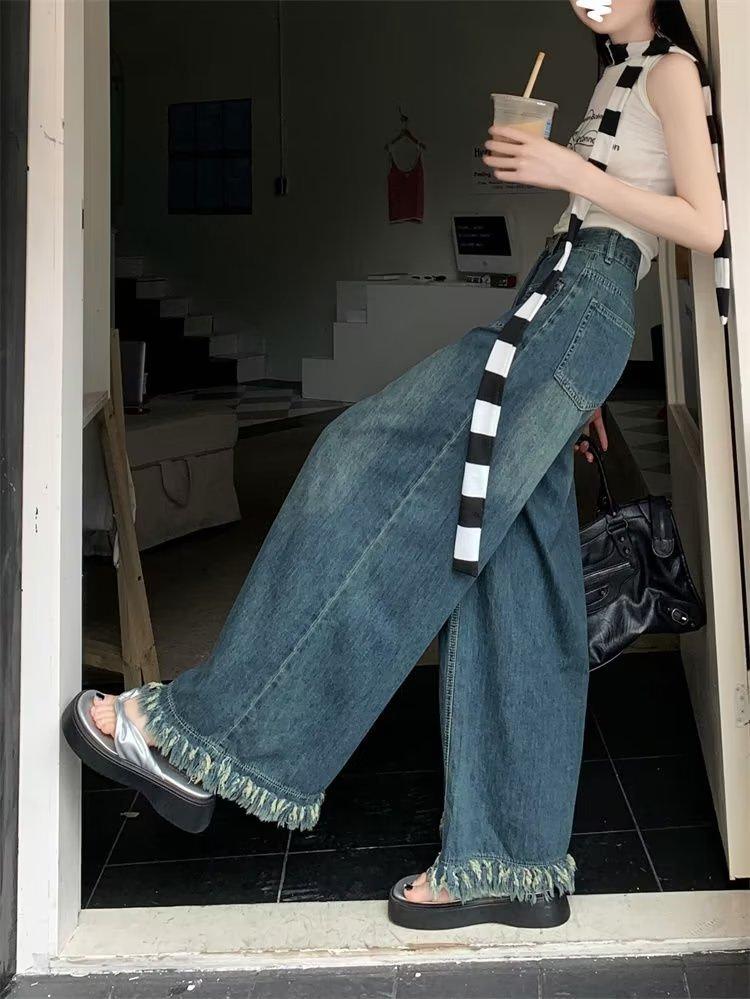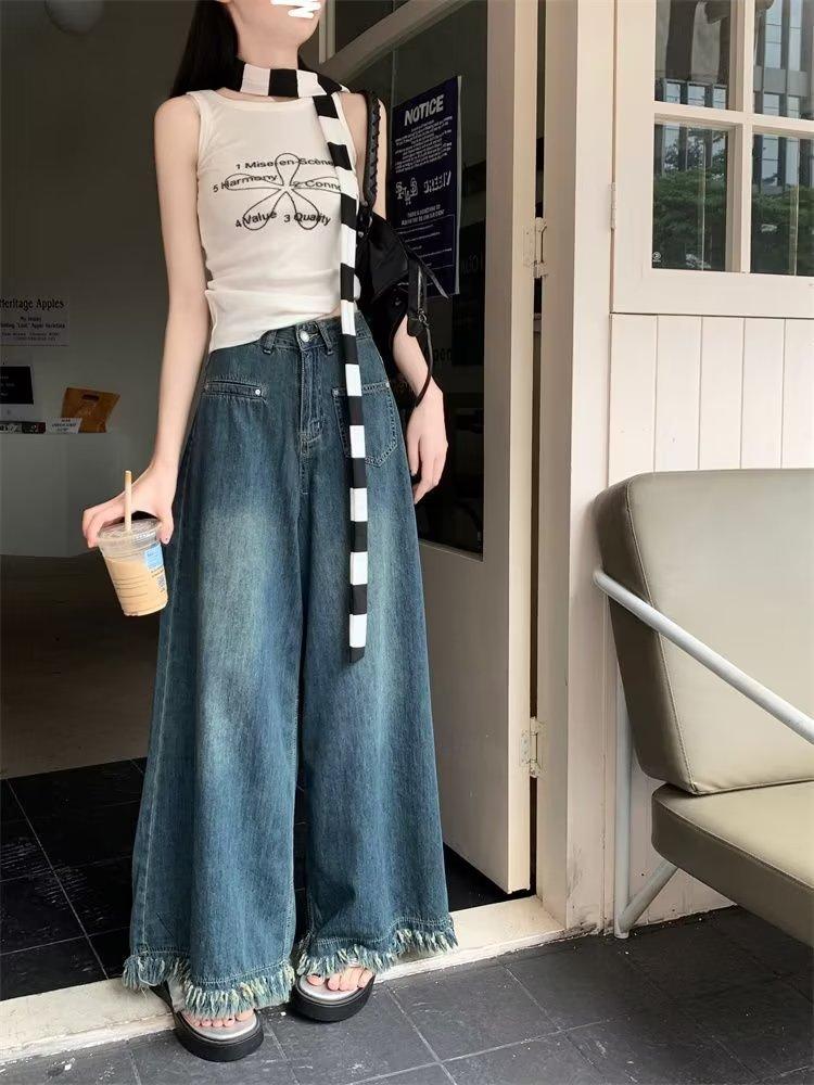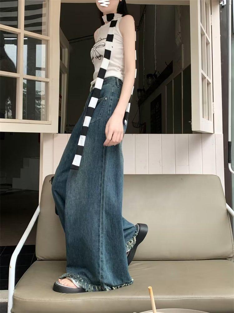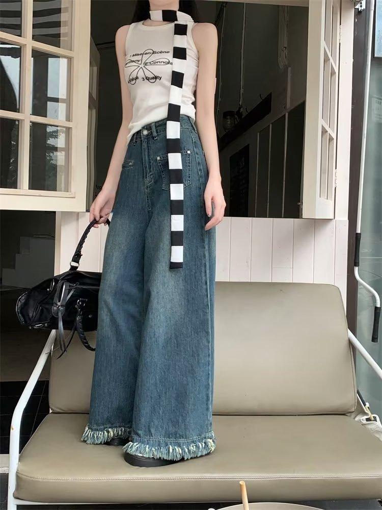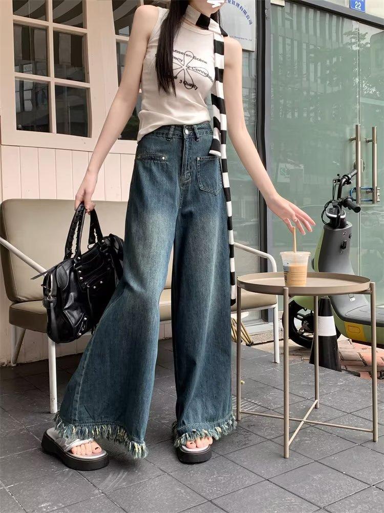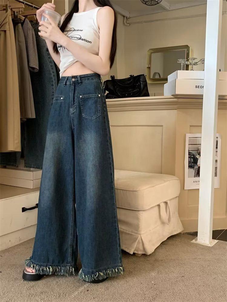 Jeans de Cintura Alta y Pierna Ancha para Mujer Otoño Talla Grande Diseño Flecos Orilla Cruda Dip Todo Combinable Pantalones Sueltos