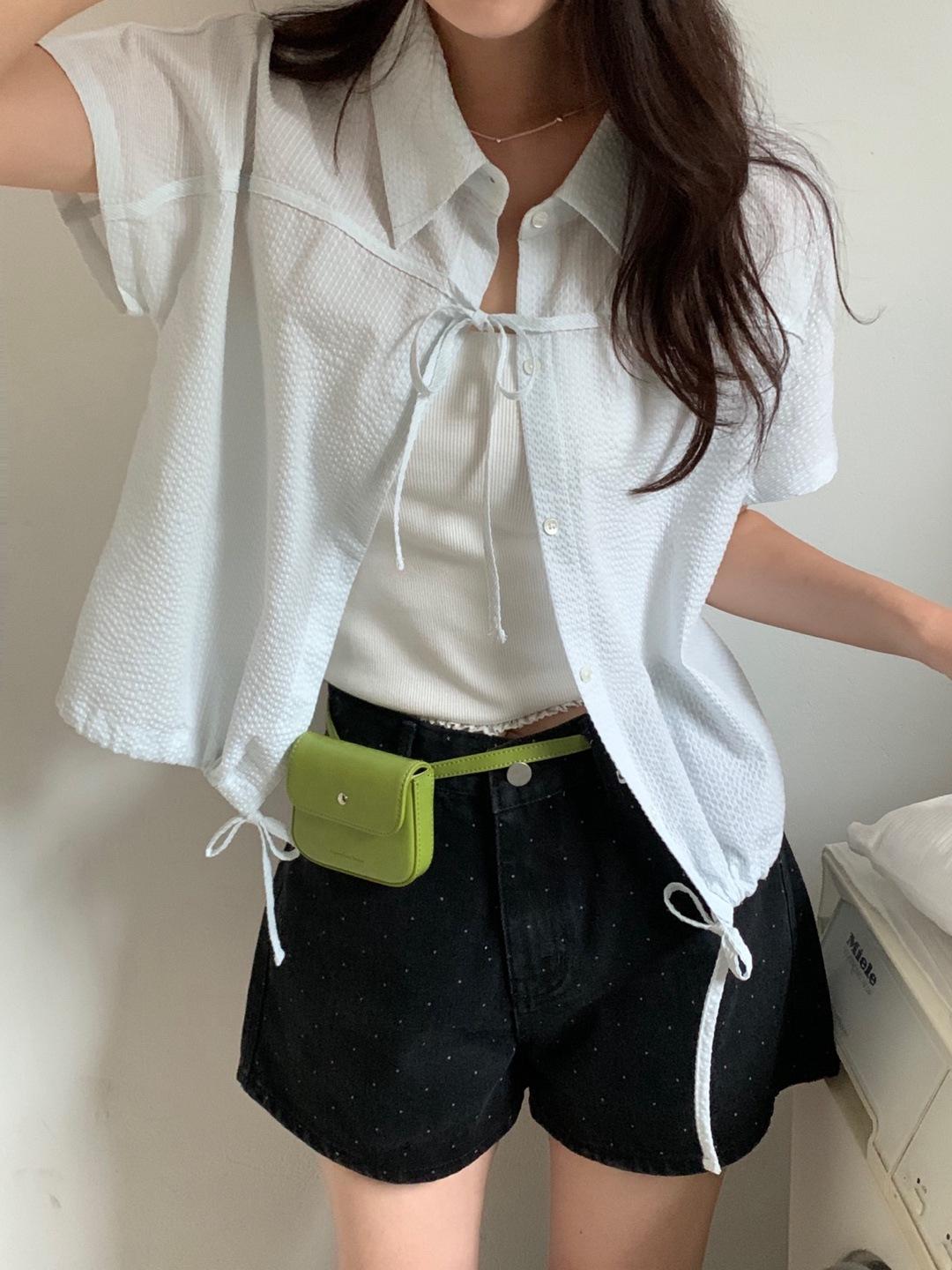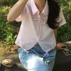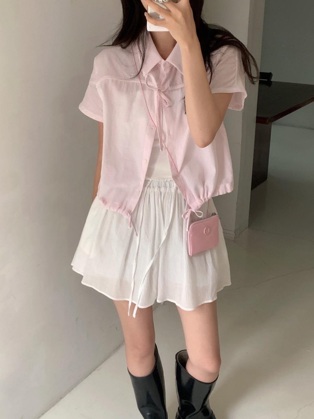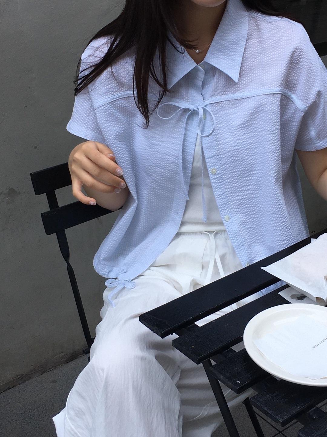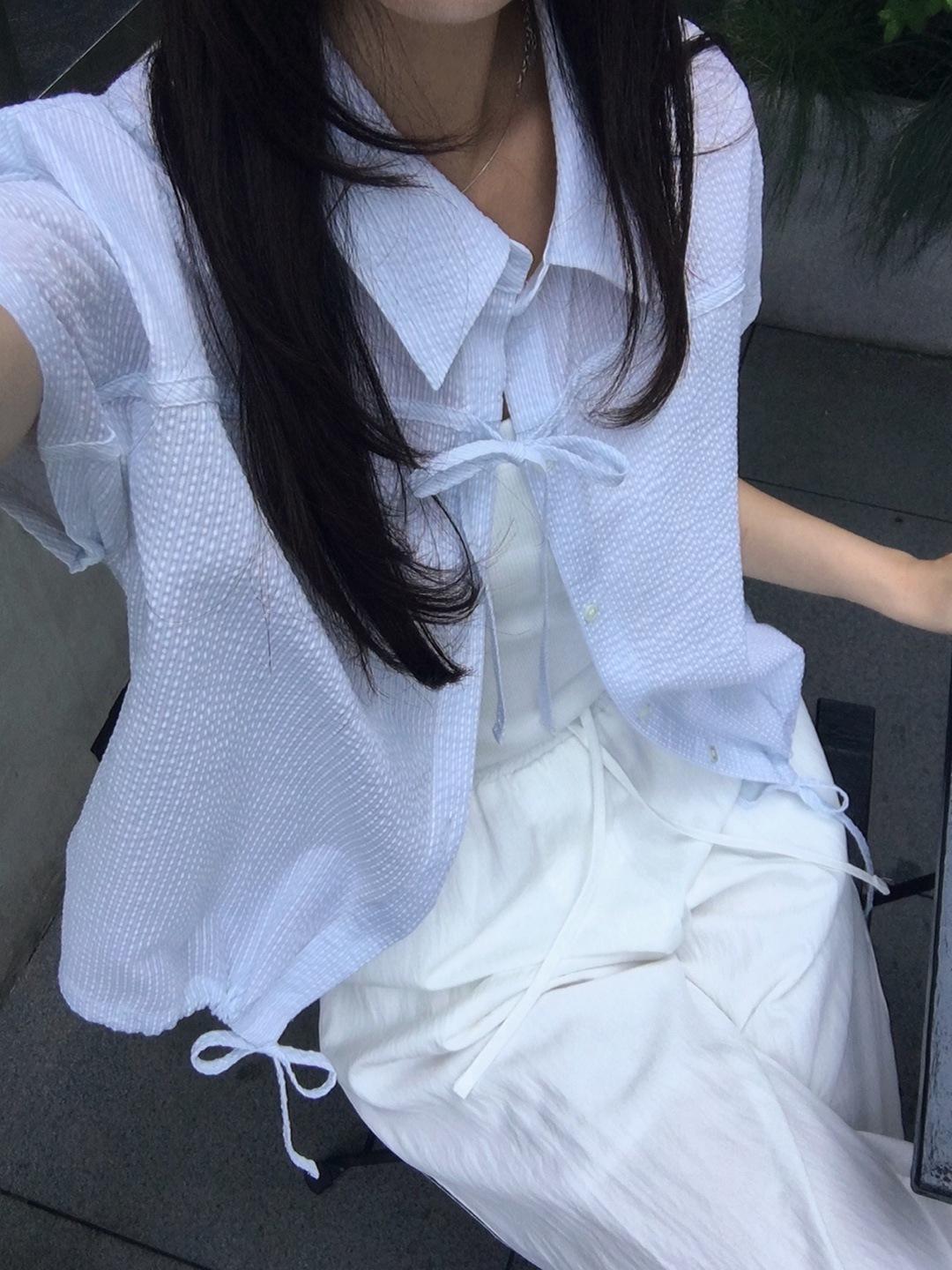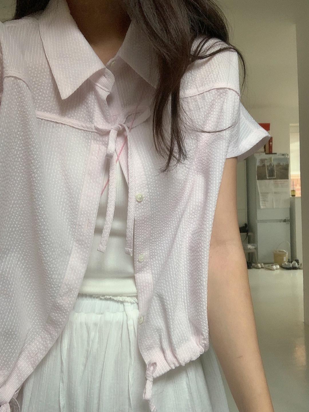 Camisa Coreana Chic de Verano con Burbujas a Rayas de Un Solo Botón con Cordones de Manga Corta