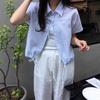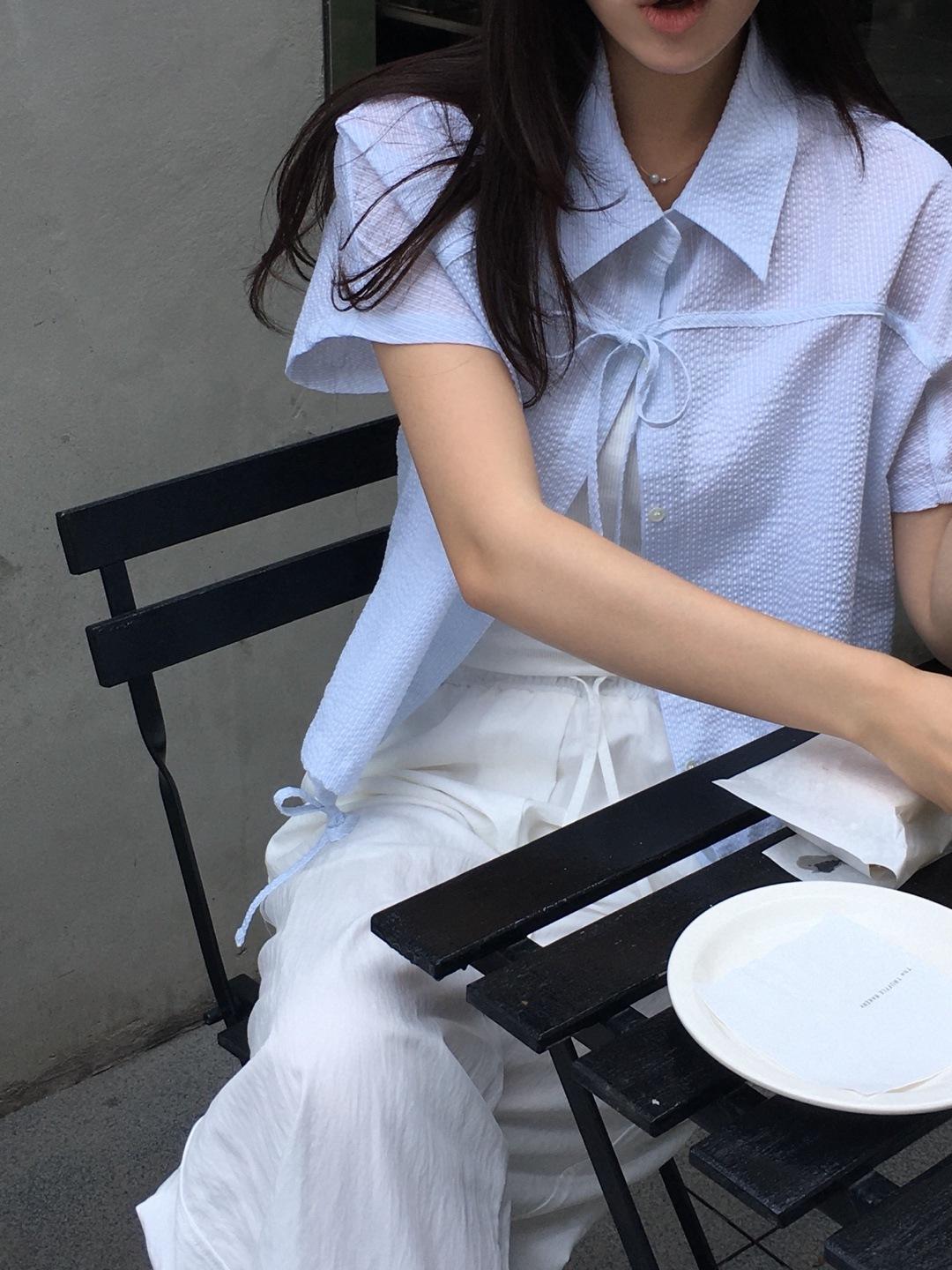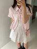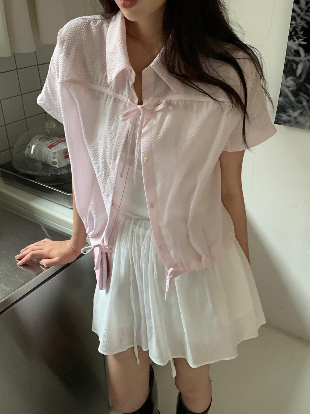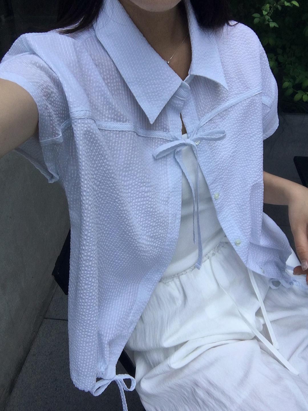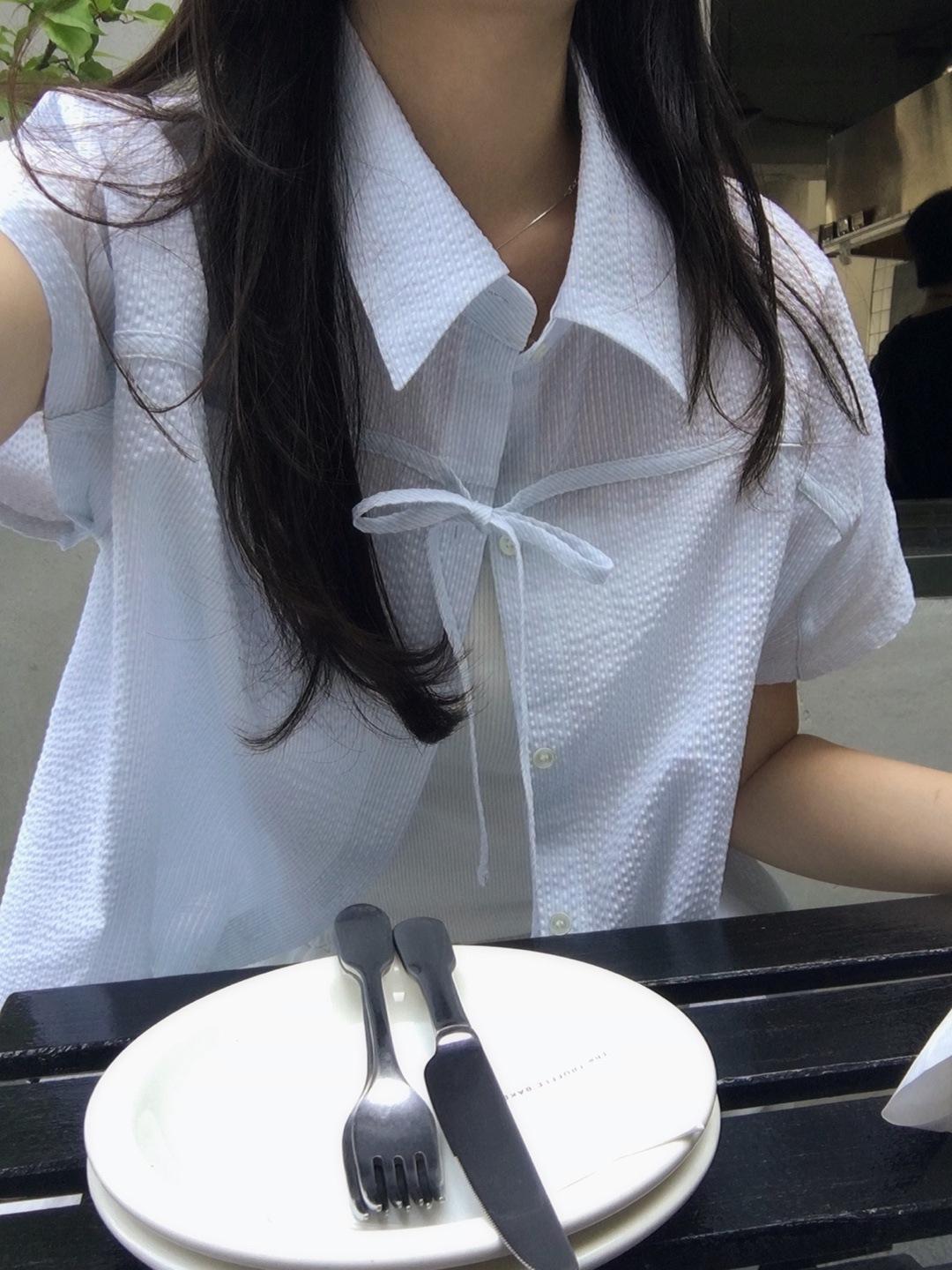 Camisa Coreana Chic de Verano con Burbujas a Rayas de Un Solo Botón con Cordones de Manga Corta