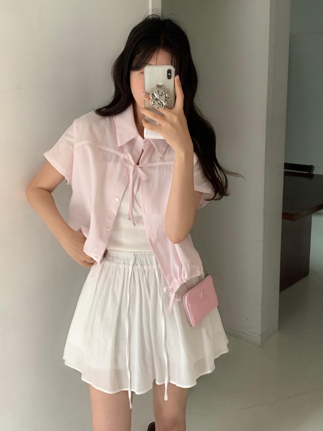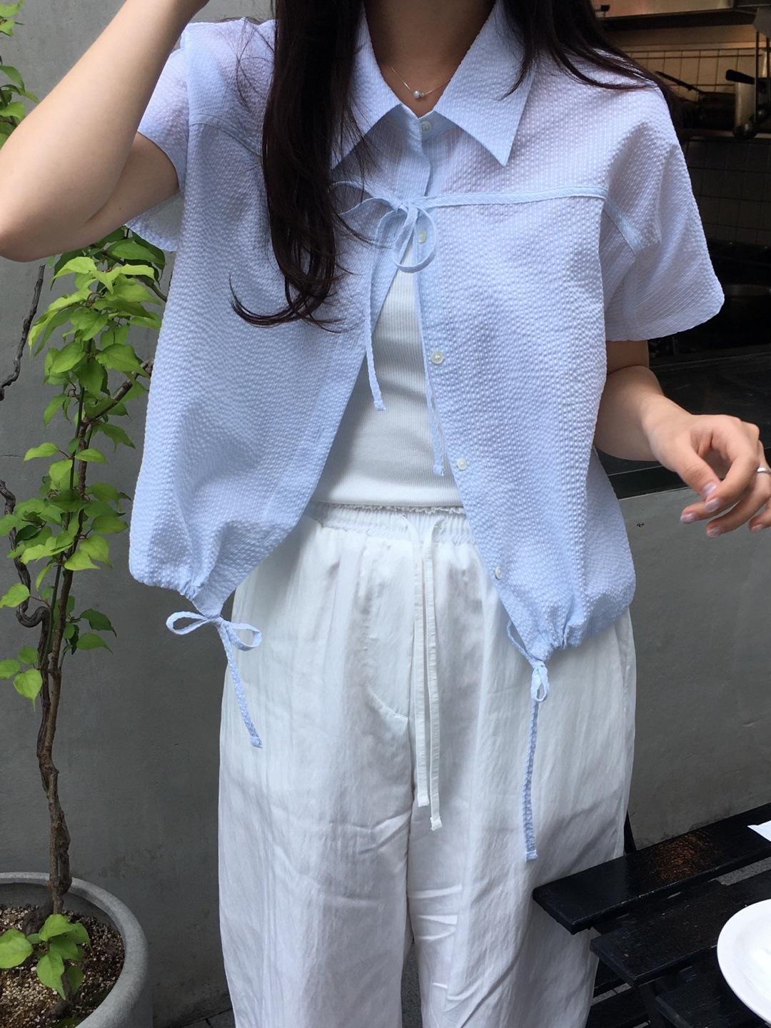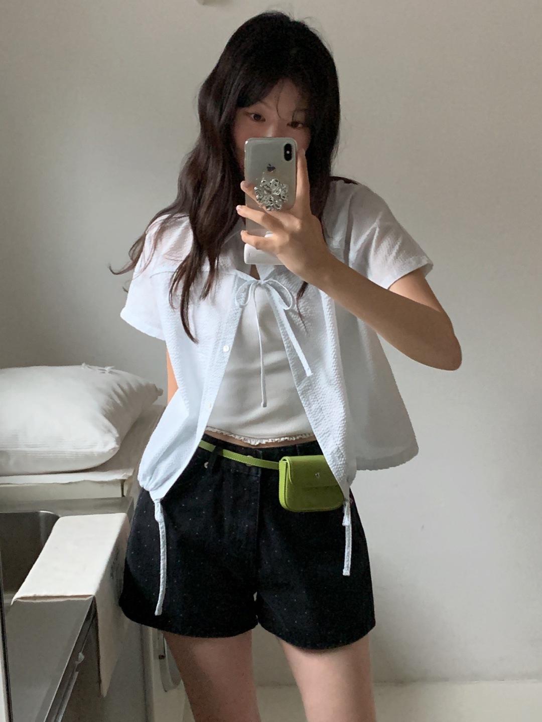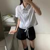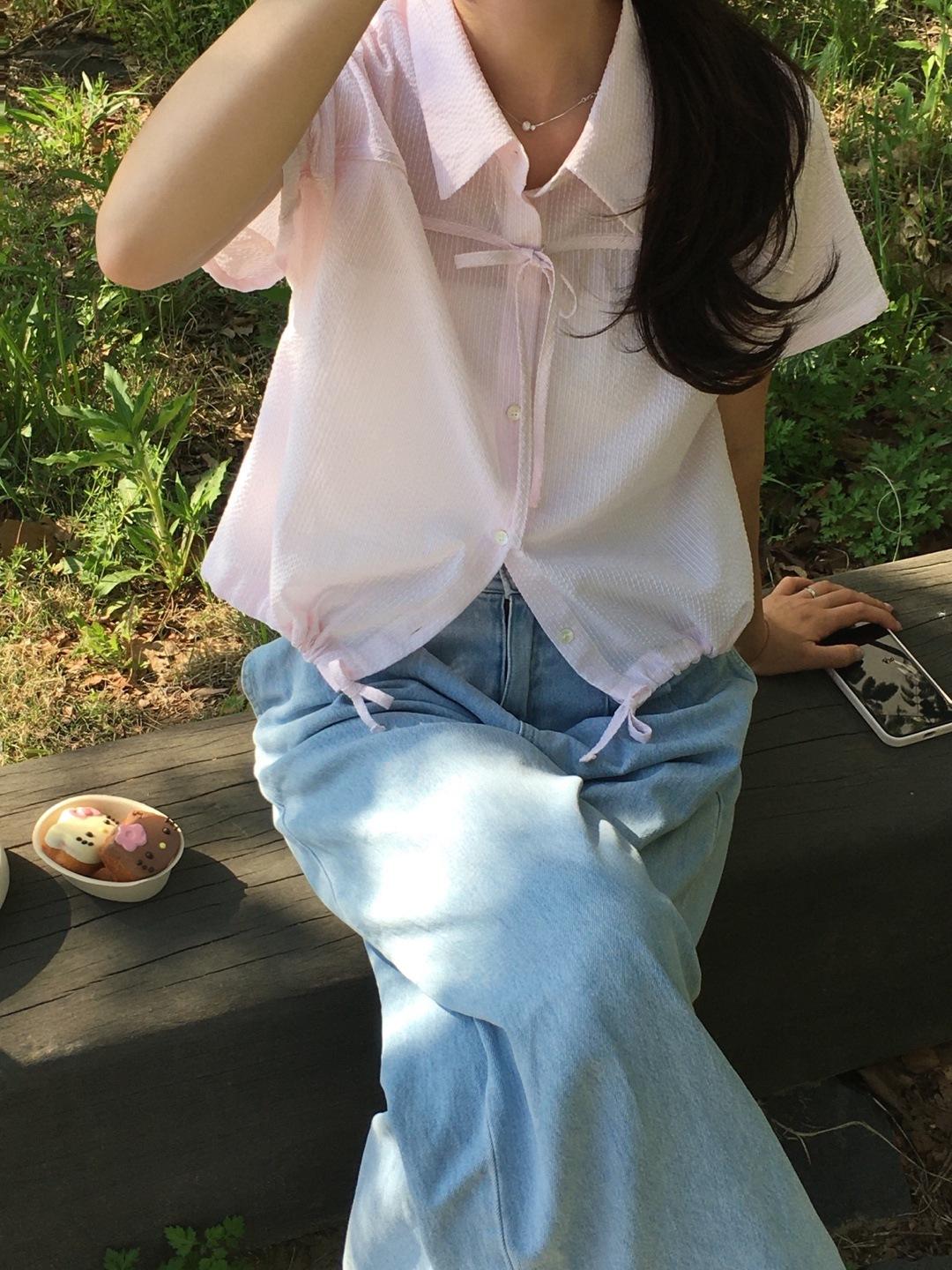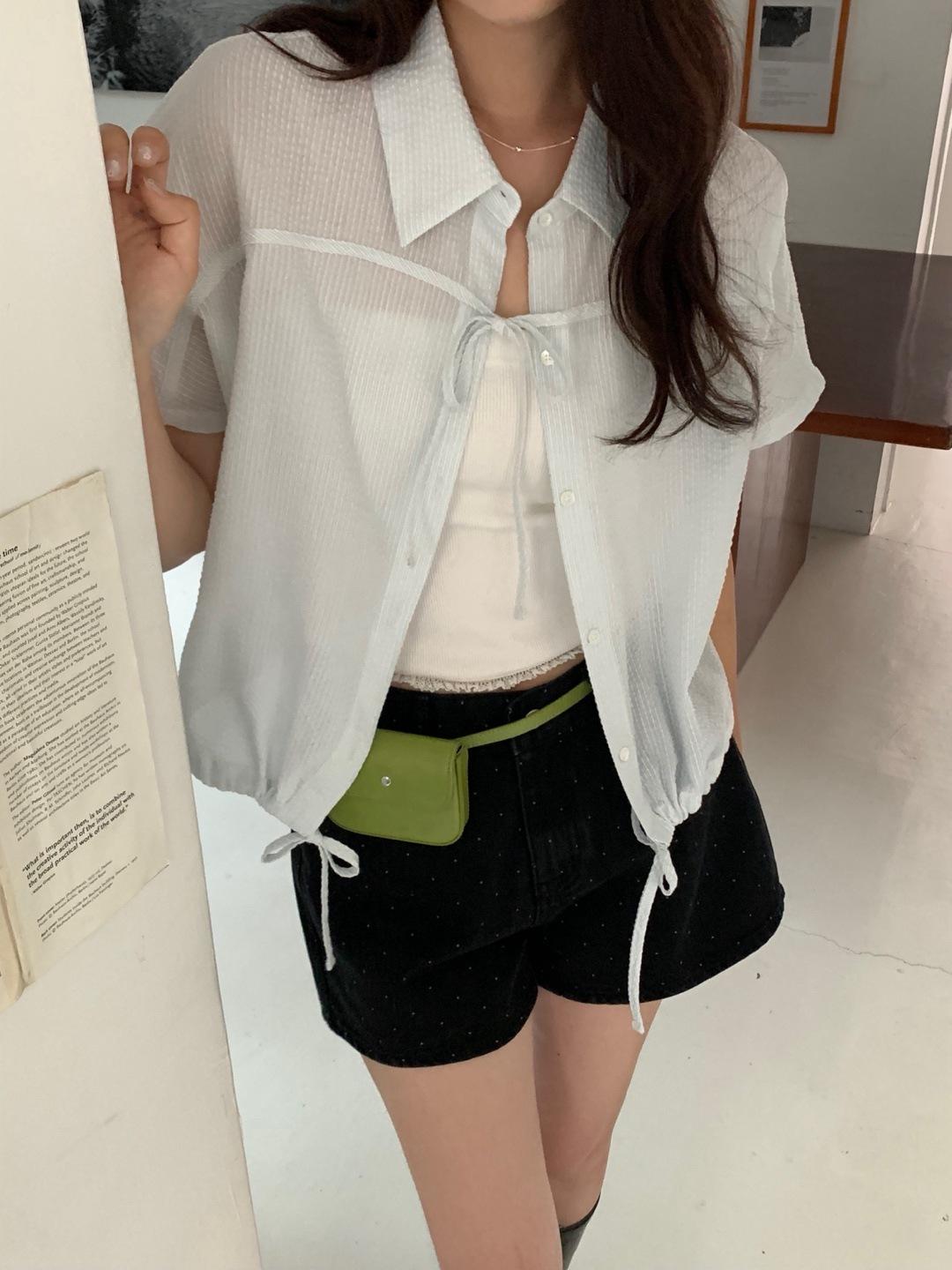 Camisa Coreana Chic de Verano con Burbujas a Rayas de Un Solo Botón con Cordones de Manga Corta