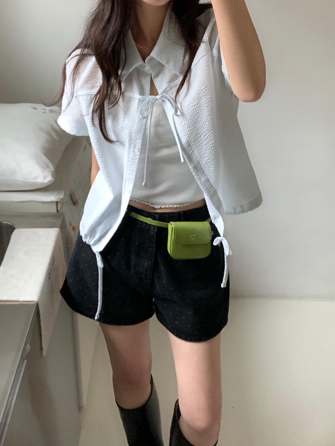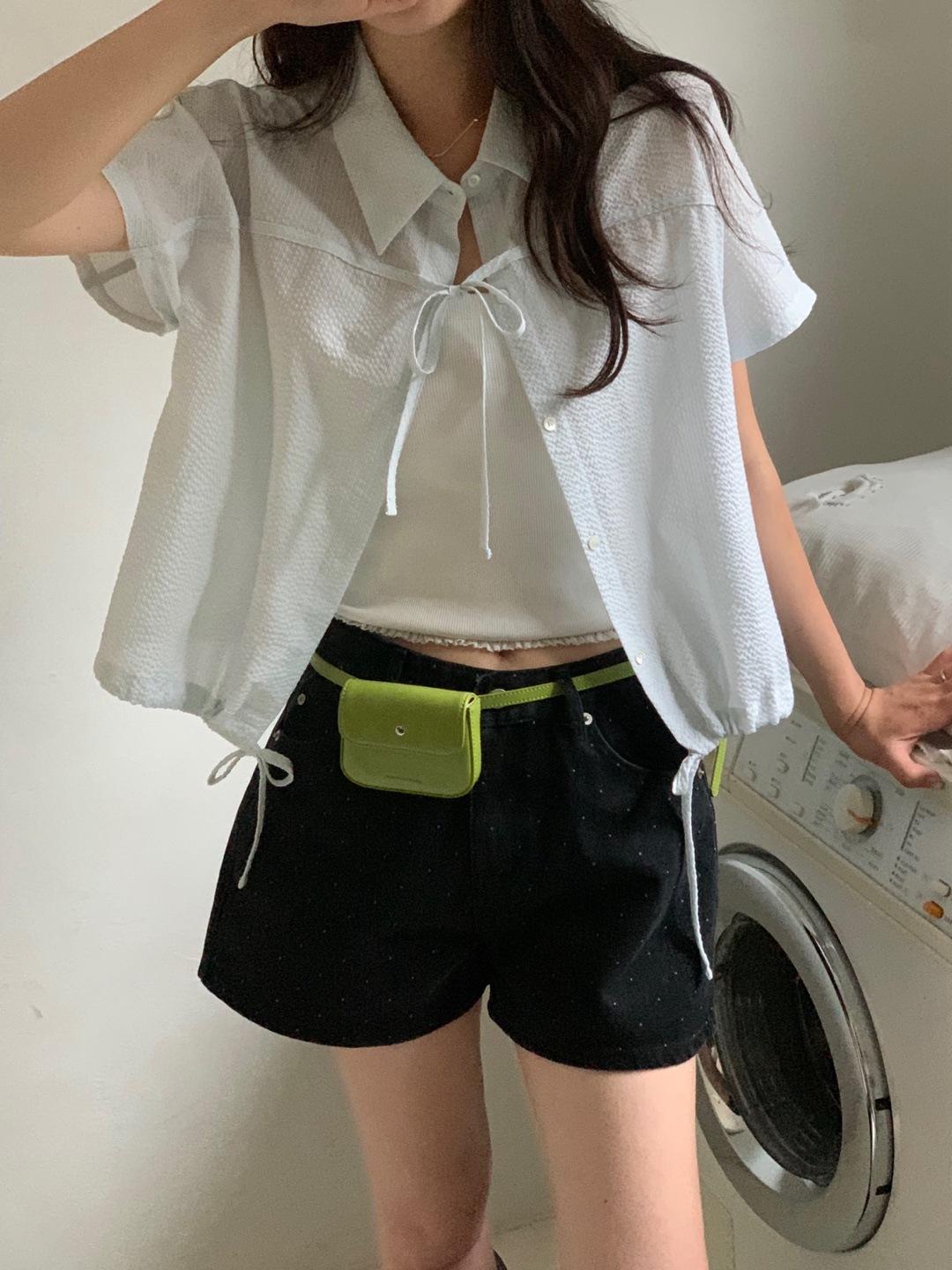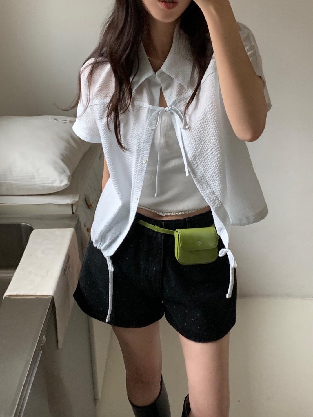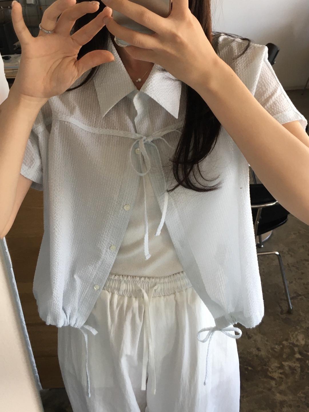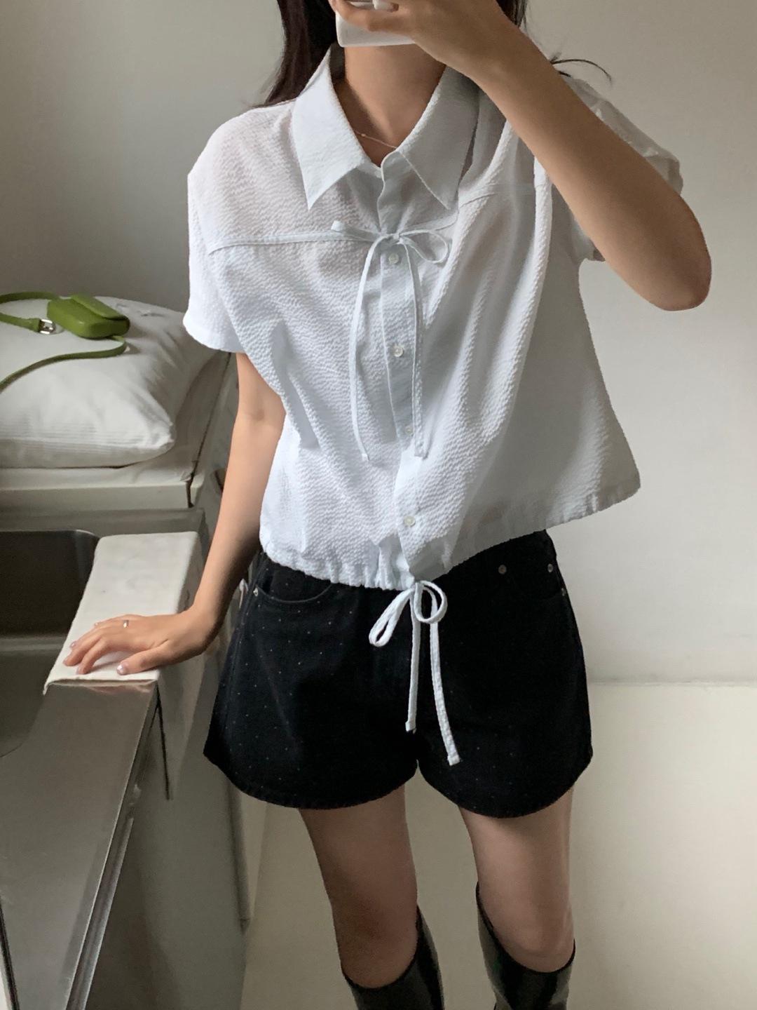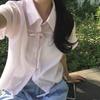 Camisa Coreana Chic de Verano con Burbujas a Rayas de Un Solo Botón con Cordones de Manga Corta