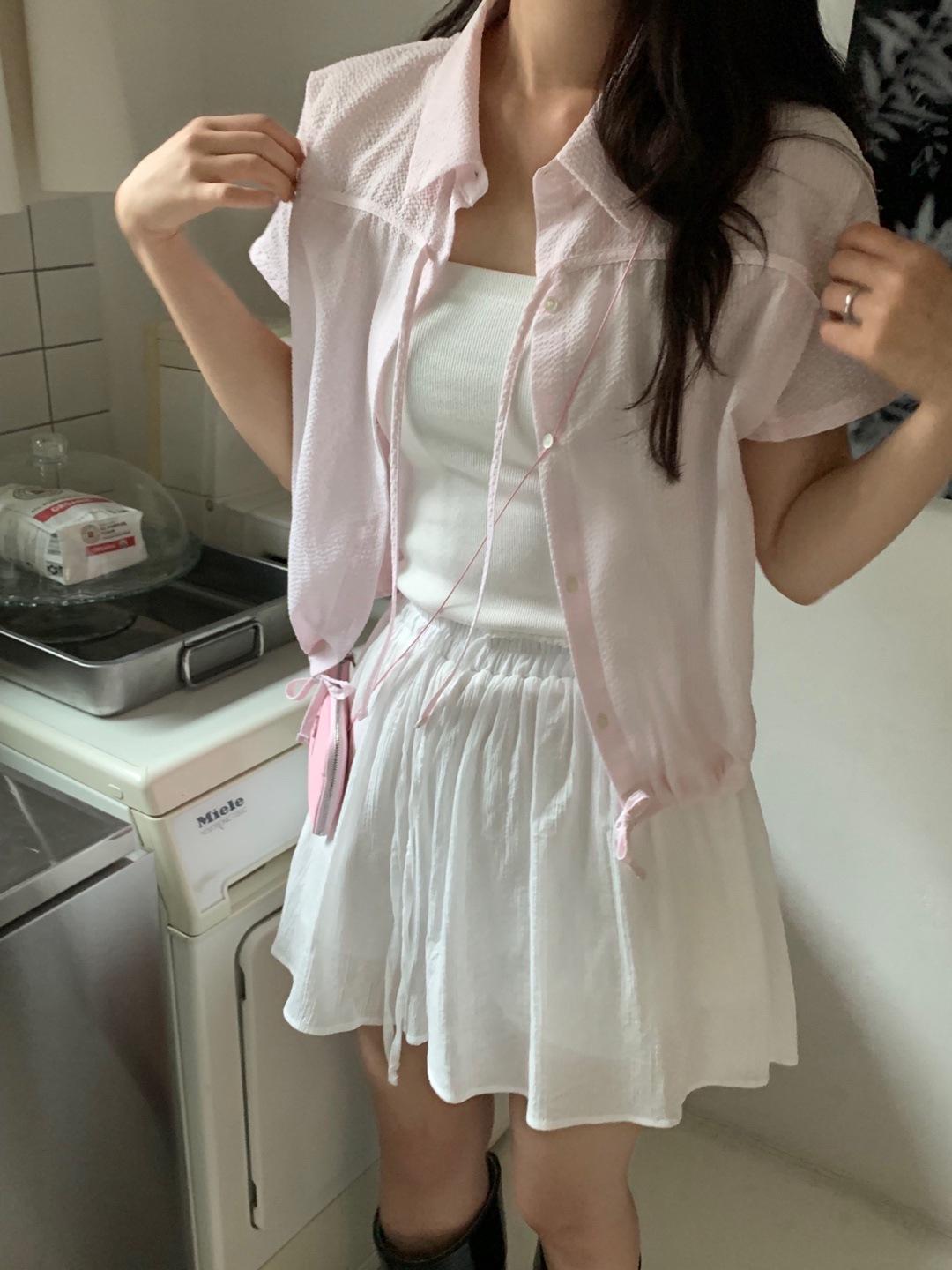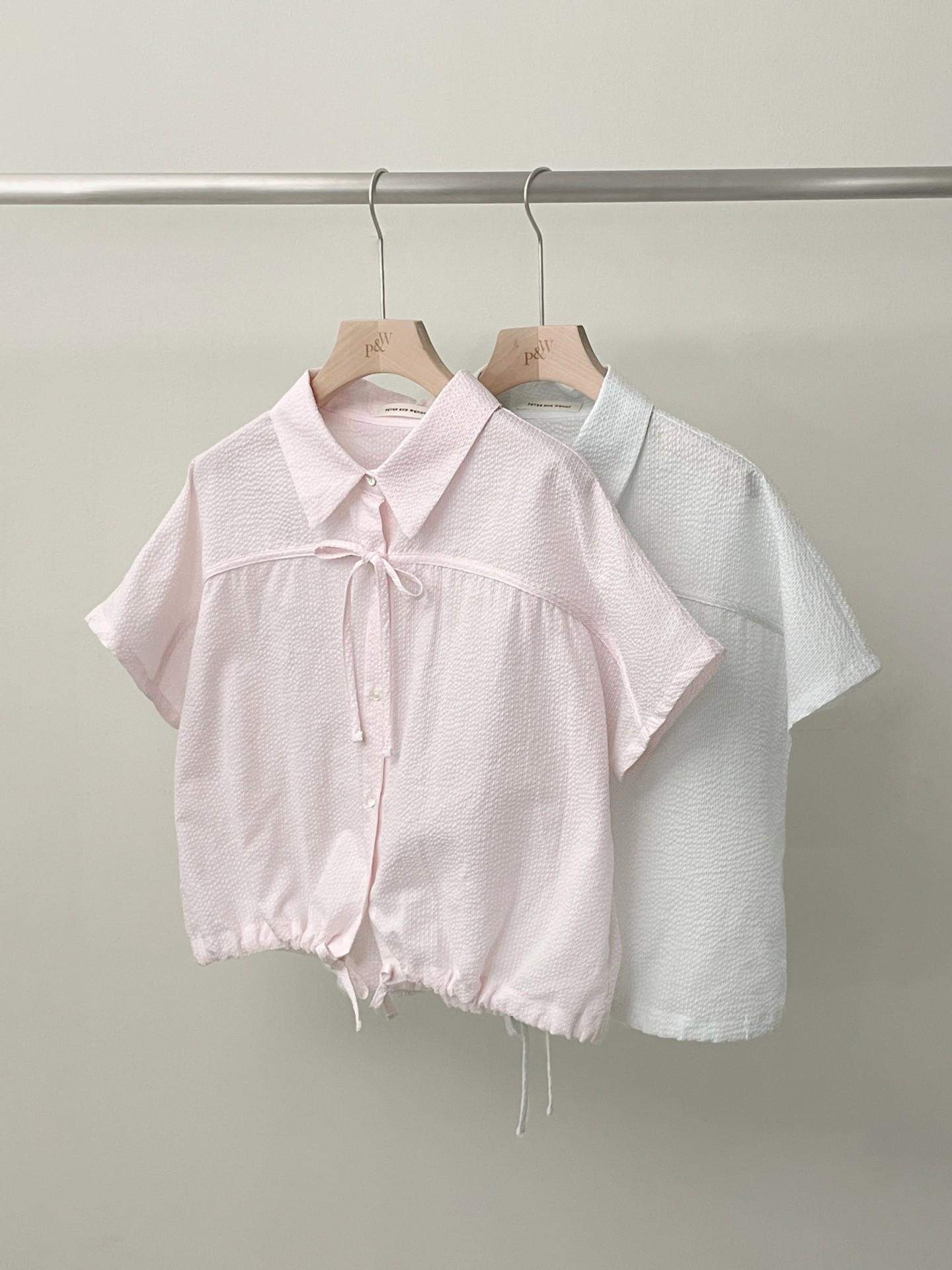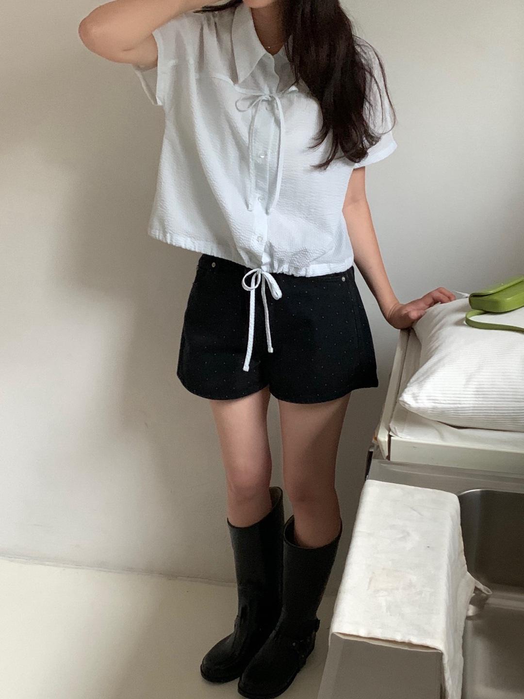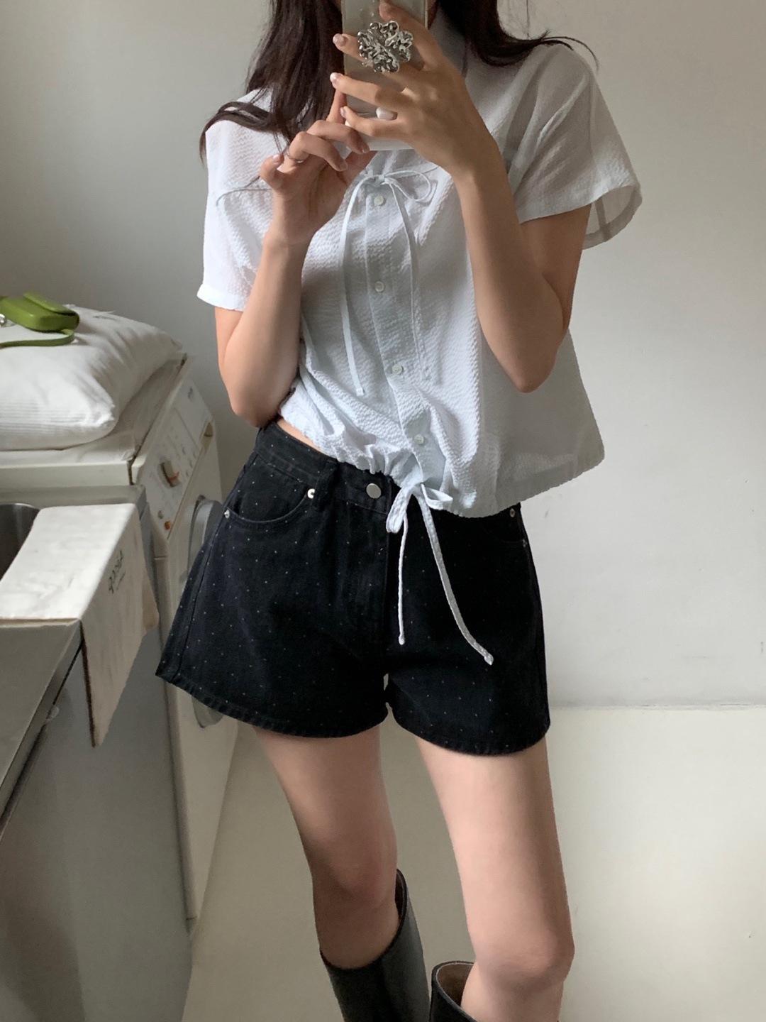Camisa Coreana Chic de Verano con Burbujas a Rayas de Un Solo Botón con Cordones de Manga Corta