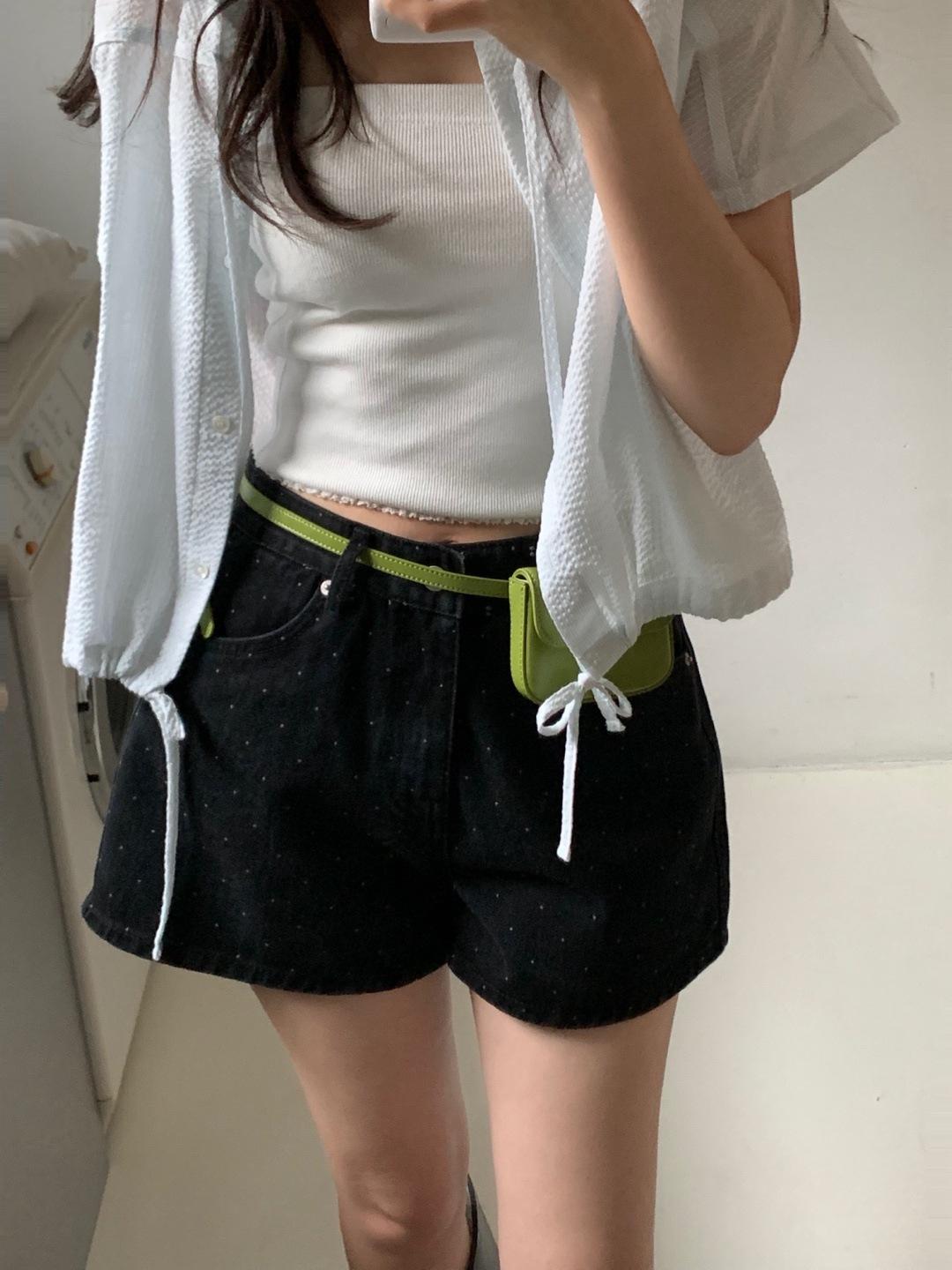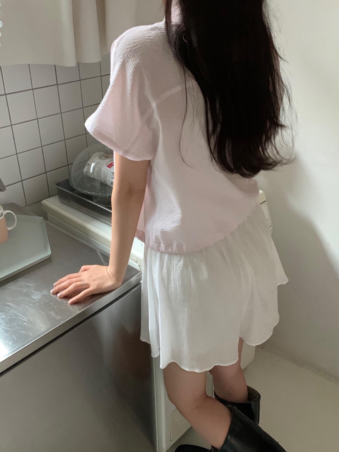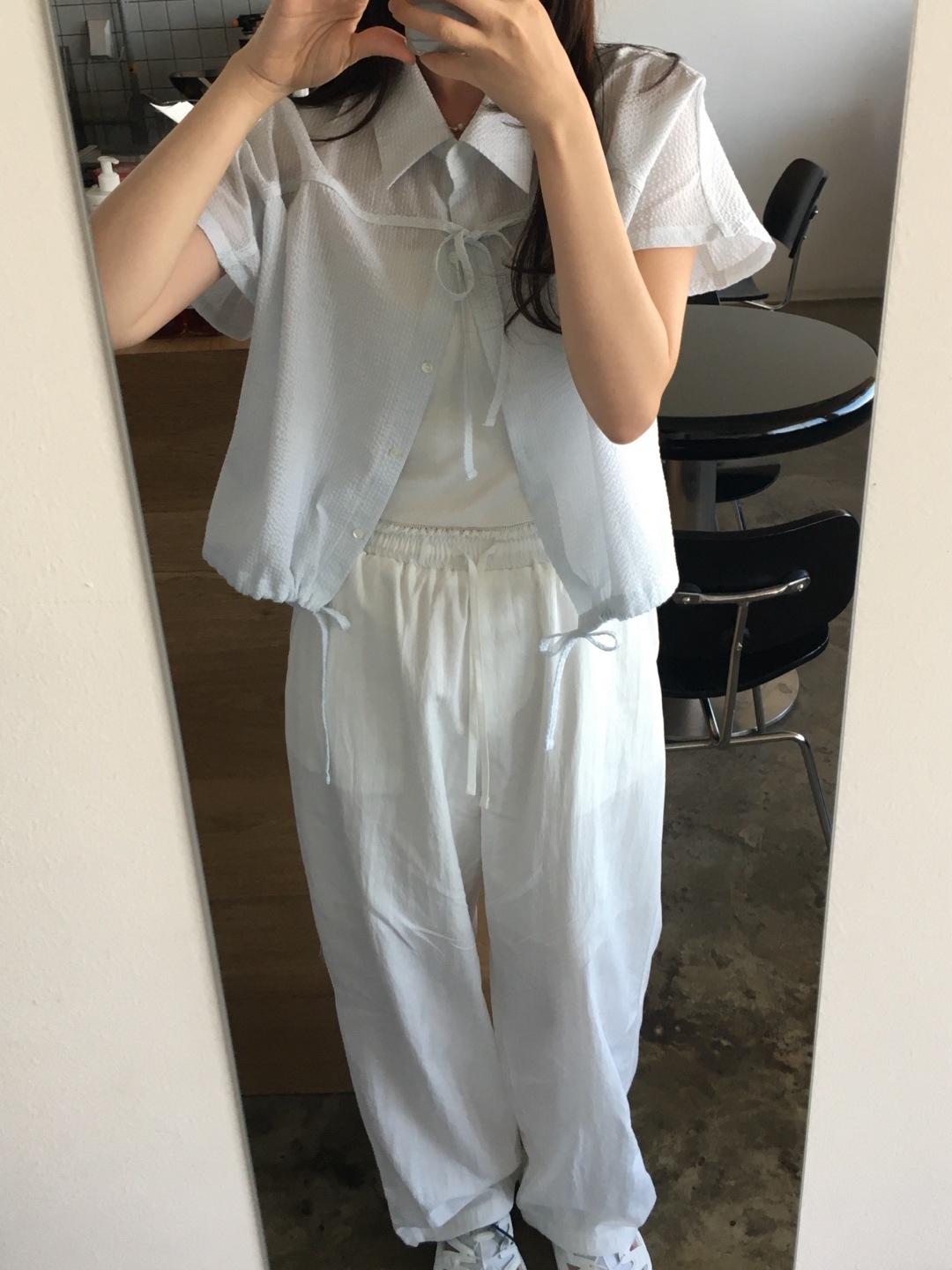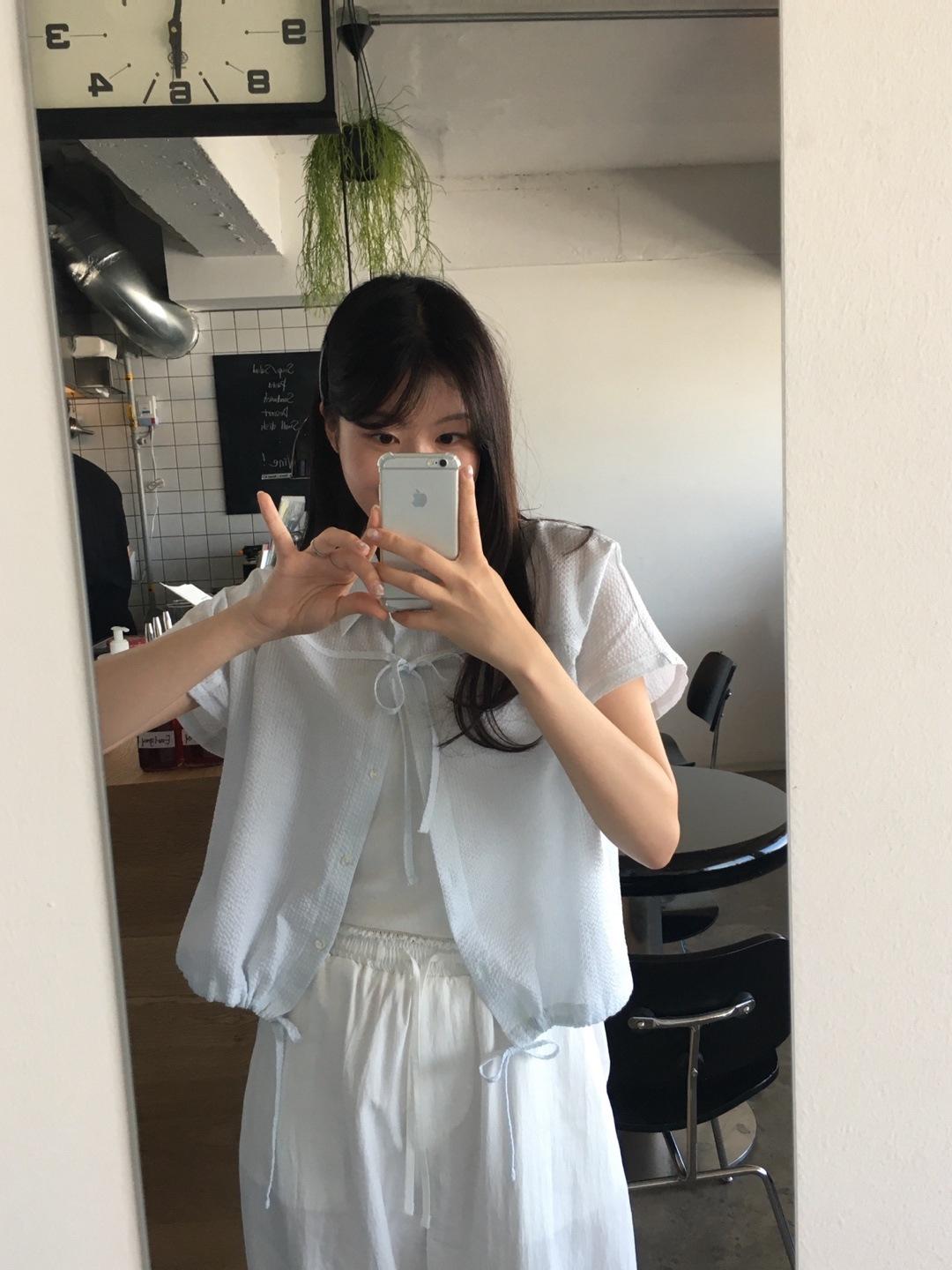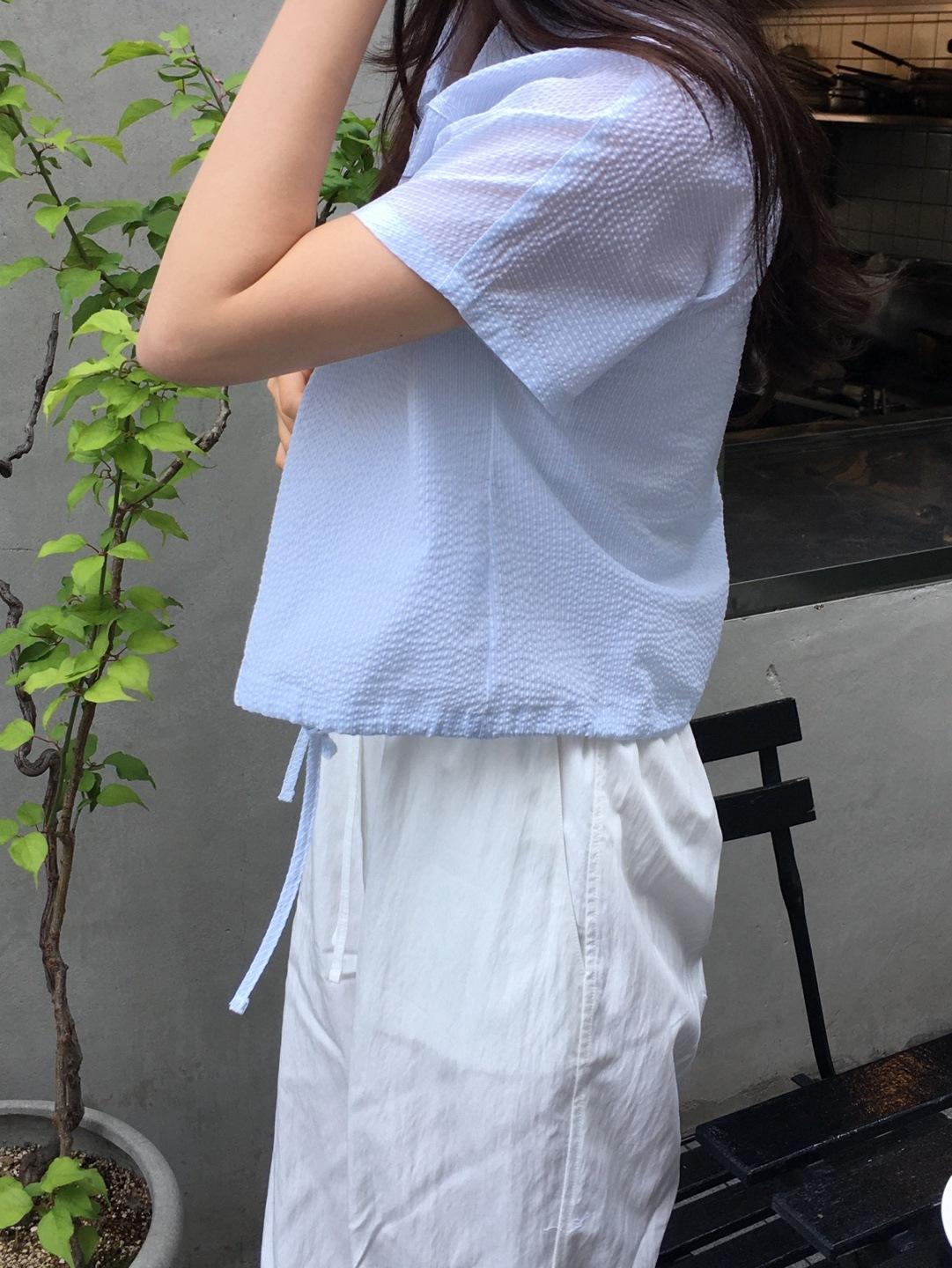 Camisa Coreana Chic de Verano con Burbujas a Rayas de Un Solo Botón con Cordones de Manga Corta