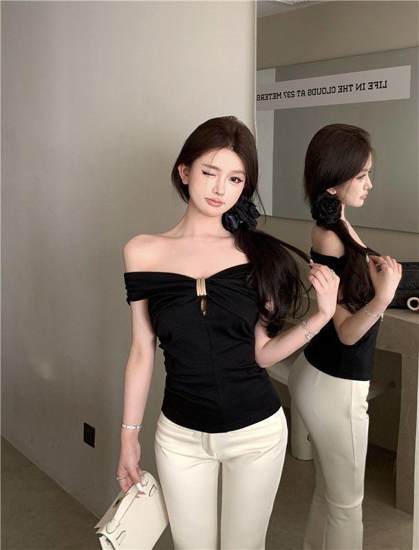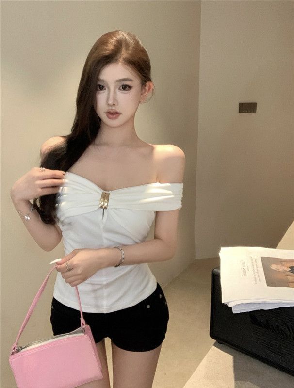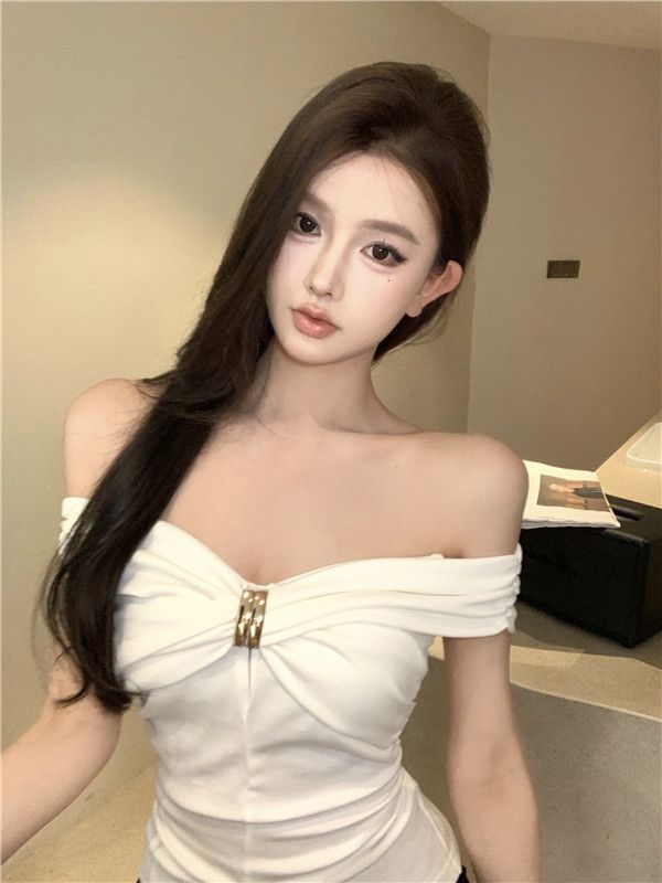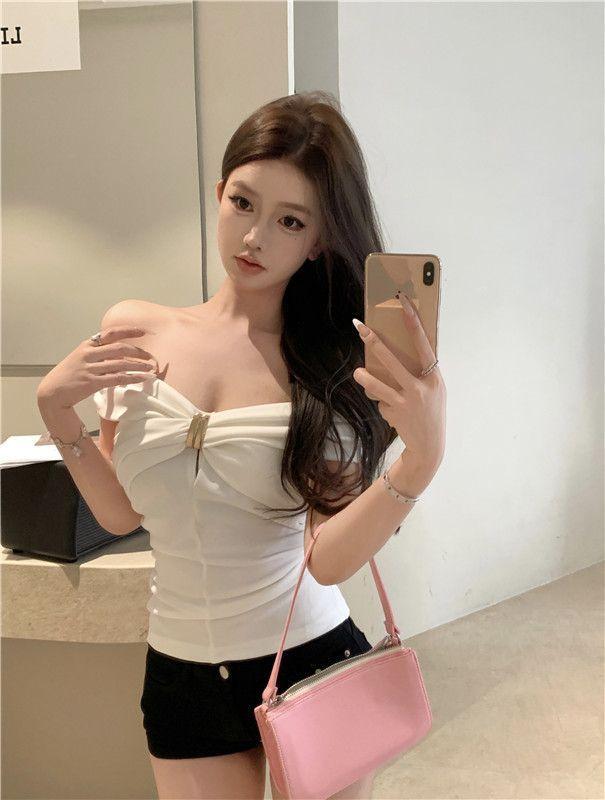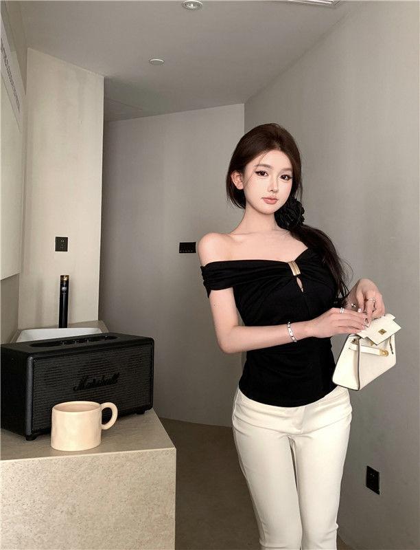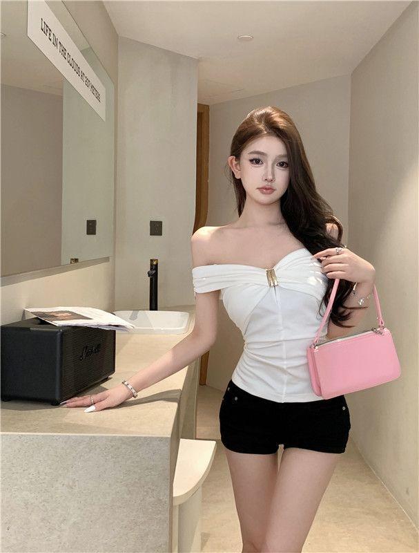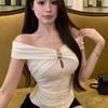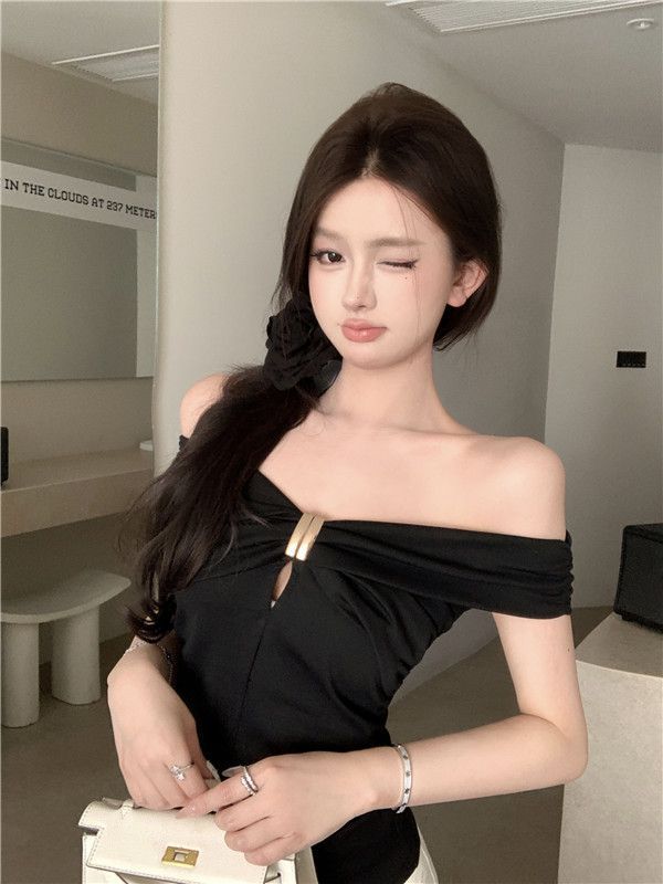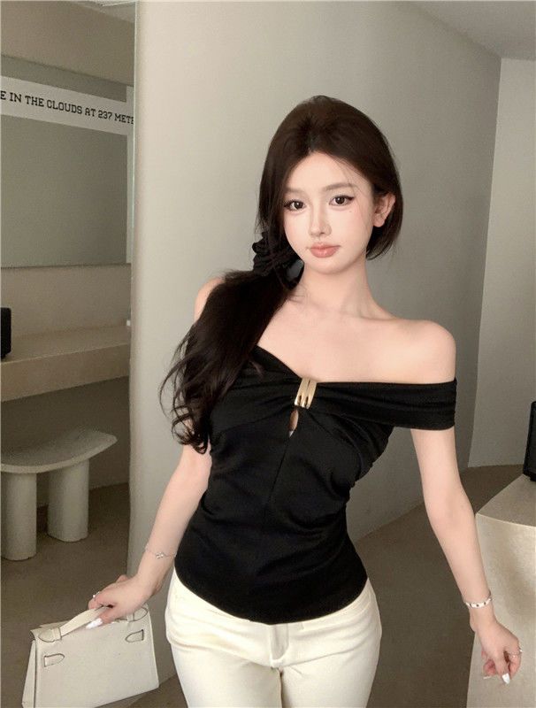 Top coreano de un hombro para mujer, diseño de verano, look adelgazante, chica sexy sexy, camiseta de hombros descubiertos de puro deseo