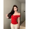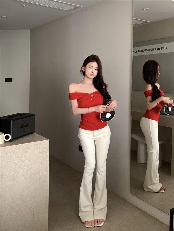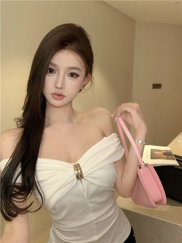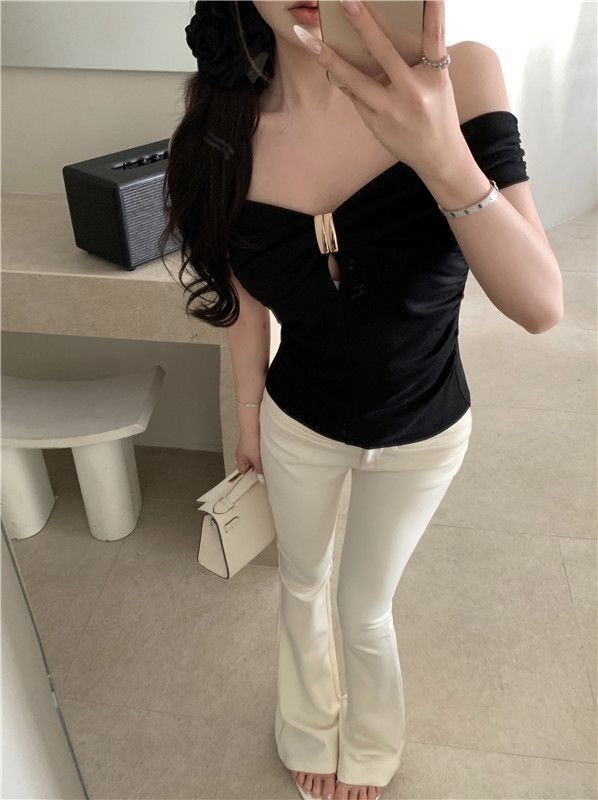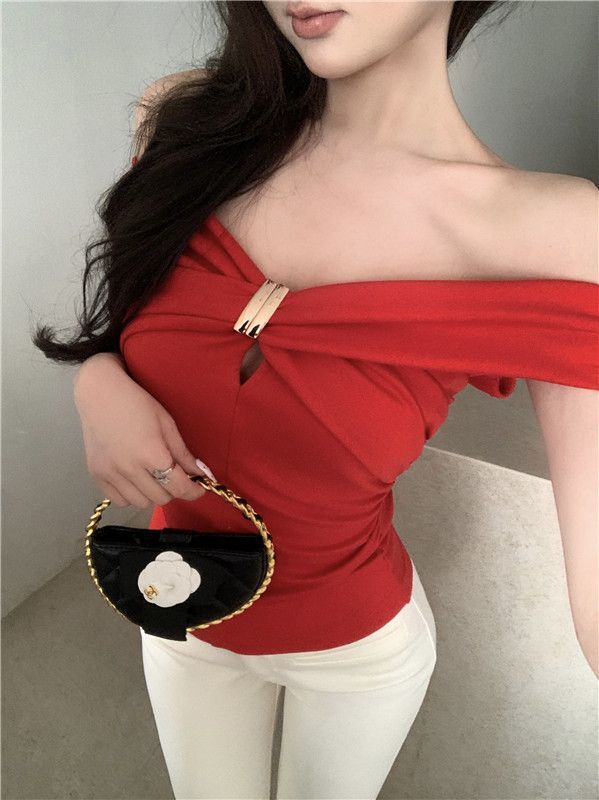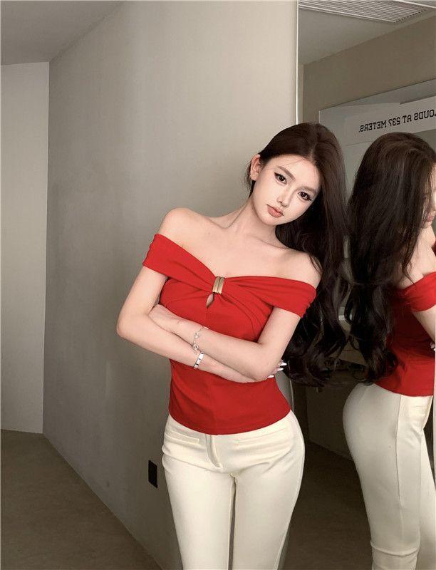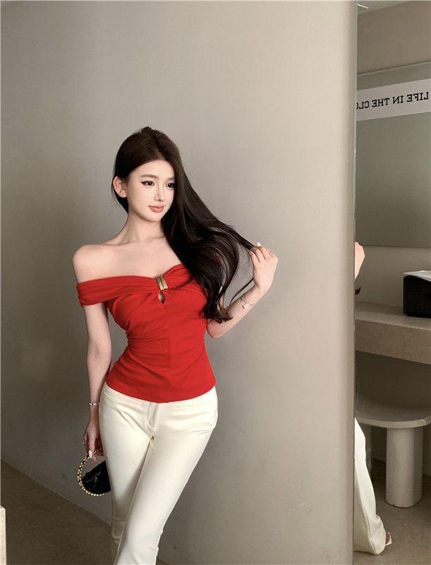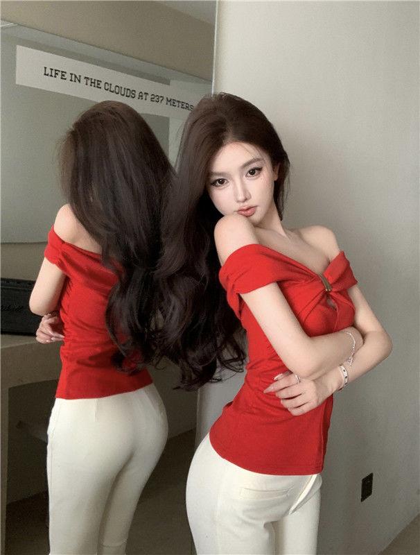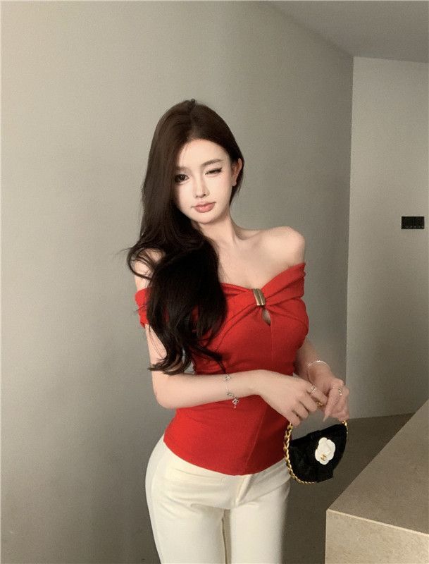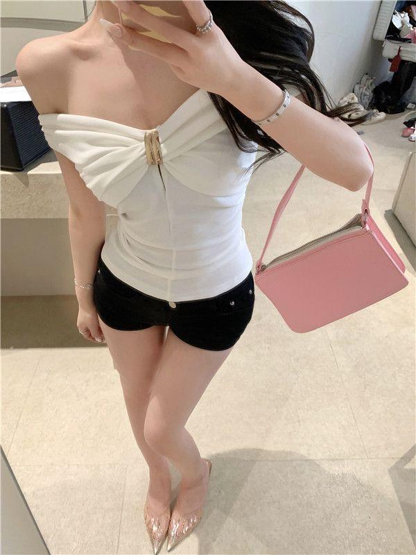 Top coreano de un hombro para mujer, diseño de verano, look adelgazante, chica sexy sexy, camiseta de hombros descubiertos de puro deseo