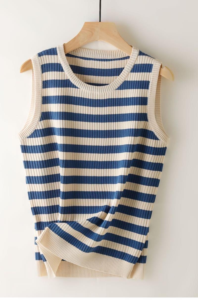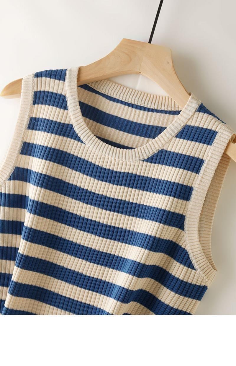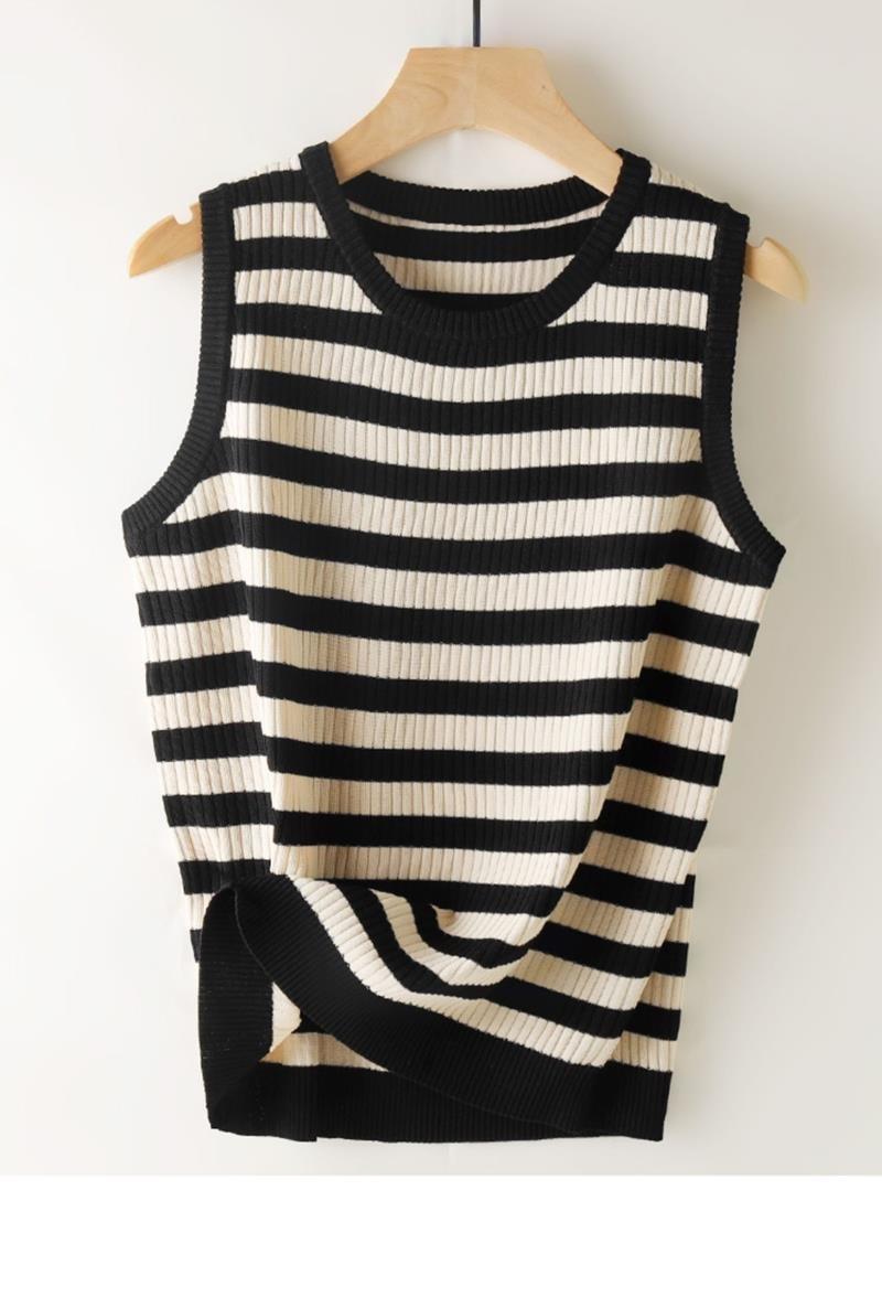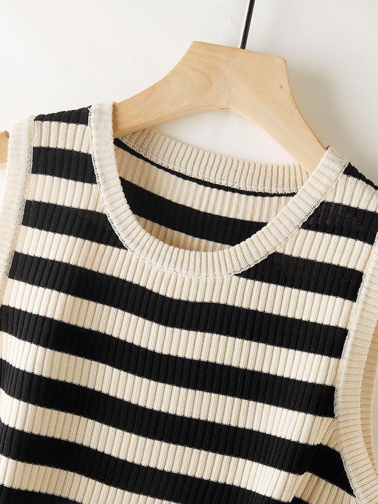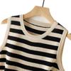 Camisola de mujer suelta de primavera y verano con cuello redondo de seda helada de punto a rayas combinable informal sin mangas de calle