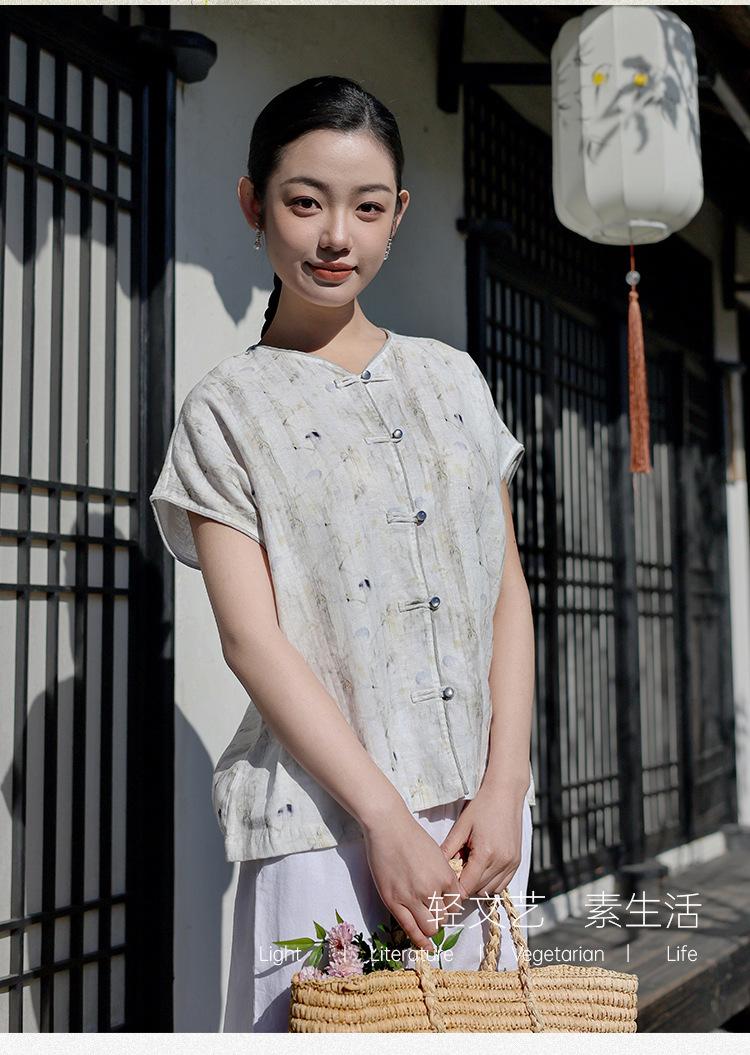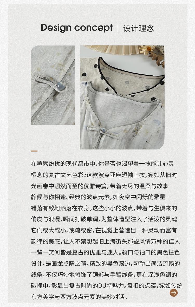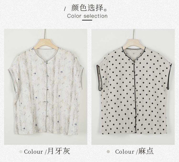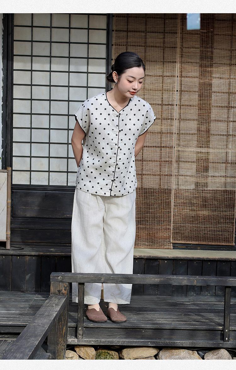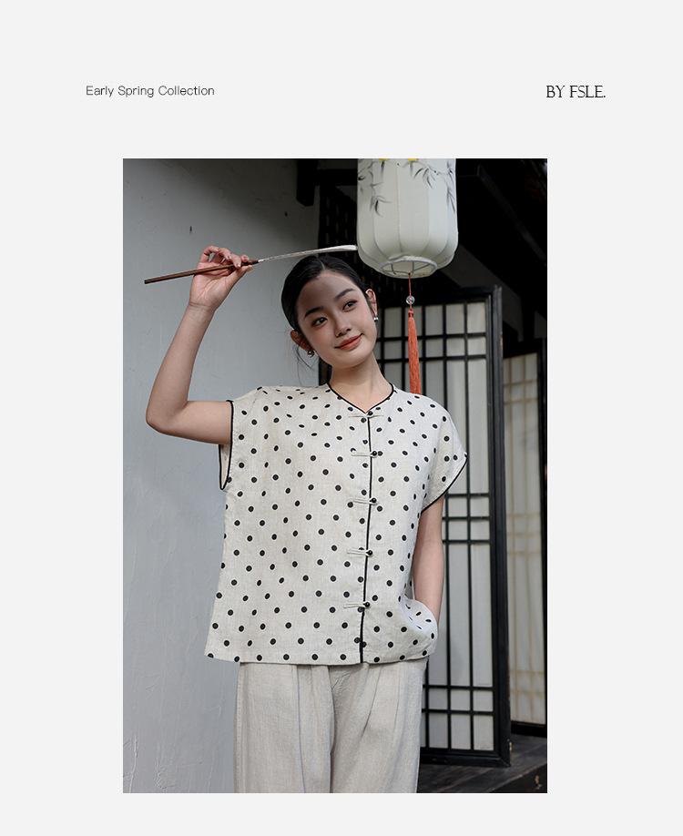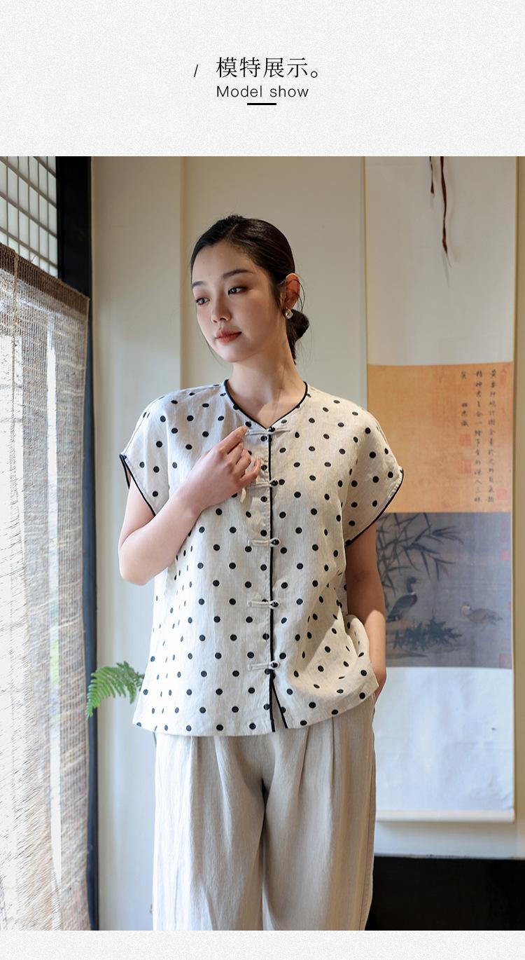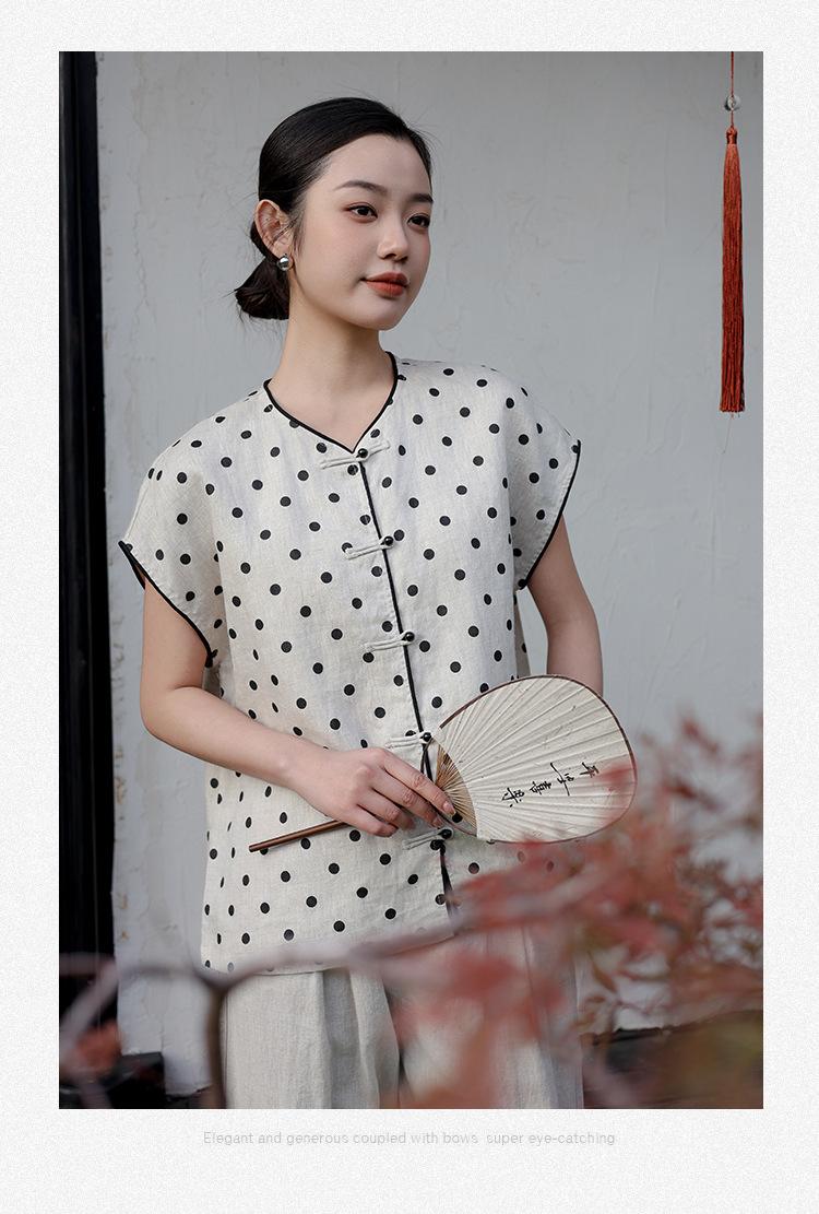 Nuevo Verano 2025 para Mujer Chino Nuevo Lino Manga Corta Top Polo para Mujer Lunares Cuello en V Cárdigan Diseño Sentido Camiseta Venta al por Mayor