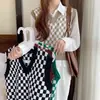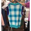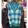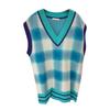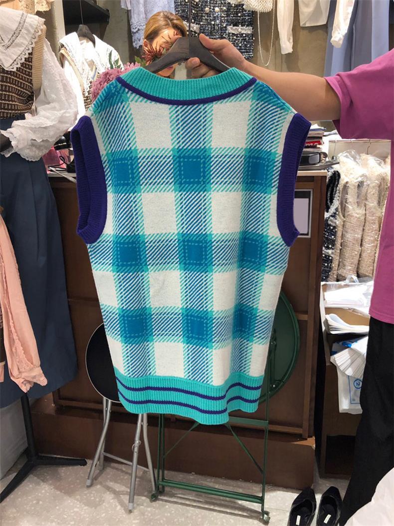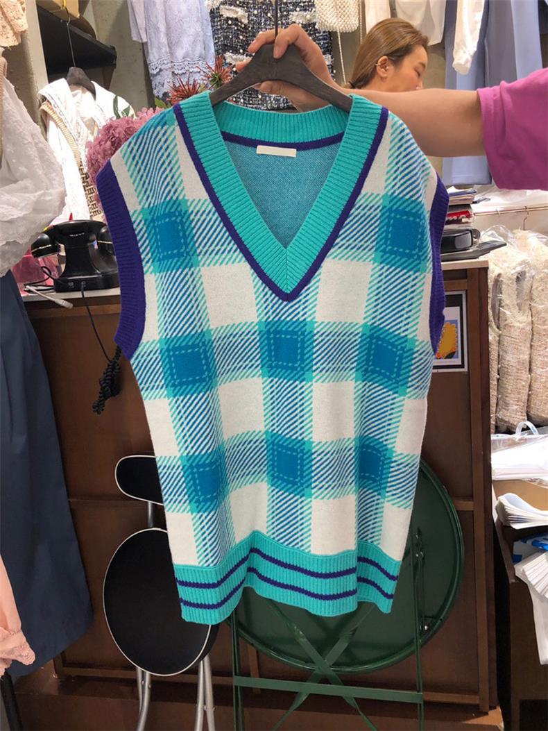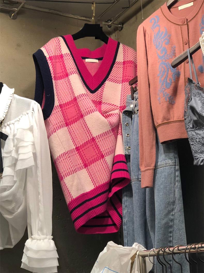 2025 Otoño e Invierno Nuevo Estilo Coreano para Mujer Suelto Casual Moda Cuadros Cuello en V Sin Mangas Chaleco Tejido Rosa