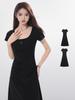 Vestido Negro de Cuello Cuadrado y Manga Corta para Mujer Verano Estilo Francés Adelgazante Línea A Vestido Largo Estilo Hepburn Vestidito Negro