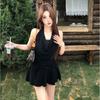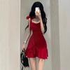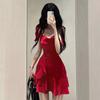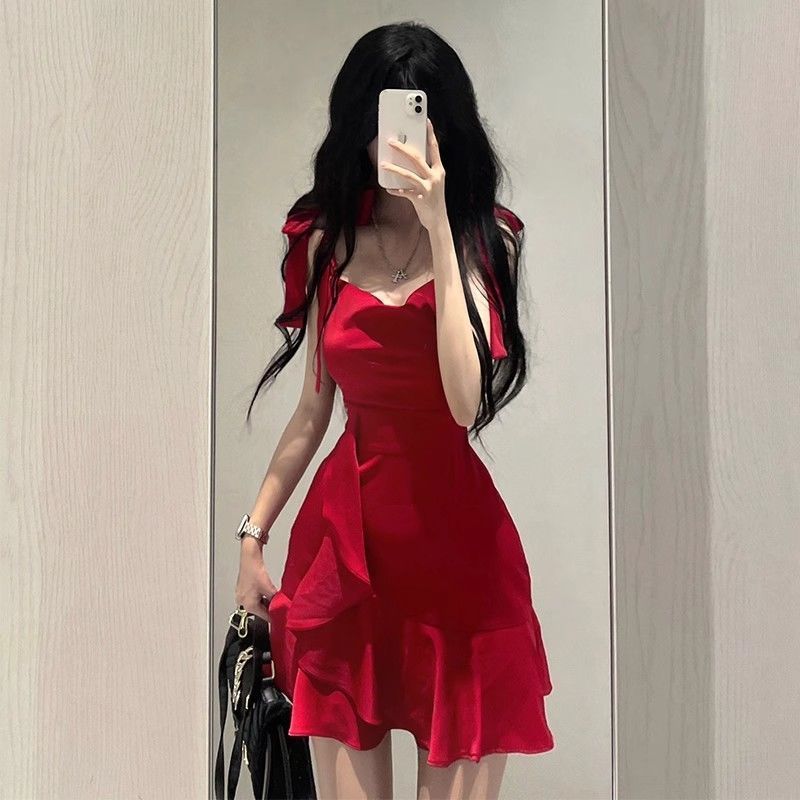 Nuevo Vestido Elegante de Hoja de Loto Rojo con Tirantes para Chica Caliente Pequeño Verano Deseo Puro Falda Adelgazante de Cintura para Mujer