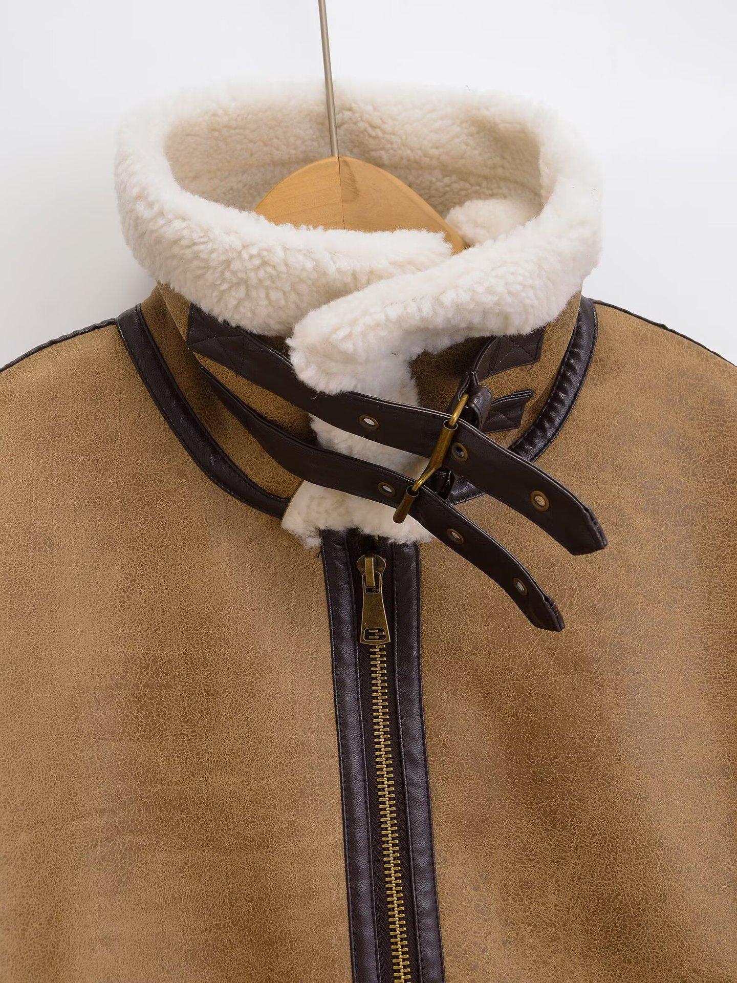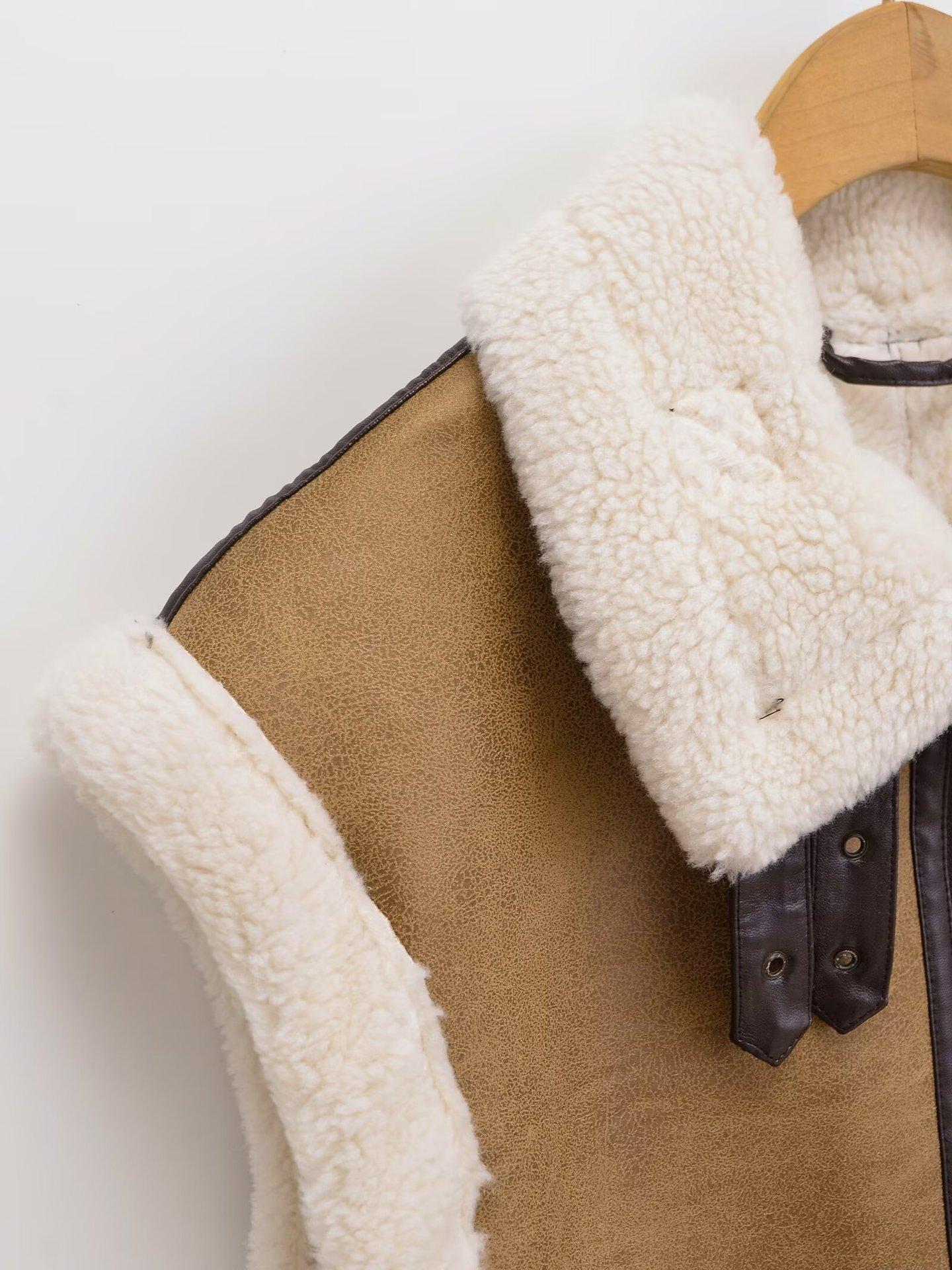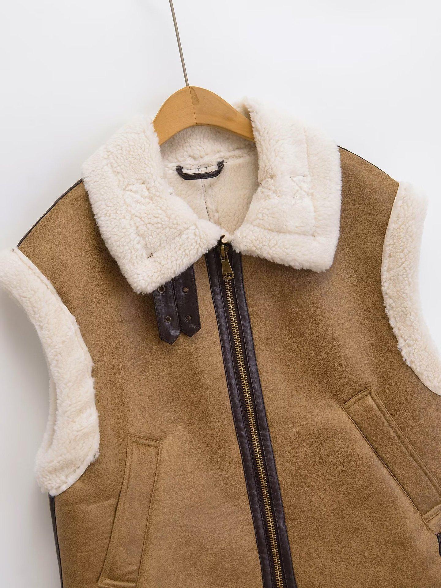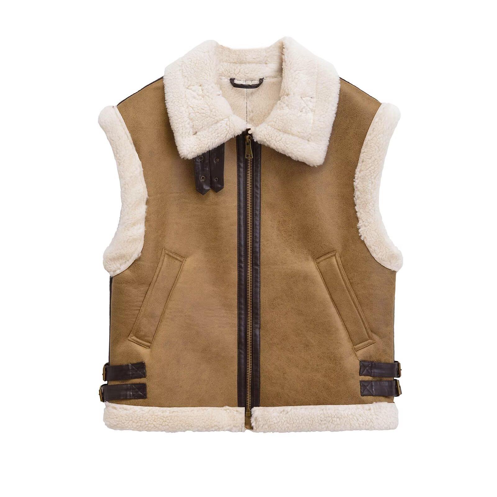 Amazon Otoño e Invierno Nuevo Abrigo Chaleco de Piel Uno Retro Lana de Cordero Suelto Cierre de Cremallera Gamuza Exterior Engrosado