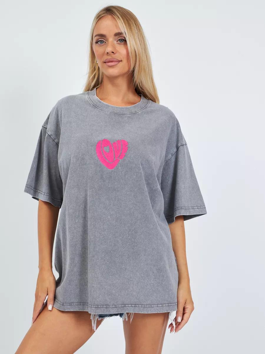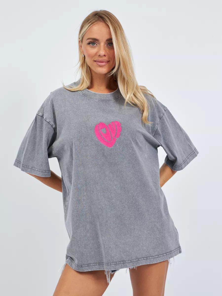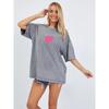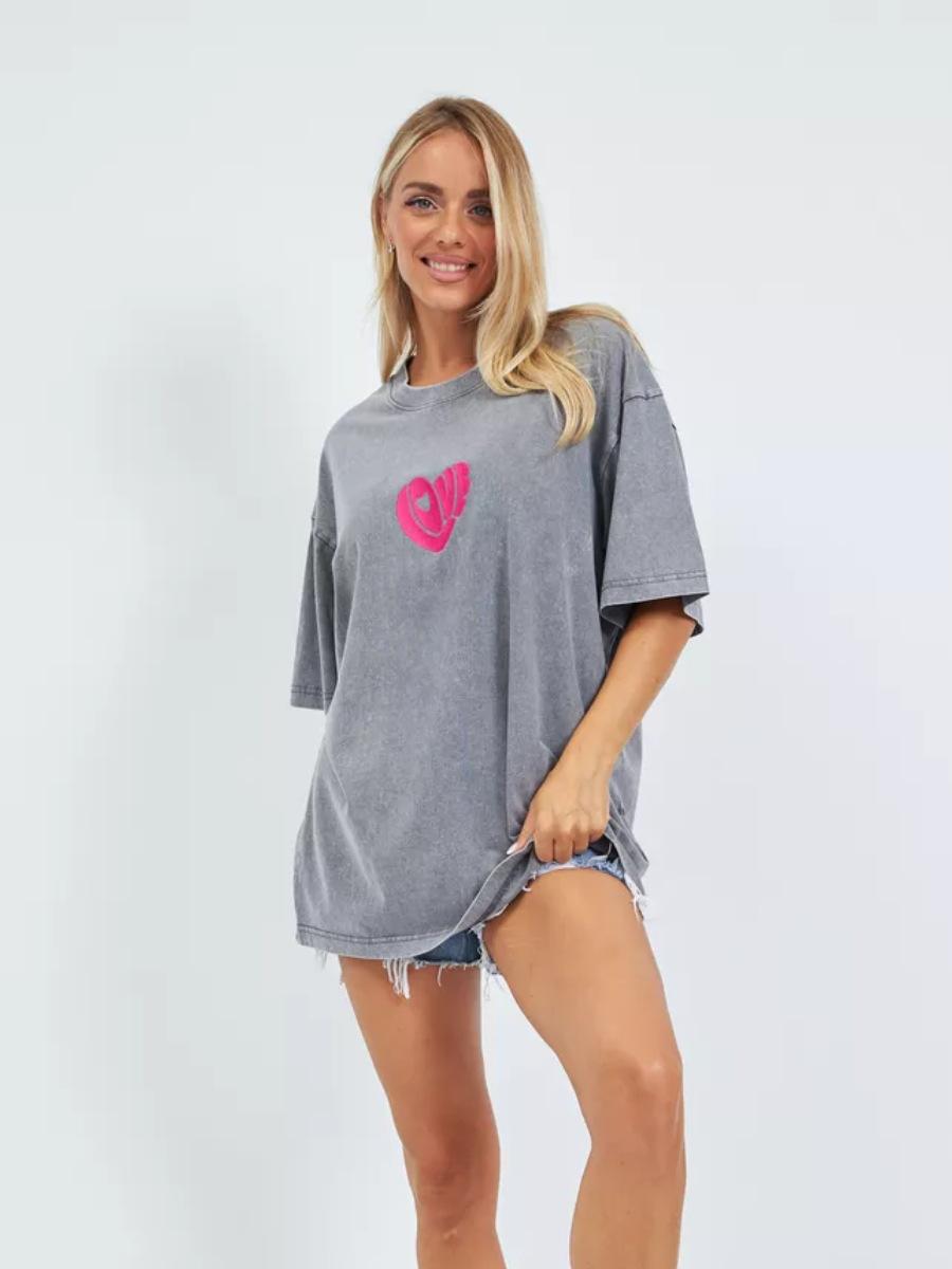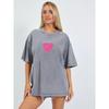Top Casual Sencillo de Corazón Estampado Vintage Lavado Gris Estilo Americano Oversized Suelto Versátil Perezoso