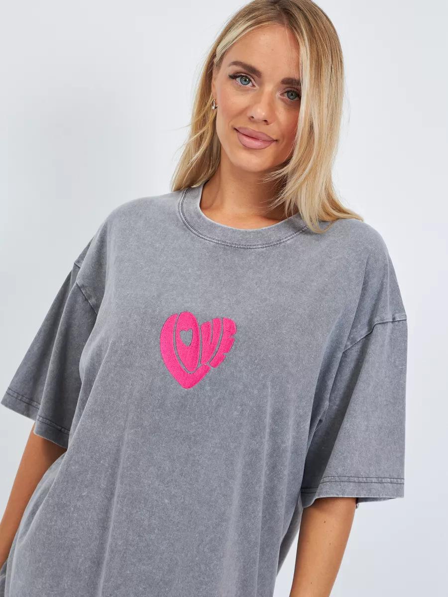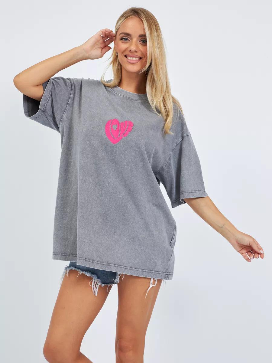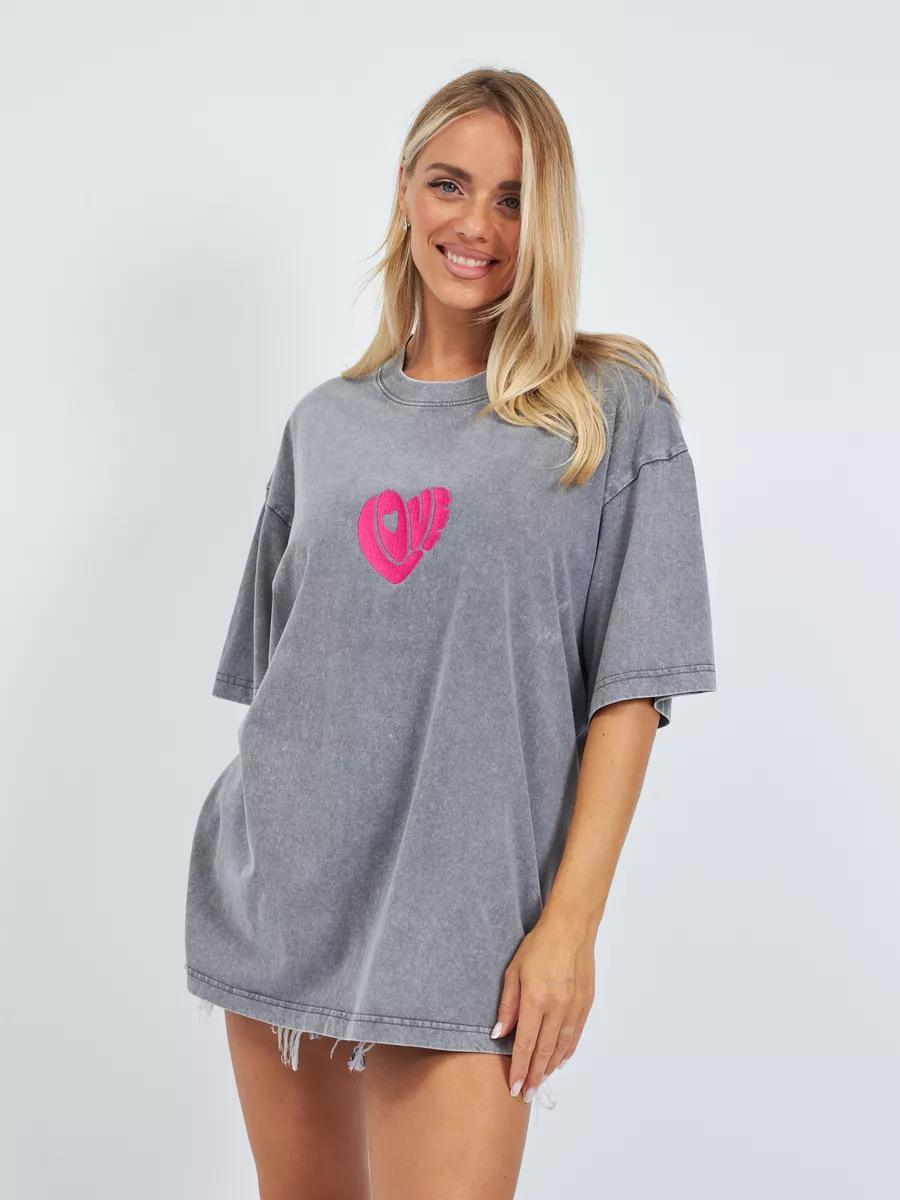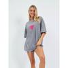 Top Casual Sencillo de Corazón Estampado Vintage Lavado Gris Estilo Americano Oversized Suelto Versátil Perezoso